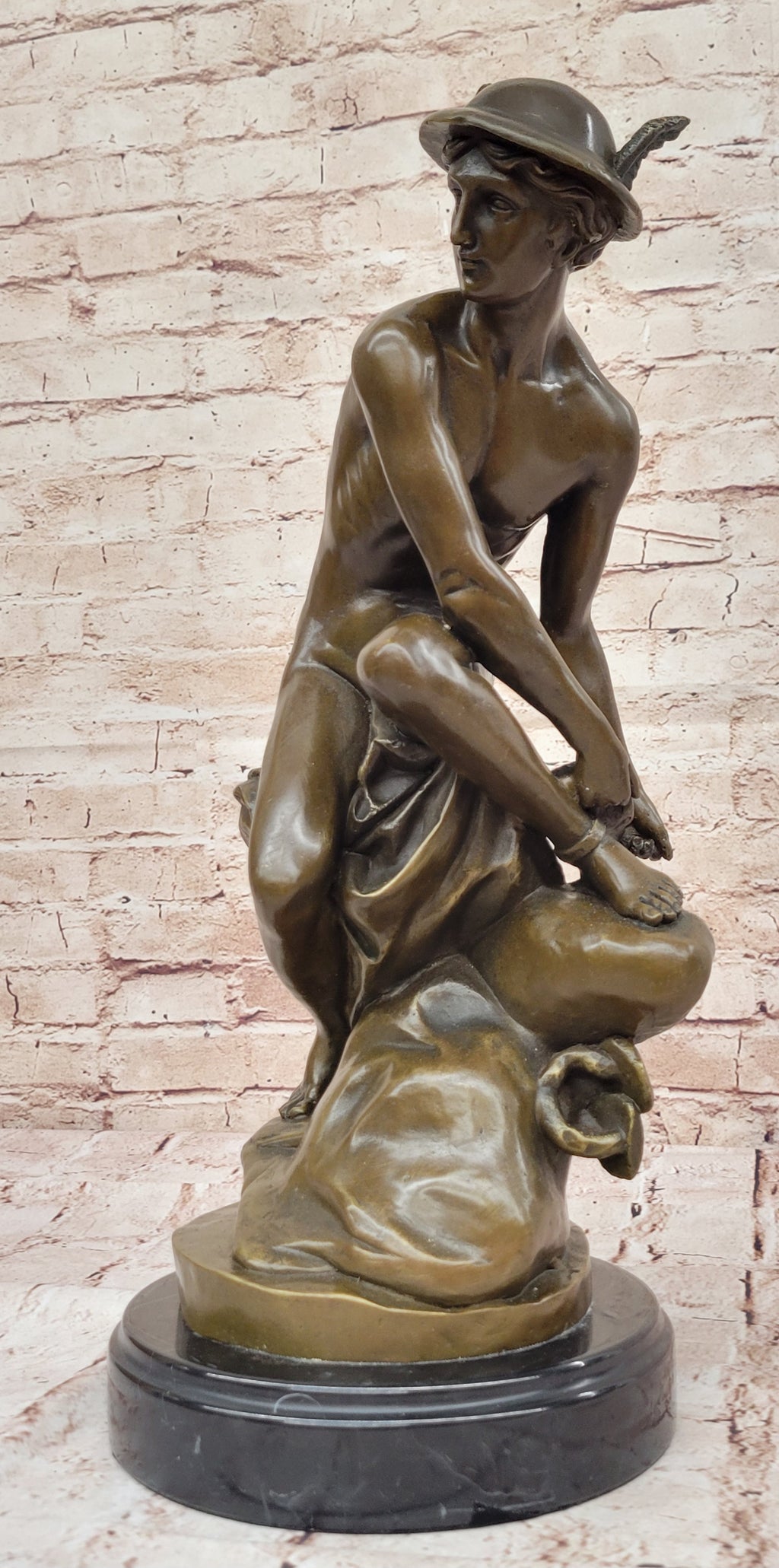 Mercury, also revered as the god of commerce, cunning, and invention, is depicted with meticulous detail in this sculpture. Cast using the ancient method of lost-wax casting, the piece is stained with a brown patina finish for preservation. The artist's craftsmanship shines through in the intricate rendering of Mercury's attire and the dynamic composition of the piece.
