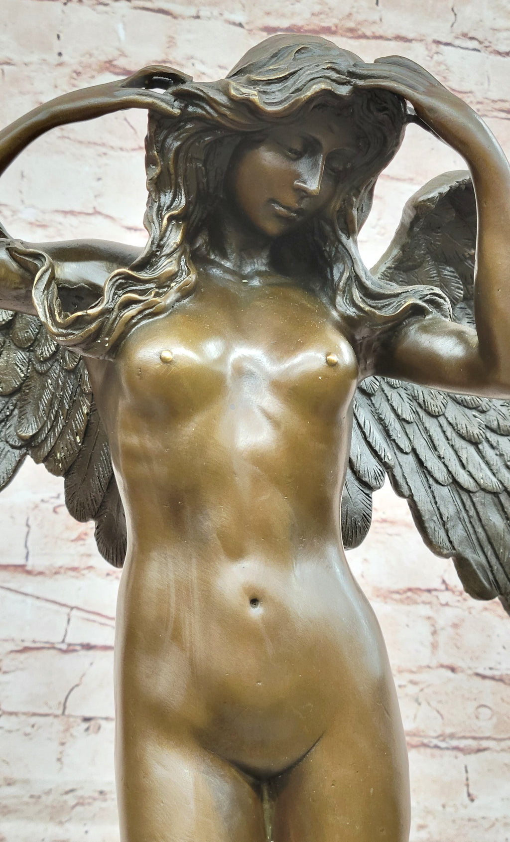 Experience the elegance and artistry of Adolph A. Weinman with this “Night Descending” bronze sculpture, a handcrafted masterpiece celebrating the beauty and grace of the female form. This captivating piece portrays a stunning nude angel, her head gracefully tilted as she runs her fingers through cascading waves of hair. Exquisite wings span behind her, and the delicate curves of her body exemplify femininity, poise, and ethereal charm. Signed by A.A. Weinman, this sculpture guarantees authenticity and collector value.