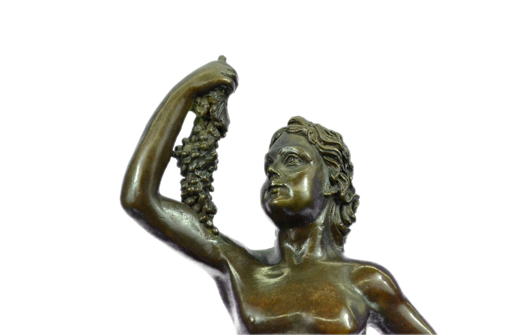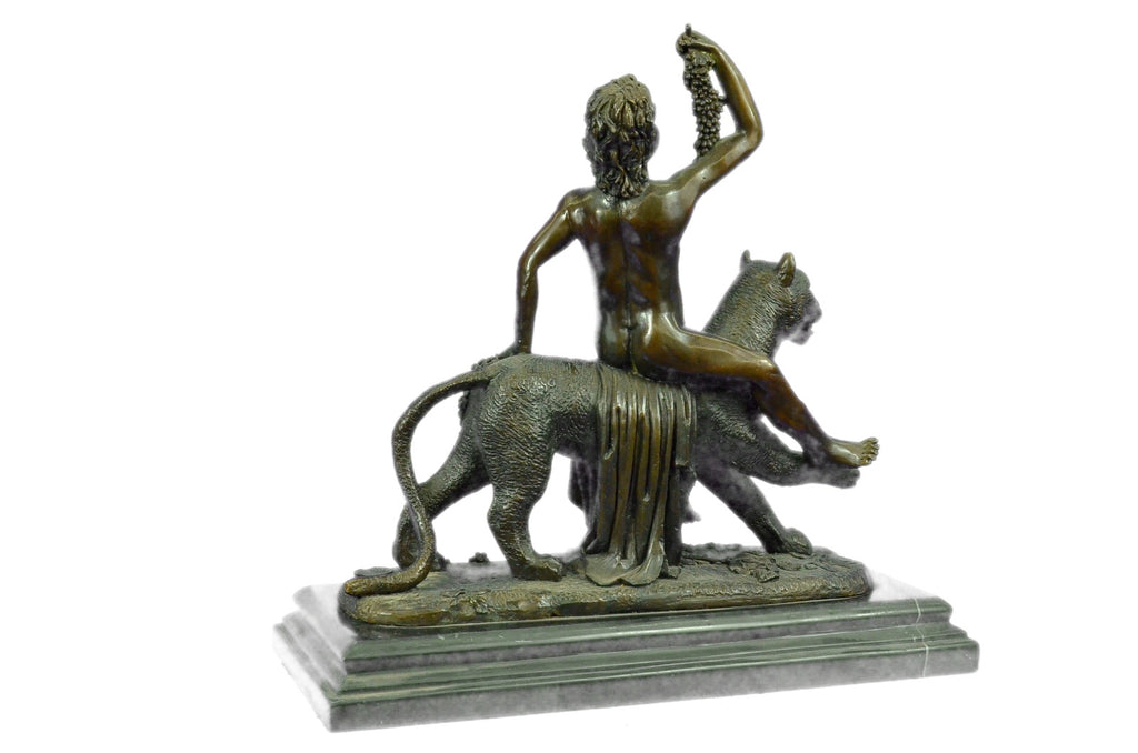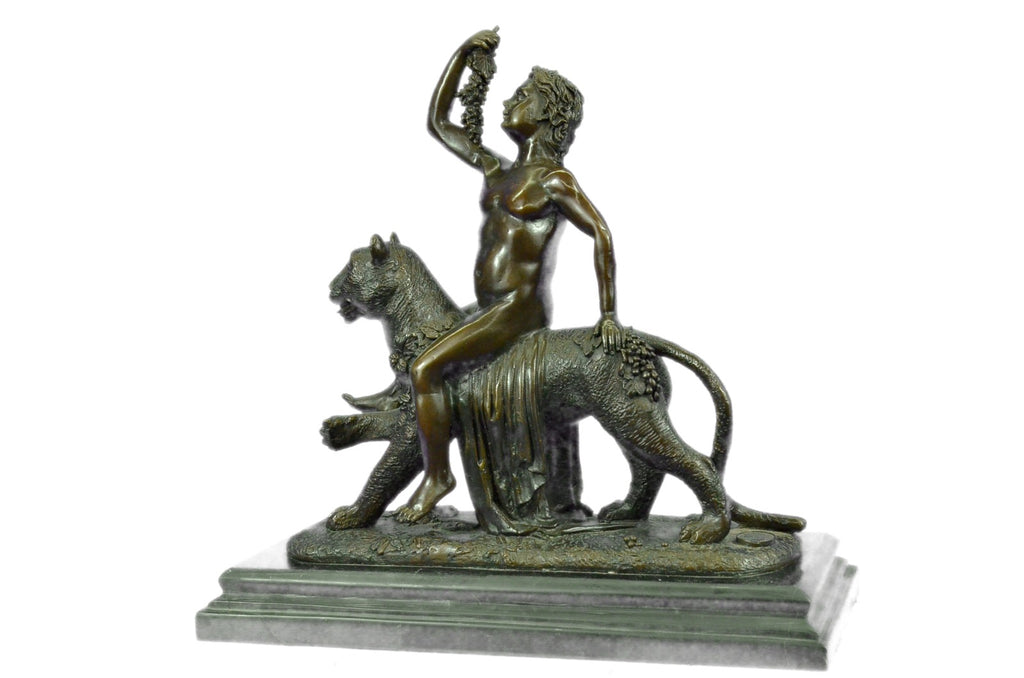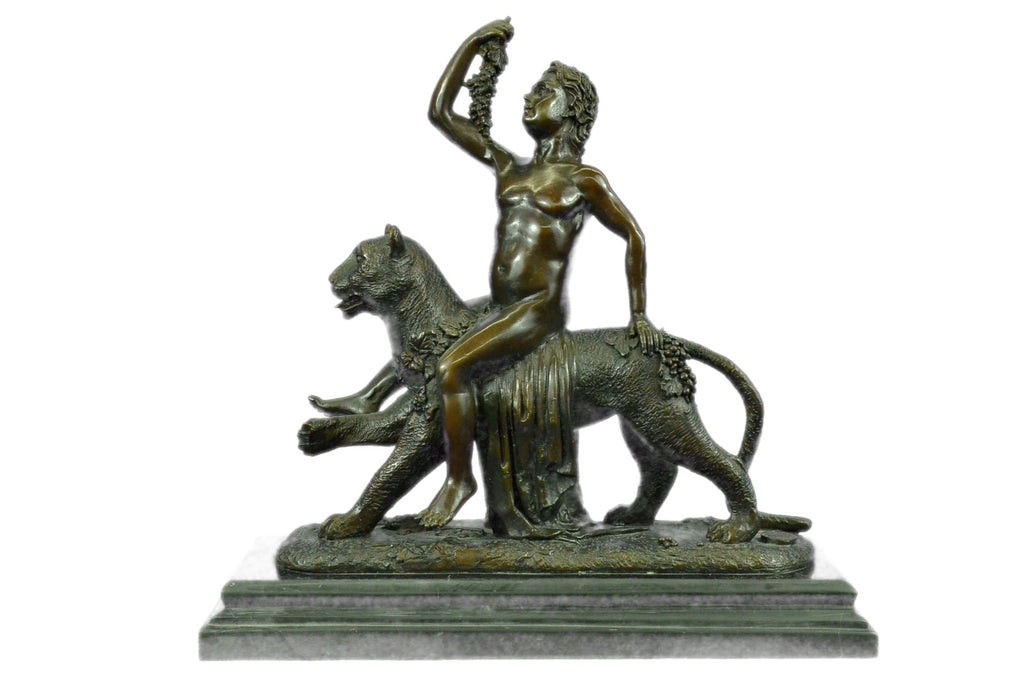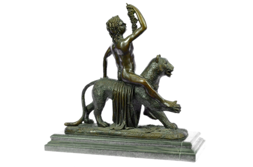 This is a bronze sculpture of the wild child Mowgli, enjoying the bounty of the jungle upon his trusted friend, Bagheera. Mowgli is a fictional character from India who originally appeared in Rudyard Kipling`s short story "In the Rukh" and then went on to become the most prominent and memorable character in his fantasies The Jungle Book and The Second Jungle Book (1894–1895). In the book The Jungle Book, Bagheera was a panther who was portrayed as a clever, serious and a responsible character. In the film, it is Bagheera and not the wolves who first finds Mowgli, a young village child and he is the one who takes him back to the village. Bagheera spoiled Mowgli more and protected him from the dangers of the jungle. The 100% handmade bronze sculpture, was cast using the early method of lost-wax casting and stained with a brown patina finish for preservation. The black marble base has the European Bronze Finery stamp ensuring quality and the artist Aldo Vitaleh`s signature.