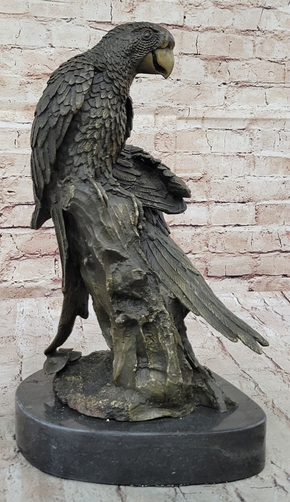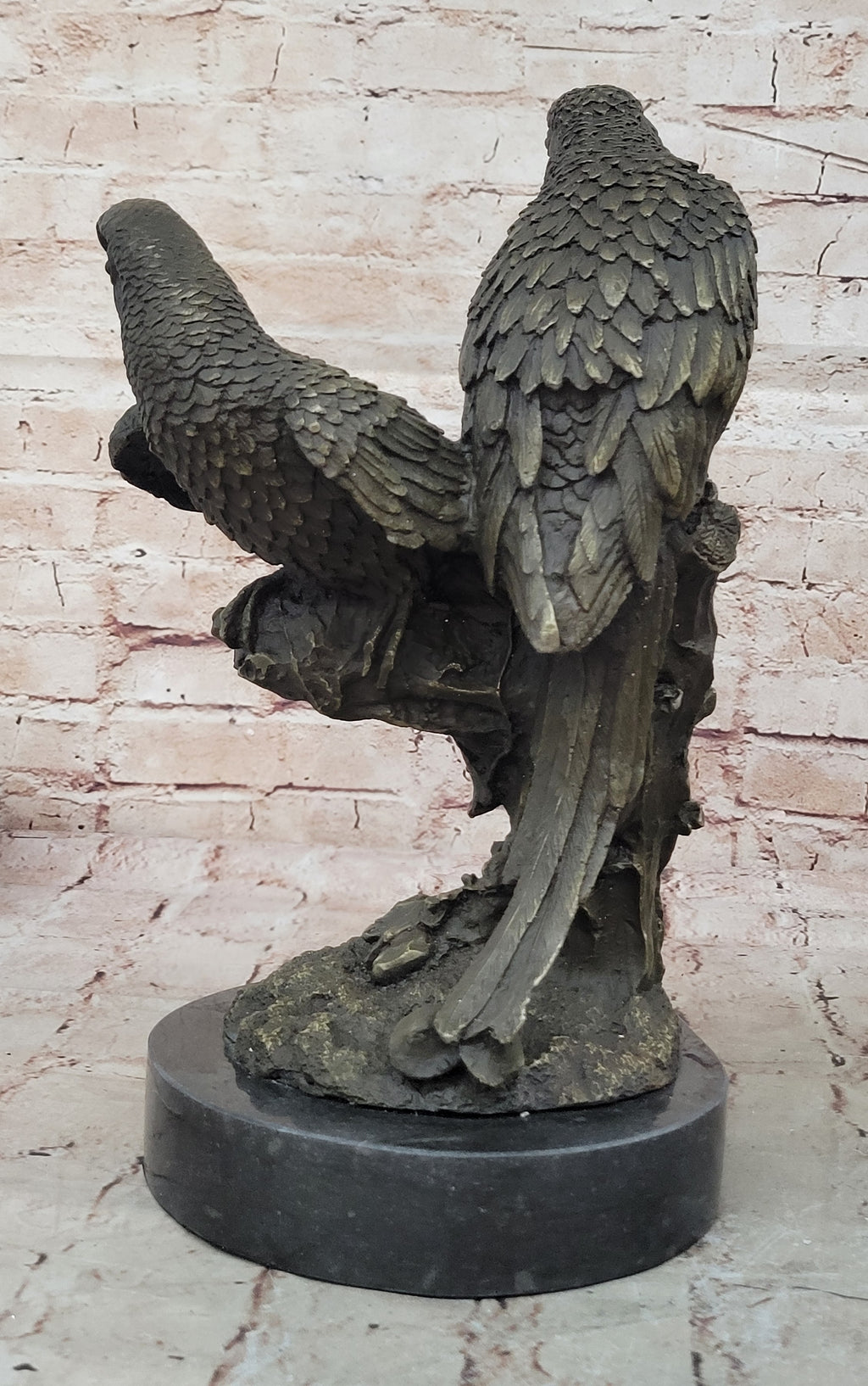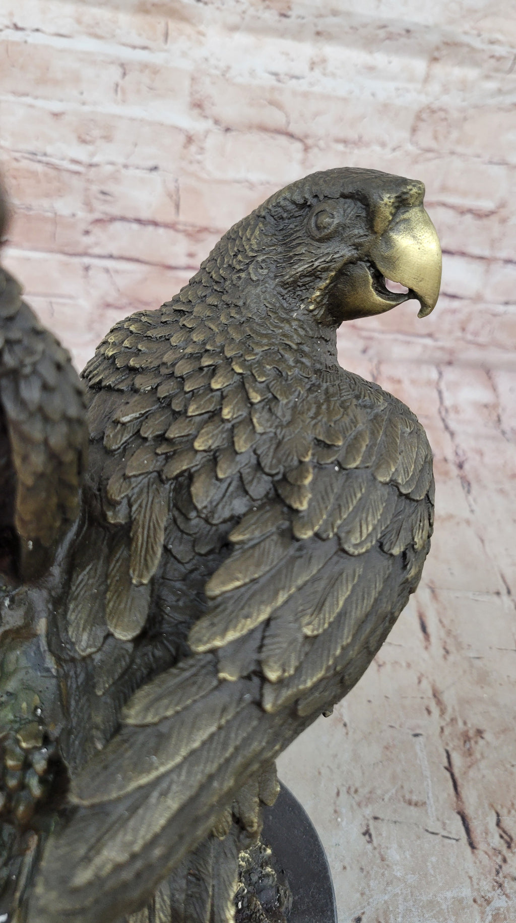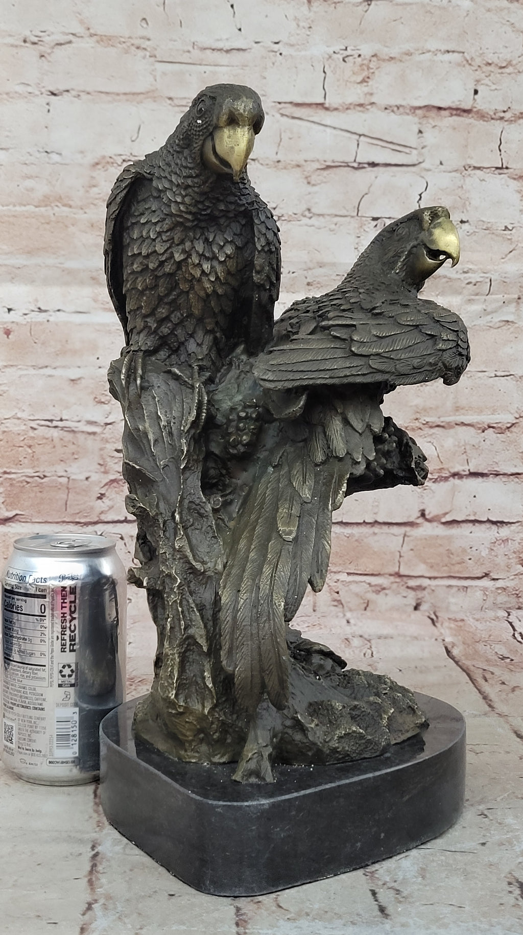 The inseparable duo perches atop a tree trunk, their bond evident in every chirp and glance exchanged. Their love is depicted as unconditional, a source of inspiration for those who appreciate the loyalty and companionship found in the animal kingdom. As they relax, contemplating their next flight, the sculpture invites viewers to share in the serenity of their moment. Crafted using the meticulous "Lost Wax Method," this sculpture ensures top-notch detail and quality, capturing the individuality of each feather and the dynamic expressions of the parrots with unparalleled precision.