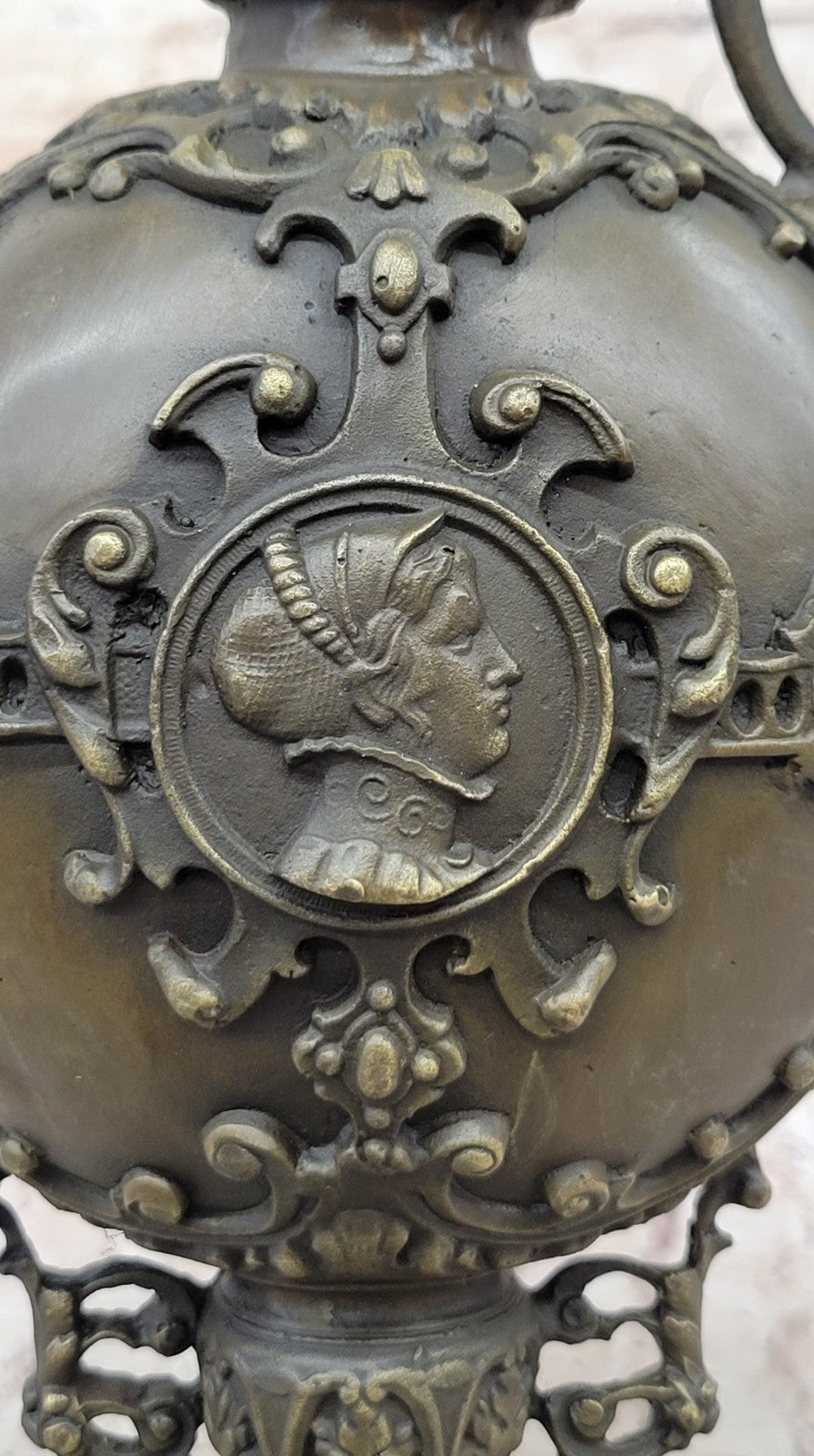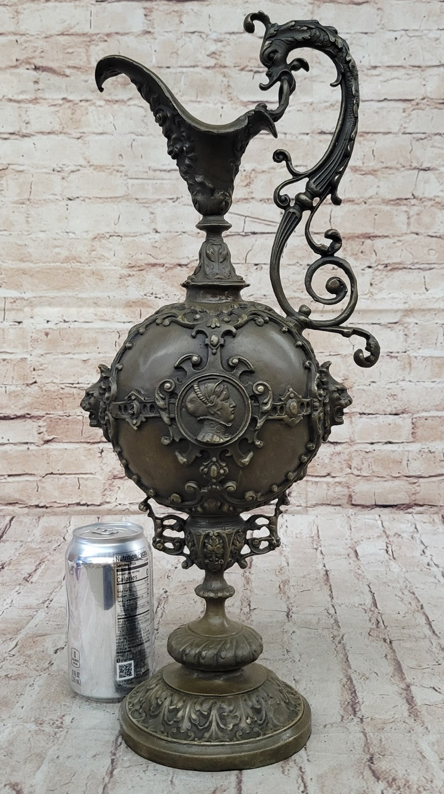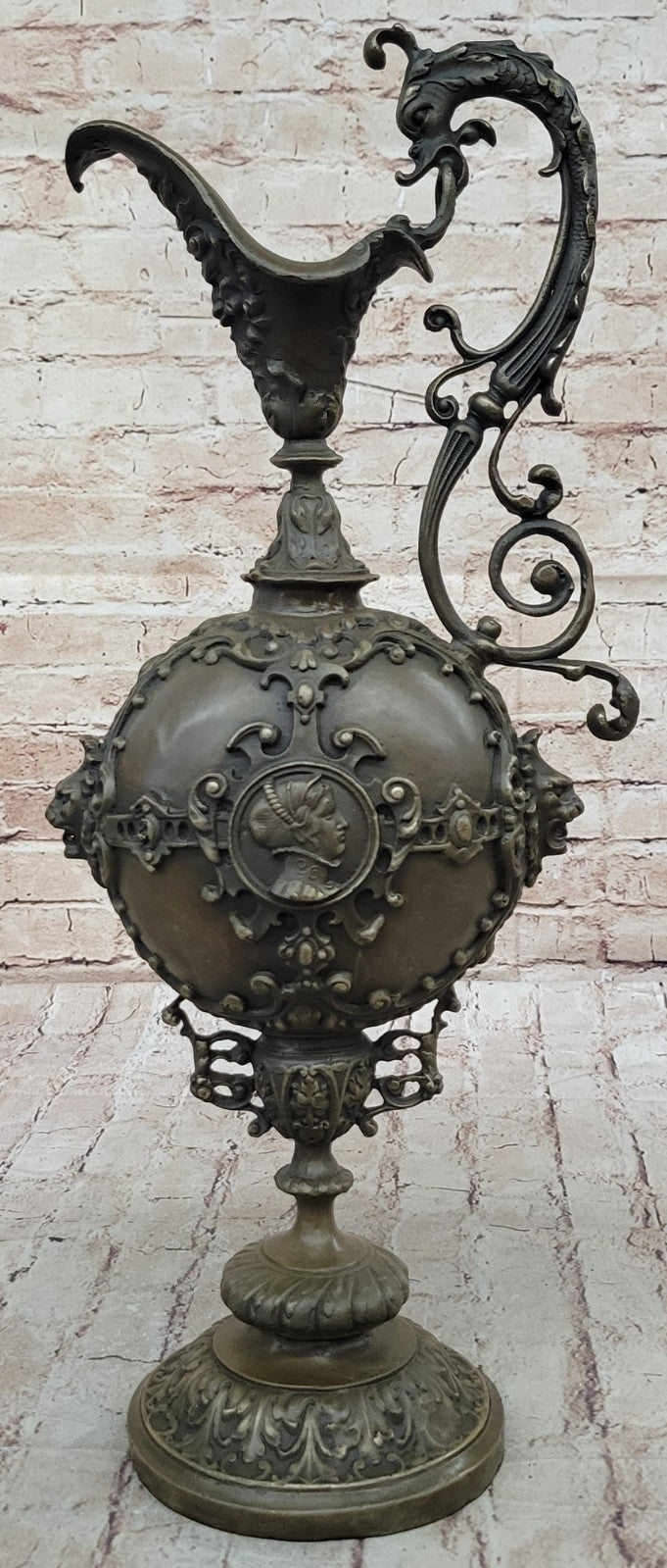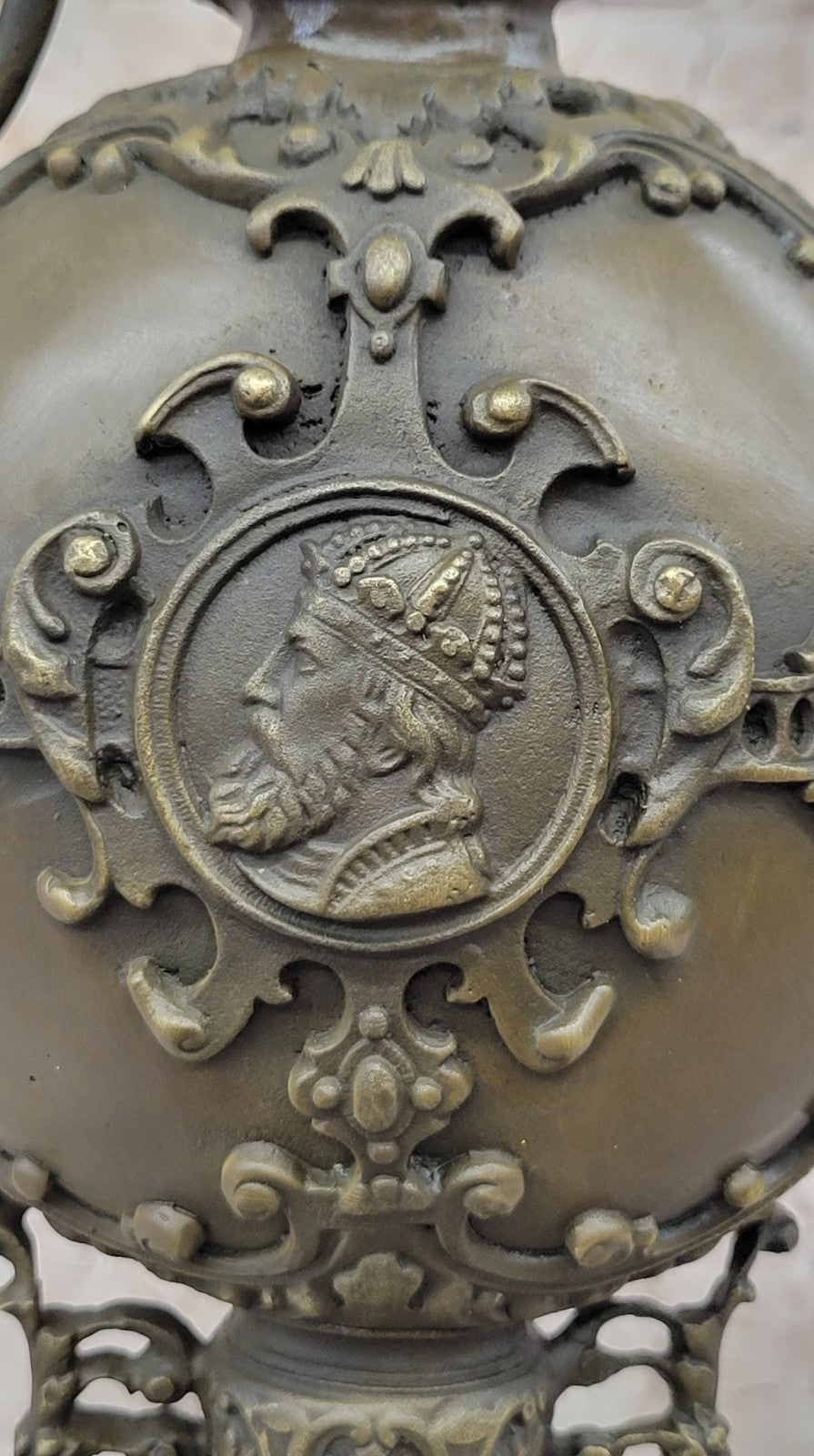 Add a regal touch to your decor with this stunning decorative bronze piece. Modeled after a vase, it features an elegant spout and an intricate swirl pattern that runs down its body, culminating in a majestic base. But what truly sets this piece apart is its ornate detailing. On one side, you'll find a beautifully sculpted head of a bearded king wearing a crown, while the other side features the head of a queen. The sides of the piece are adorned with fierce lion's heads, and the spout is topped with the grinning face of a bearded man.