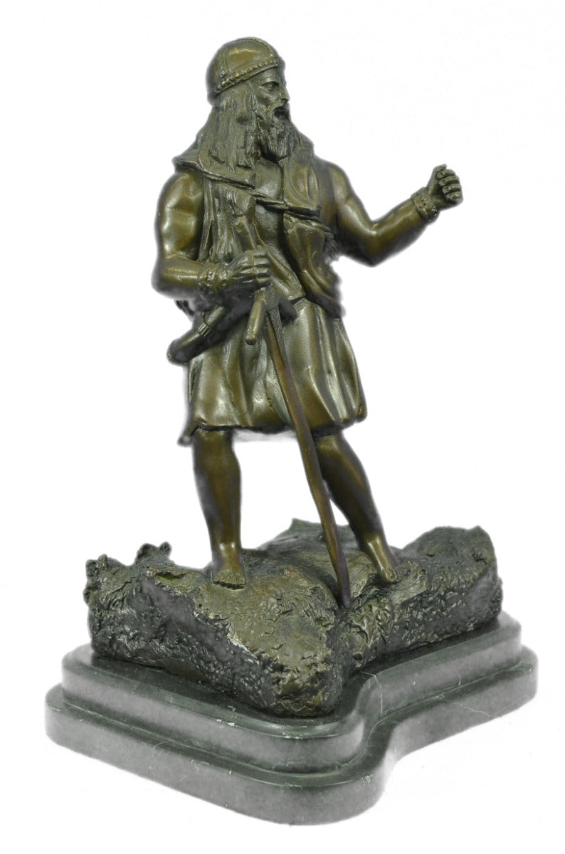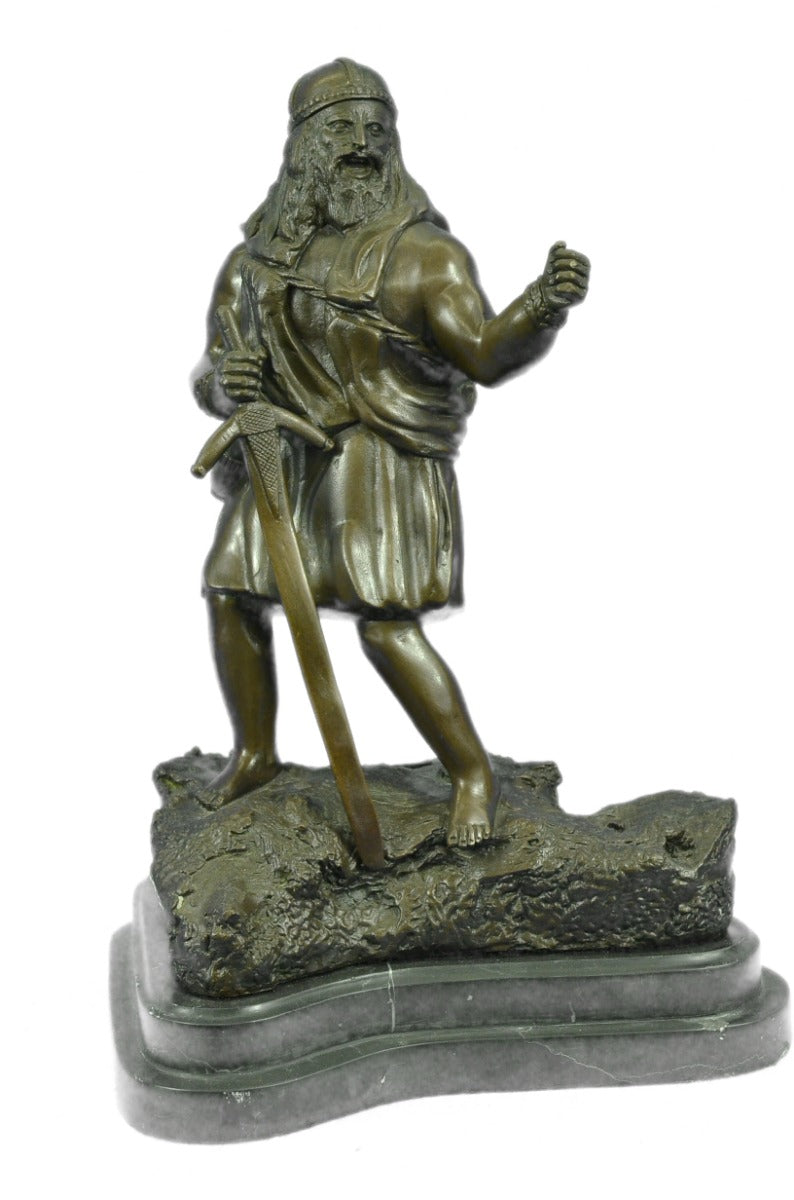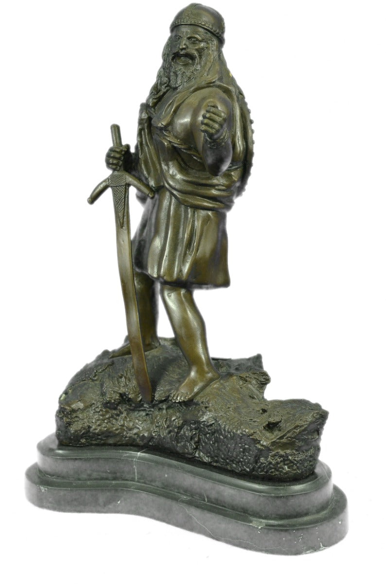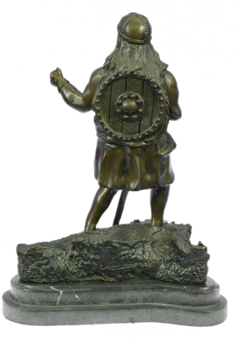 A simply dressed Viking warrior, a Freemen, dressed more modestly unable to afford the heavy army that comes with greater wealth. He is a warrior no less, able to use is fighting savvy, brute strength, and sword to overcome his opponents in battle. This warrior holds his fist in a fit of triumph and rage as he shouts out. His sword is held firmly in his other hand and his hand-built wooden shield slung across his back. This 100% bronze sculpture was crafted using the lost wax method. It stands on a thick black marble base. It is signed Chris Miles.