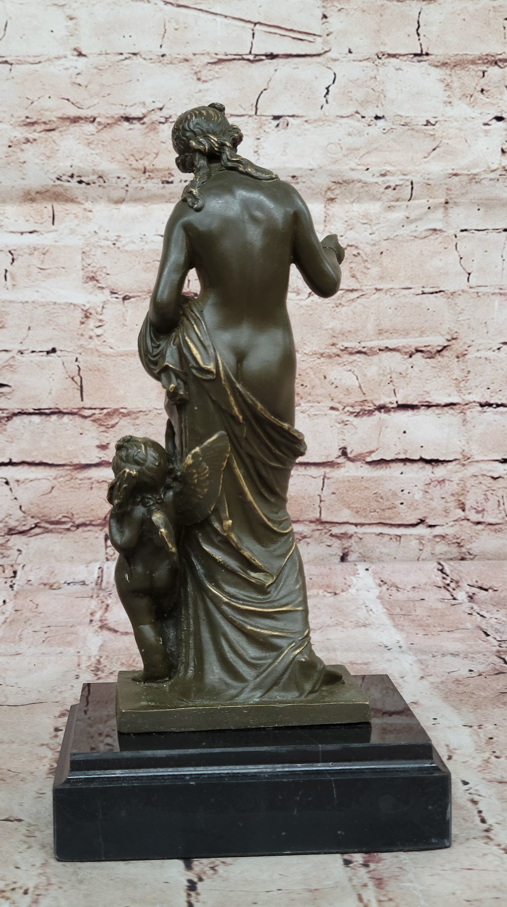 Signed by Jean Patoue, the sculpture is securely mounted on a polished black marble base, offering a striking contrast and a touch of sophistication. This captivating piece is perfect for lovers of classical mythology, fine art, or those looking to add a romantic and elegant focal point to their space.