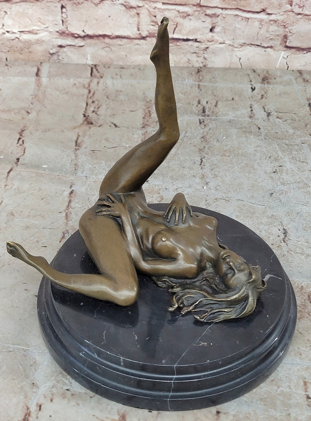 Introducing a mesmerizing bronze sculpture that beautifully captures the sensuality and allure of the female form. The piece features a captivating seductress reclining on the ground, her body enveloped in a palpable fervor of desire. Her face is a picture of ecstasy, an expression that transcends boundaries and draws the viewer into a world of heightened passion and intimacy.