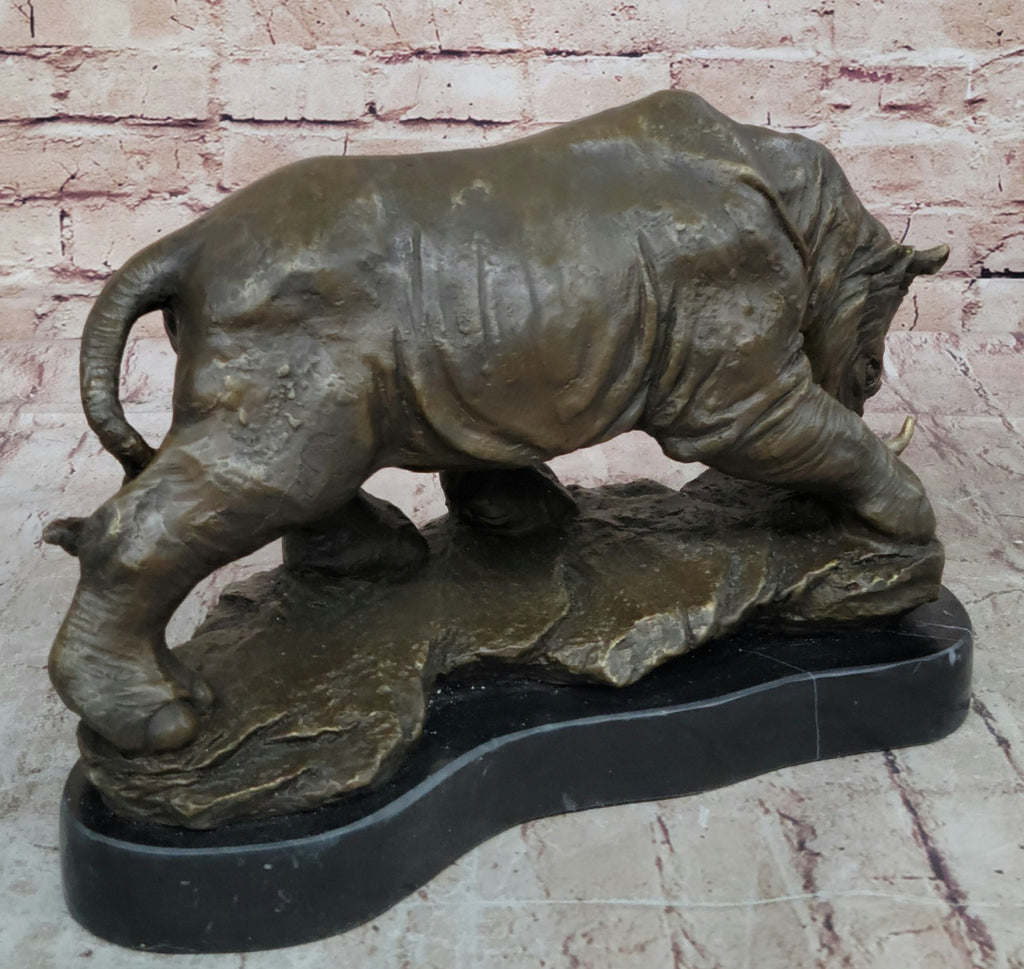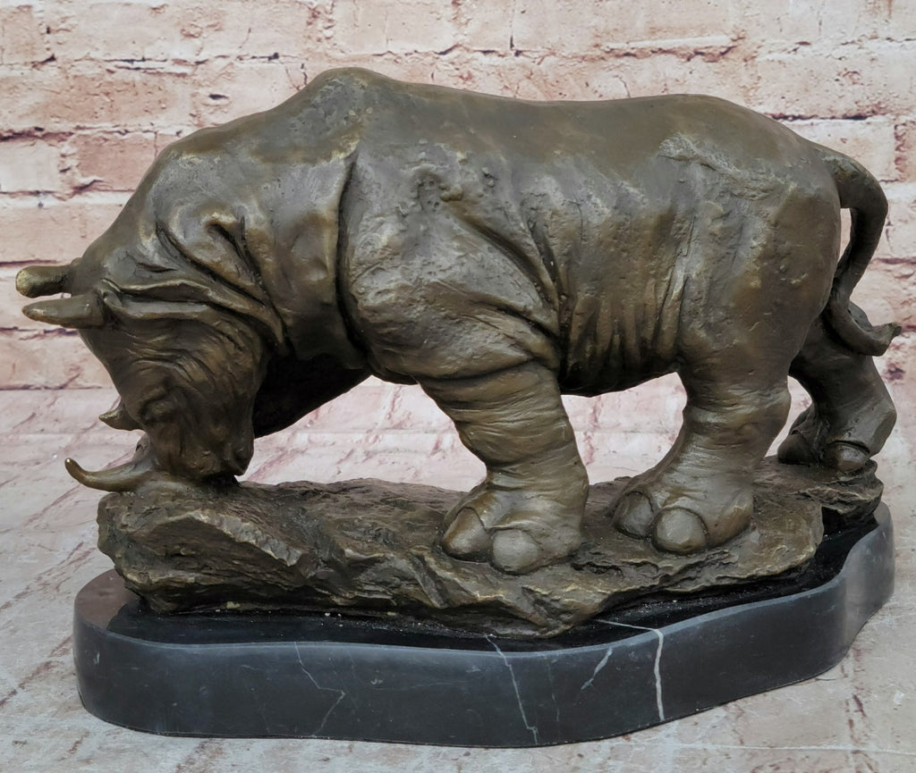 Mounted on a sleek black marble base, carefully shaped to resemble the form of the underlying rock, this sculpture achieves a harmonious blend between the rhinoceros and its natural habitat. The choice of black marble adds a touch of sophistication to the overall presentation, highlighting the sculpture's timeless appeal. With the artist's signature, Milo, this masterpiece bears the mark of authenticity and is a testament to the artist's talent and dedication.