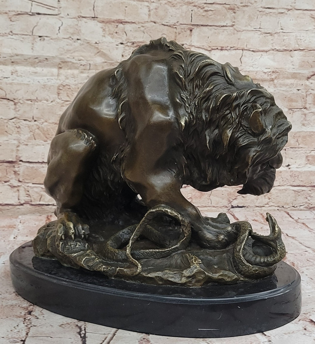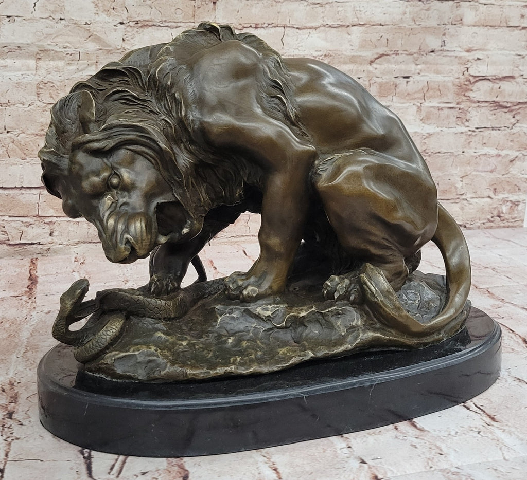 Every intricate detail, from the lion's magnificent mane to the texture of the serpent's scales, has been meticulously captured in bronze using the traditional lost-wax casting technique. The craftsmanship of this sculpture is truly remarkable, showcasing the skill and artistry of the sculptor. Finished with a rich brown patina, the sculpture not only enhances its visual appeal but also ensures its long-lasting quality.