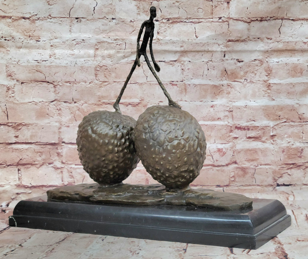Created using the age-old "Lost Wax Method," this 100% bronze sculpture preserves the essence of the strawberry and the walking figure with a rich brown patina finish. The sculpture is elegantly placed on a variegated green marble base, adding a touch of sophistication to the overall presentation. To further authenticate its origin and value, the sculpture bears the signature of the artist himself, Gia Cometti.