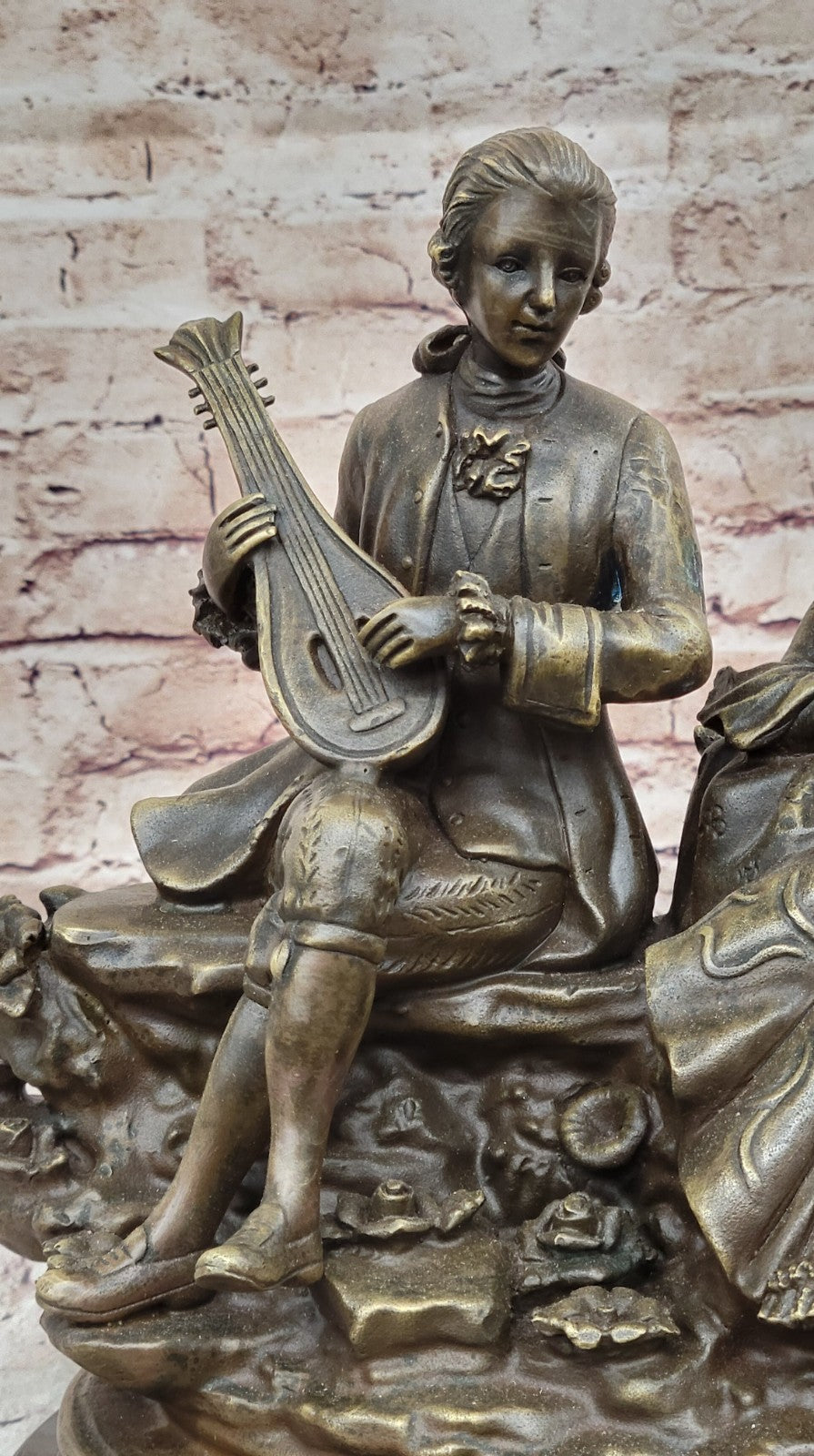 Molded using the ancient method of lost-wax casting, this sculpture features a beautiful brown patina that not only preserves its beauty but also enhances its visual depth. The musician's graceful form and expressive features come to life in bronze, inviting admiration from art lovers and collectors alike.