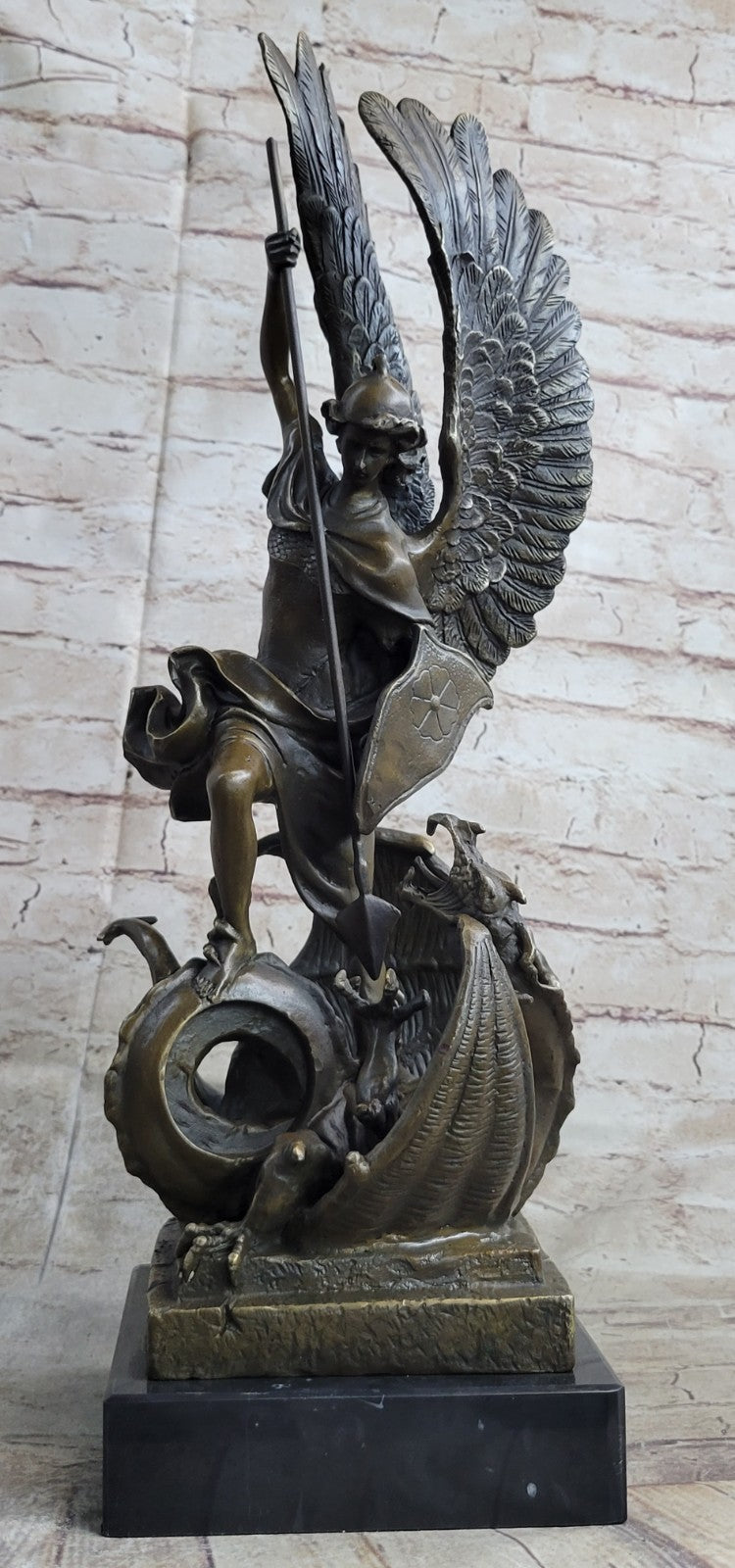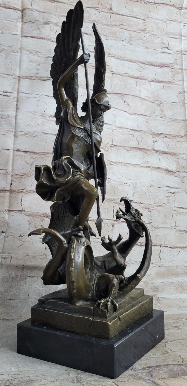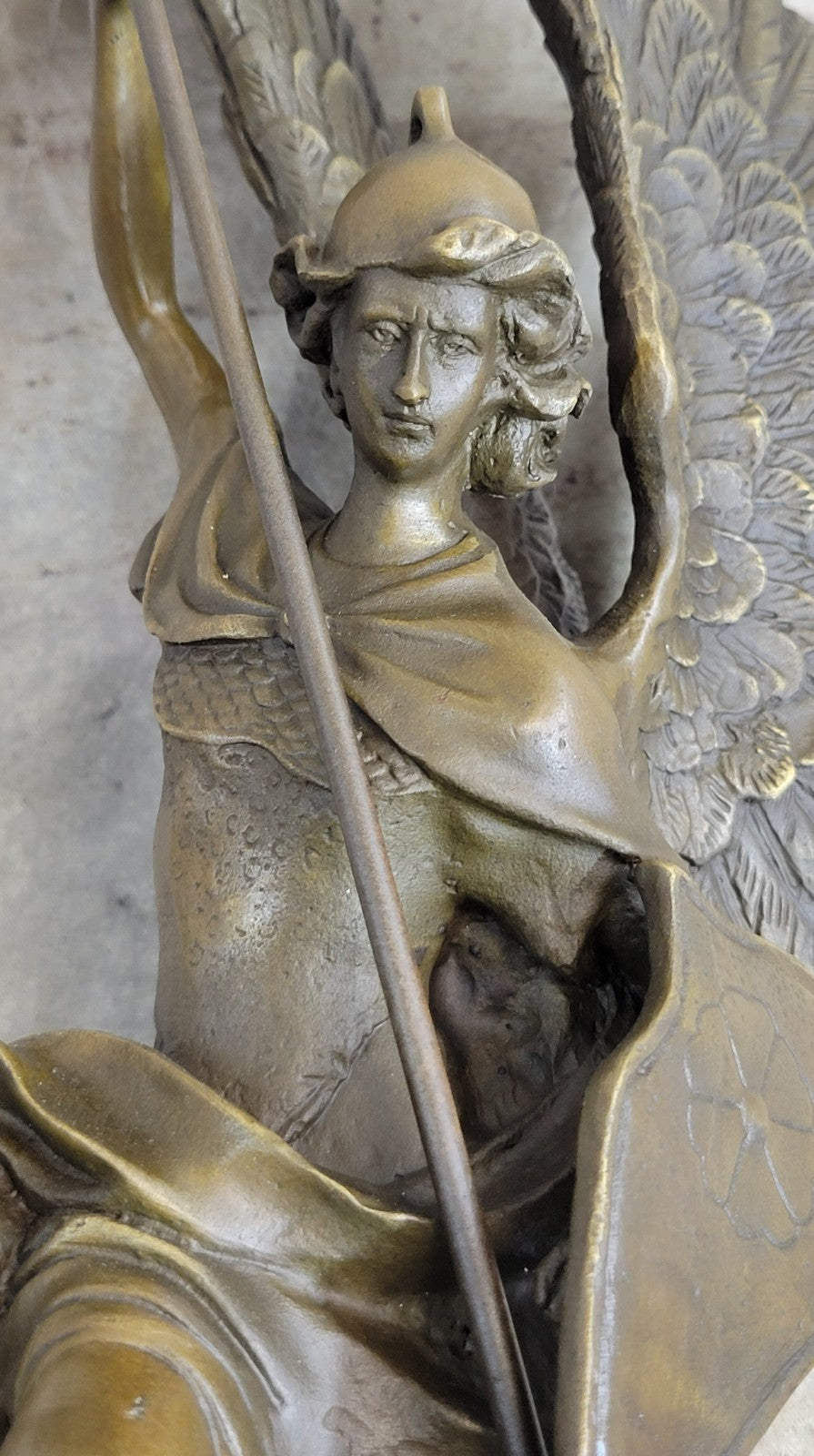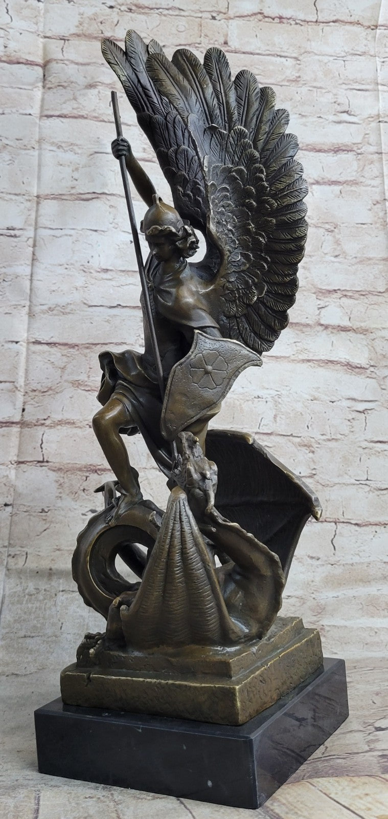 Cast in solid bronze and created using the traditional lost wax method, this sculpture reflects meticulous craftsmanship and attention to detail. The piece is finished with a rich brown patina that enhances the intricacies of Saint Michael’s armor, the texture of the dragon’s scales, and the lifelike folds in his garments. Mounted on a solid black marble base, it has an elegant foundation that complements its grandeur and stability.