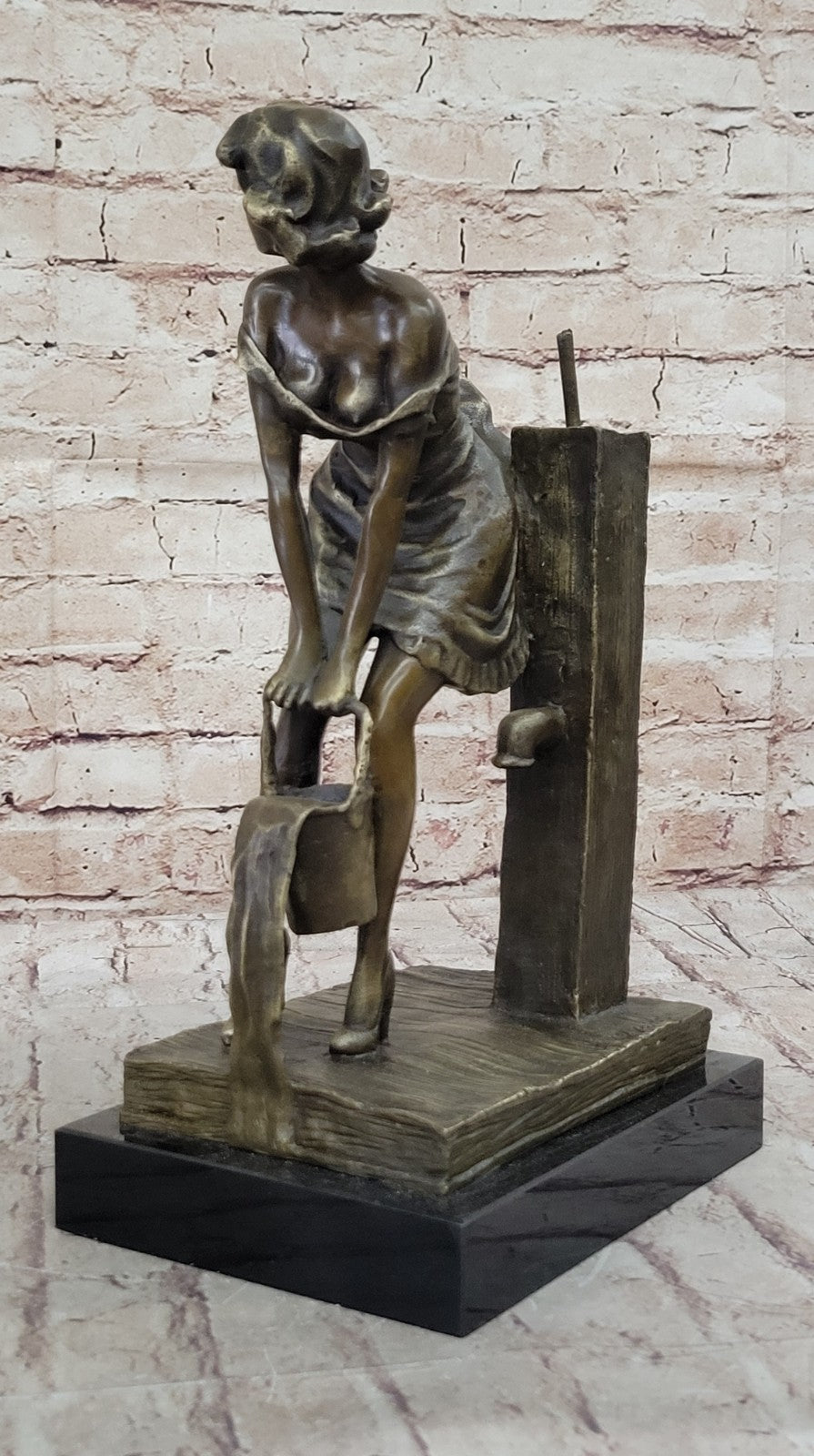 The level of detail in this sculpture is truly exquisite. From the girl's heels and knee-high stockings to the intricate texture of the well's wood grain and the wooden planks she stands on, every element is meticulously crafted. The woman's face radiates beauty, and her hair is elegantly styled to complement her slender features. This sculpture is signed "Preiss" in the bronze, indicating the artist's skilled hand in bringing this amusing and charming scene to life.