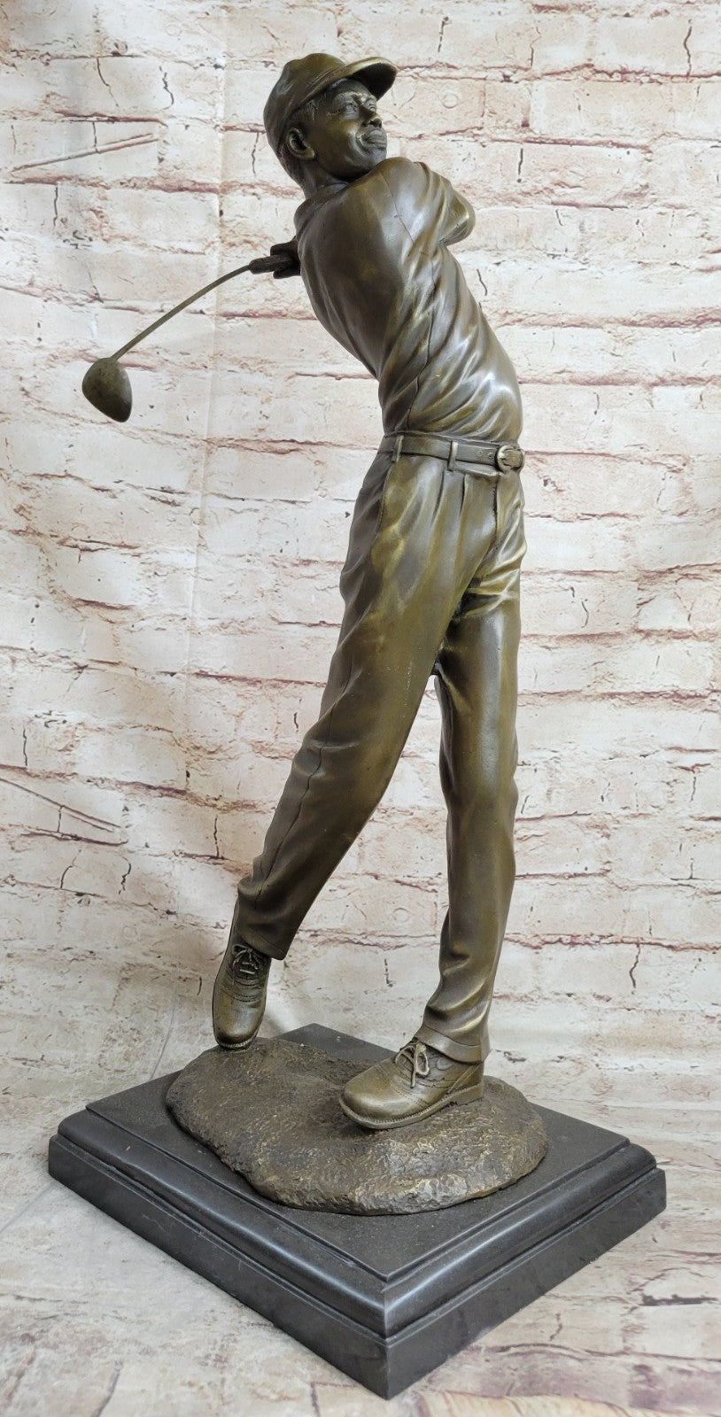 Crafted using the meticulous lost wax method, this sculpture boasts intricate details and fine craftsmanship. Resting on a sleek black marble base, it exudes elegance and sophistication, making it a striking addition to any space. Signed by the artist Milo, it is a testament to his skill and dedication to capturing the essence of golfing excellence.