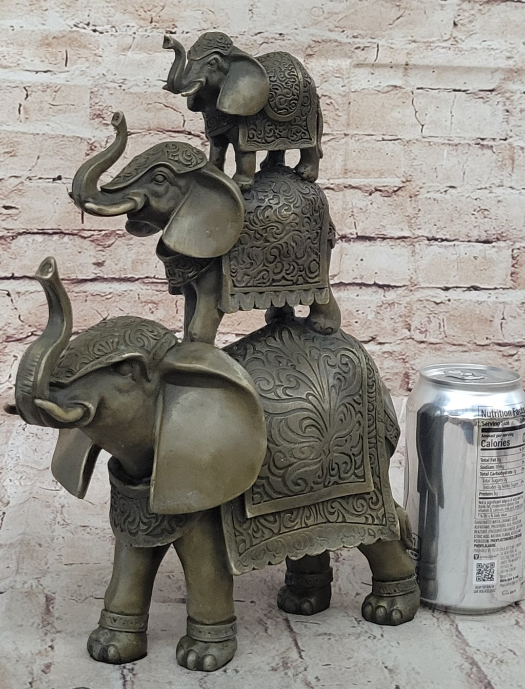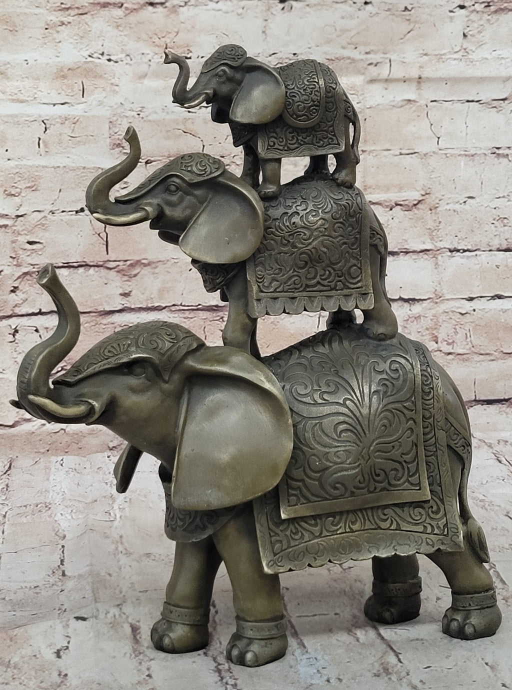 The bronze sculpture in its abstract composition shows three elephants ascending in size from largest to smallest with upturn trunks. They each wear a saddle that boastS exquisite details with an Art Deco flair. For years the elephant has been known as a sacred animal in the East. As the largest animal to walk the Earth, the elephant is known as a symbol of strength and power. It also represents perseverance, in that it is an extremely hard working animal. Elephants are also seen as symbols of wisdom and dignity, because of their incredible intelligence and very long life span. It is believed that an elephants trunk being raised up is a symbol of good luck, fortune, and optimism. The elephants were cast using the ancient methods of lost-wax casting and stained with brown patina finish for preservation. They are mounted upon a black variegated marble base with the artist Munemitsu's signature.