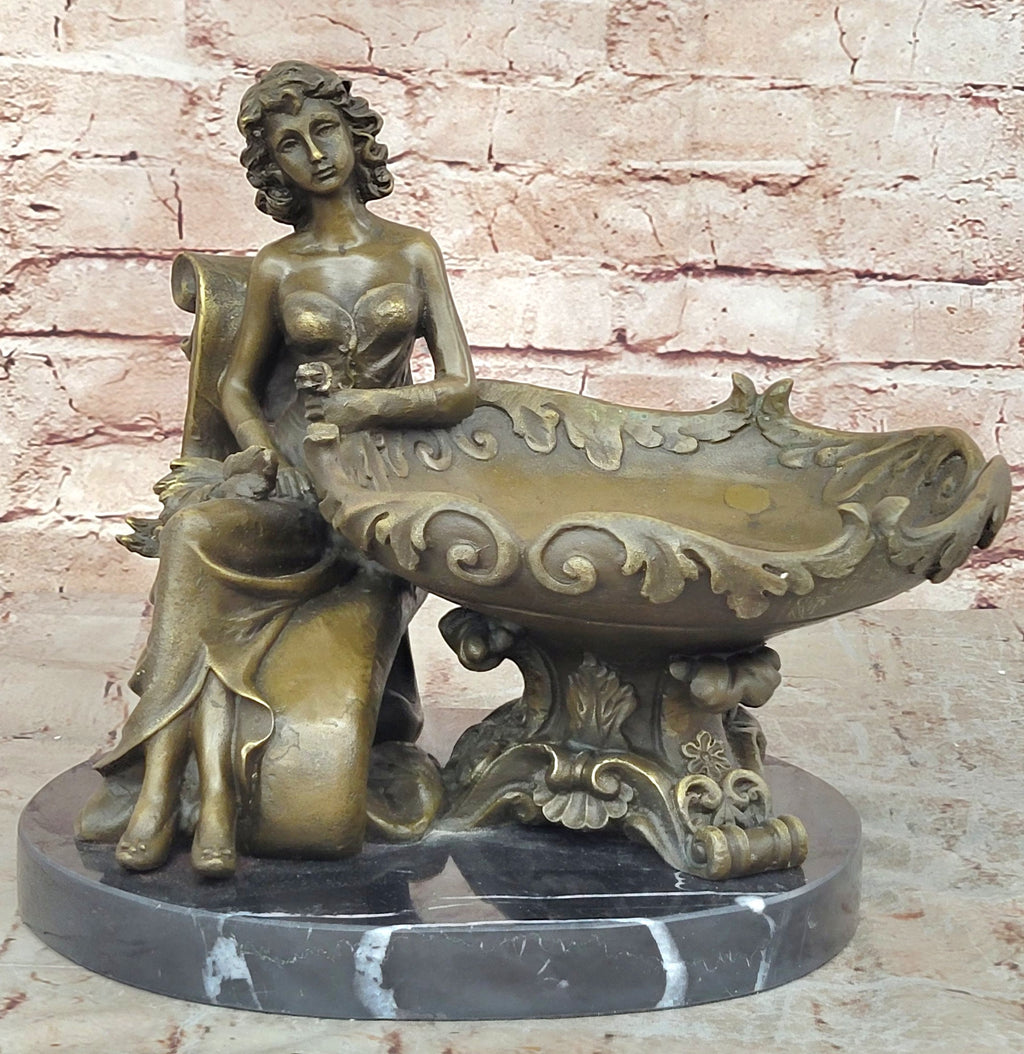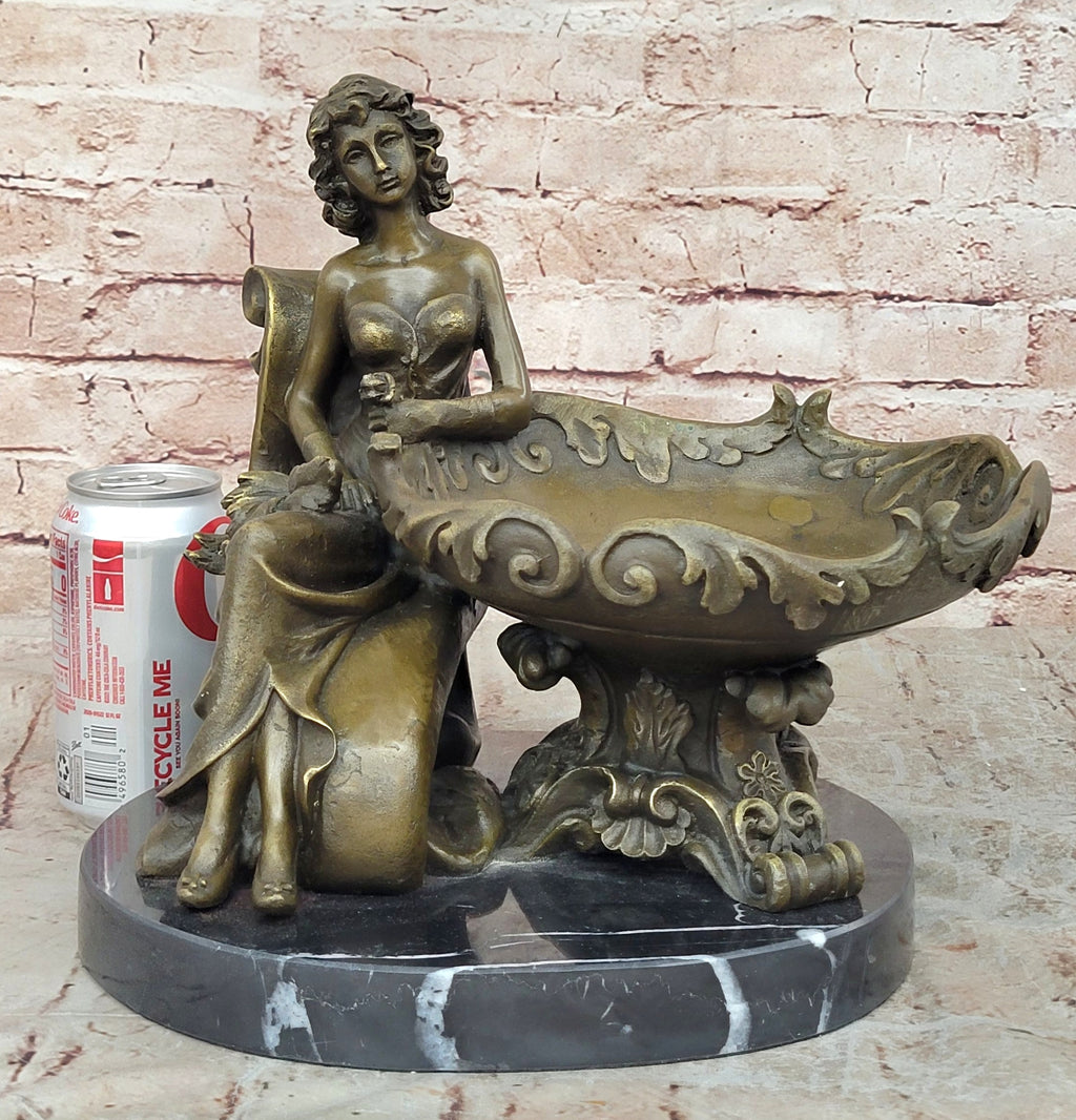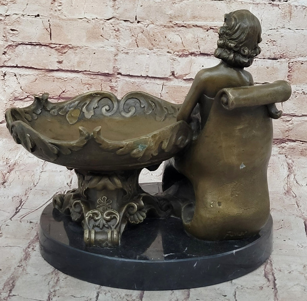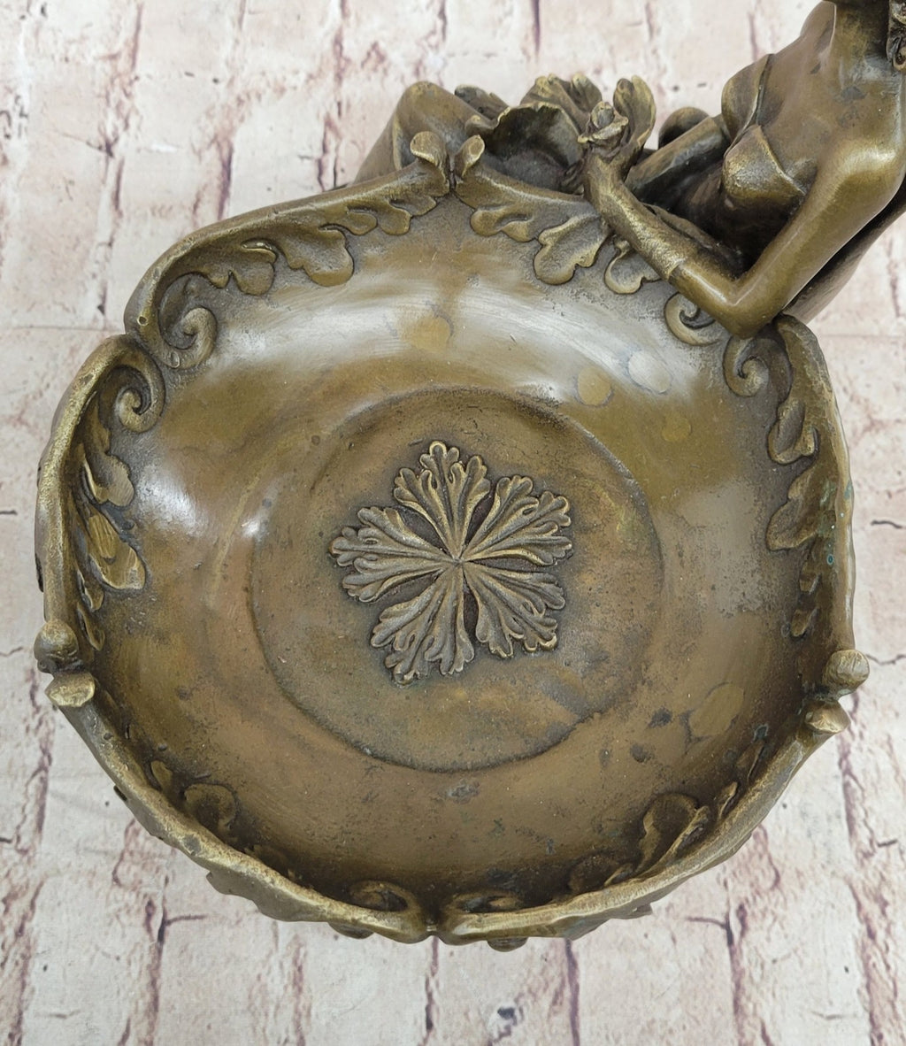 This captivating bronze sculpture beautifully showcases a young girl as the central figure in a delightful and artistic composition. Reclining with an air of relaxed elegance, she holds an oversized, stylish plate on her lap, with her flowing skirt cascading behind her in a graceful manner. The half-nude figure exudes a sense of natural beauty and innocence, while the intricate designs on the plate add an extra layer of visual intrigue to the piece. The artist has skillfully captured a moment of serene contemplation, making the sculpture a charming addition to any space.
