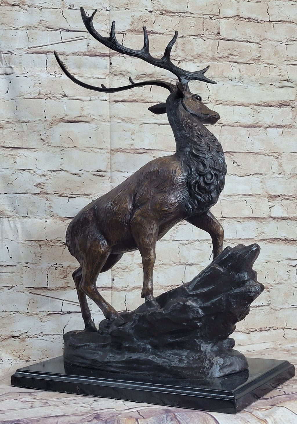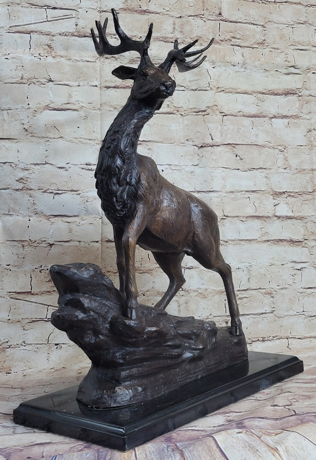Experience the brilliance of Pierre Jules Mene's craftsmanship through this breathtaking bronze sculpture. Transcend into a world where the hunter's prize takes center stage, as a magnificent deer stands poised on a slanted hill. With its head held high, the deer's penetrating gaze captures the essence of its surroundings, while its antlers elegantly curl upwards. A subtle movement startles the creature, as if the distant crack of a twig forewarns of impending danger—a testament to Mene's ability to evoke emotion through his art. Handmade with utmost dedication, this sculpture showcases the impeccable quality of the "Lost Wax Method." Crafted from 100% bronze, it features a mesmerizing two-toned brown patina, adding depth and character to its form. Adorned with the distinguished P.J. Mene's signature, this sculpture not only pays tribute to a master artist but also elevates any space with its undeniable allure.