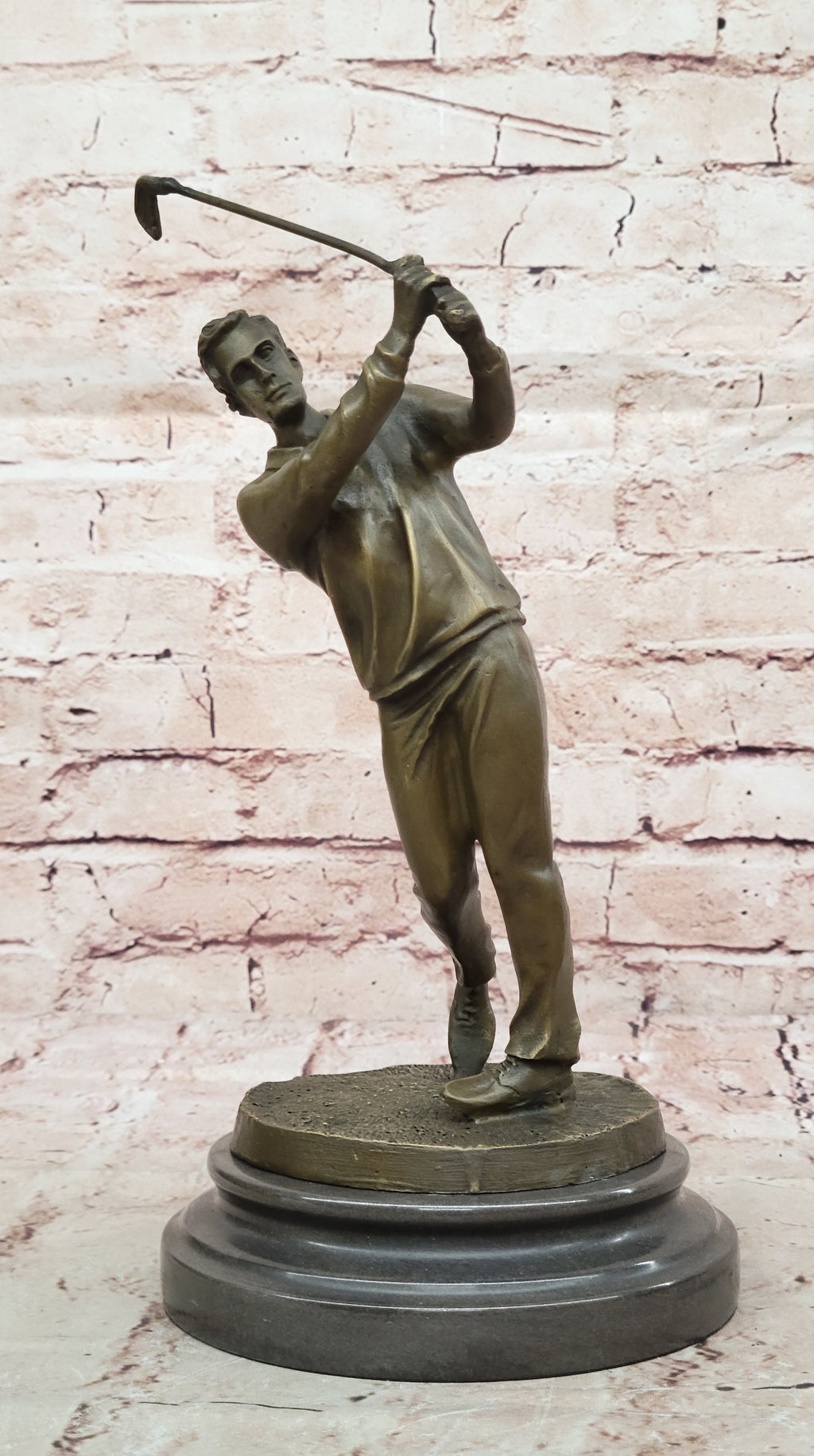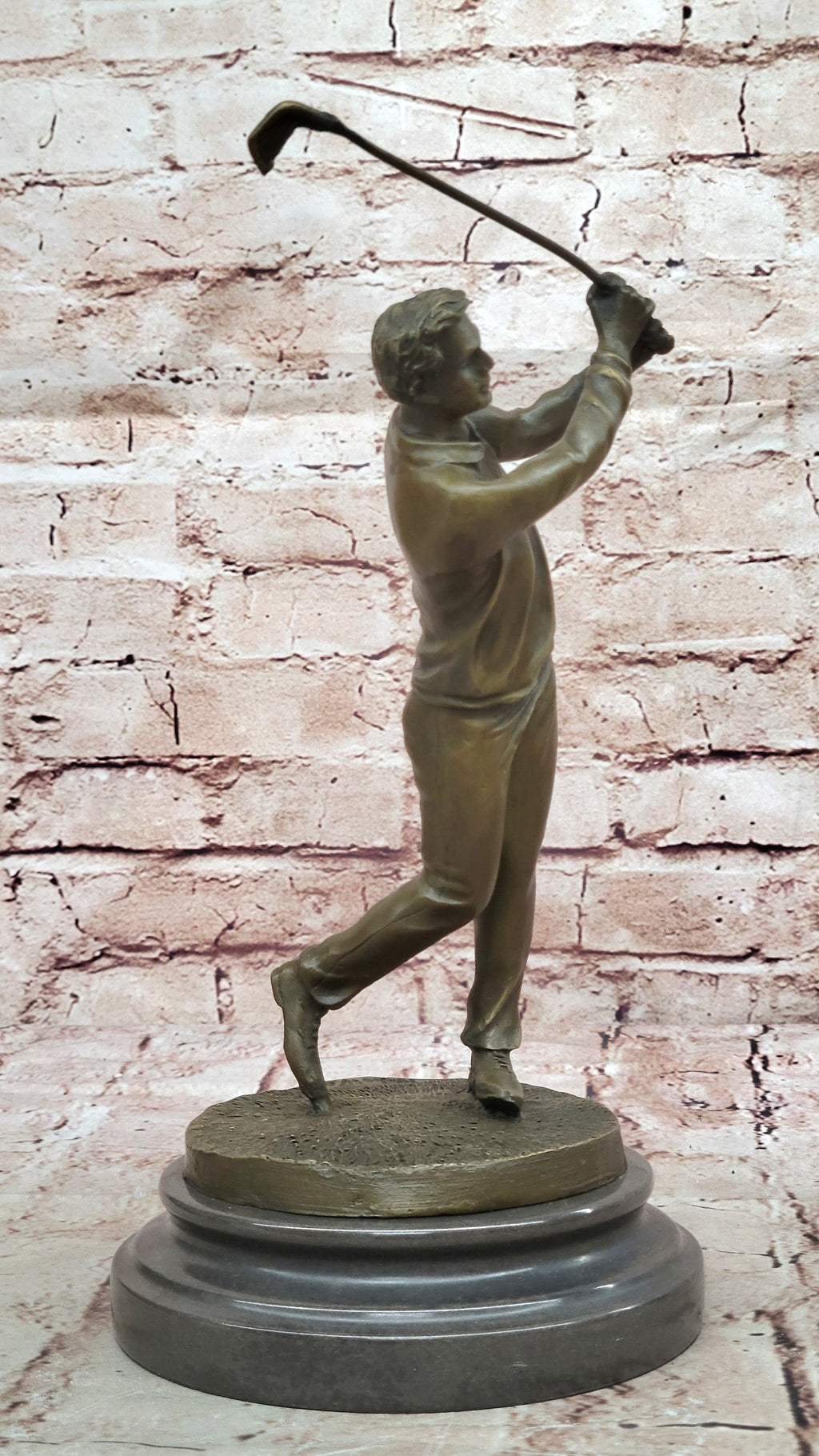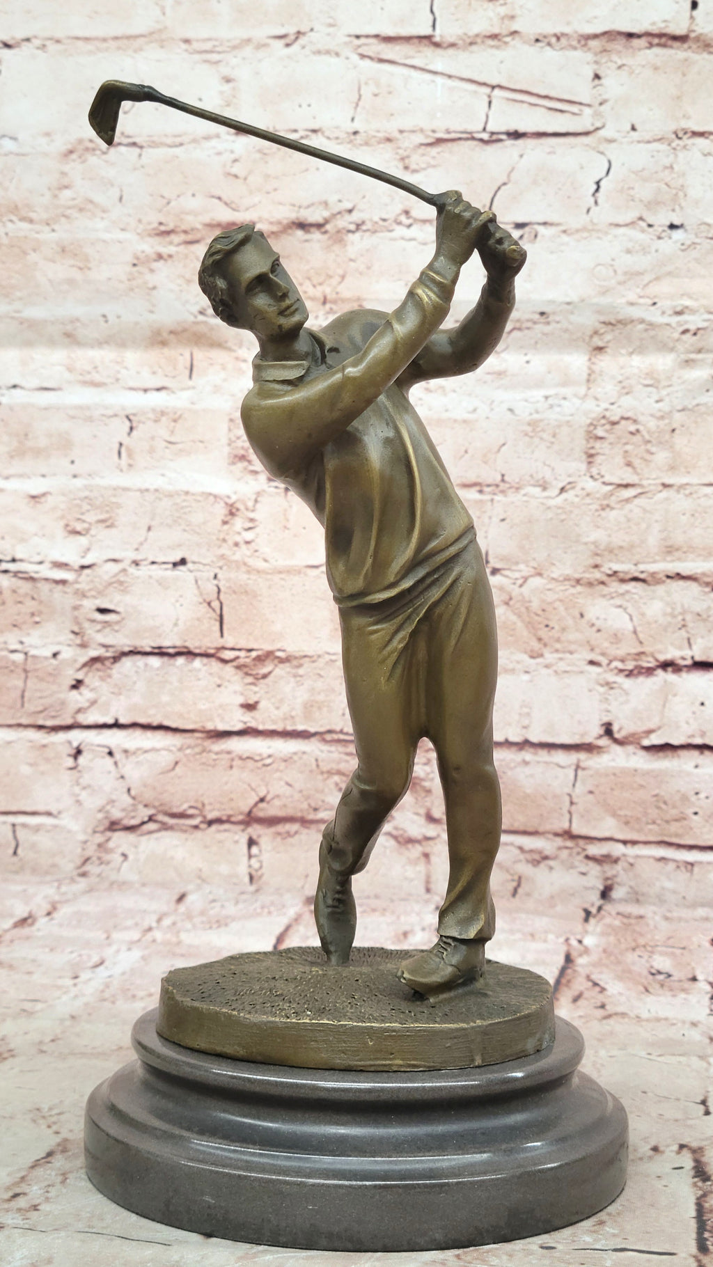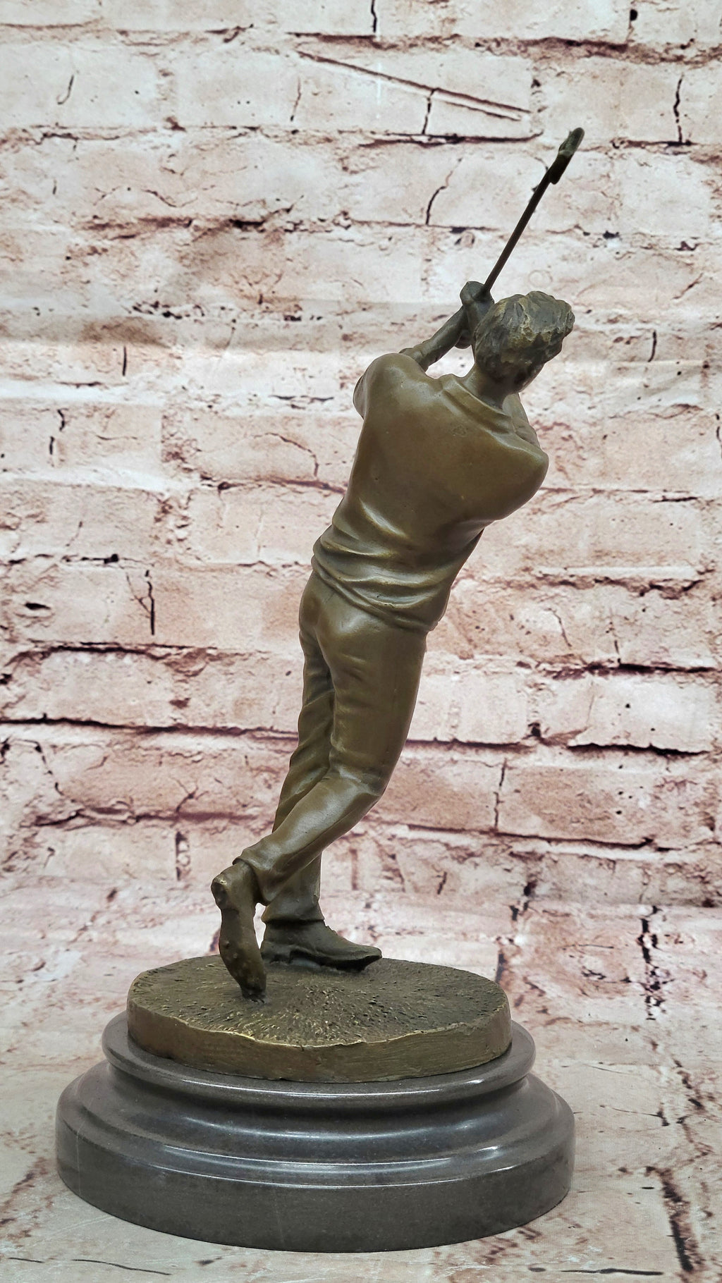 This sculpture, mounted on a round black marble base, is not just a celebration of the sport; it's a tribute to the exhilaration of pursuing a passion. The artist's signature, N.Lowe, is a seal of authenticity that attests to the craftsmanship behind this work of art. "The Happy Golfer" invites you to share in the thrill of the swing, the triumphs, and the camaraderie that define the world of golf.