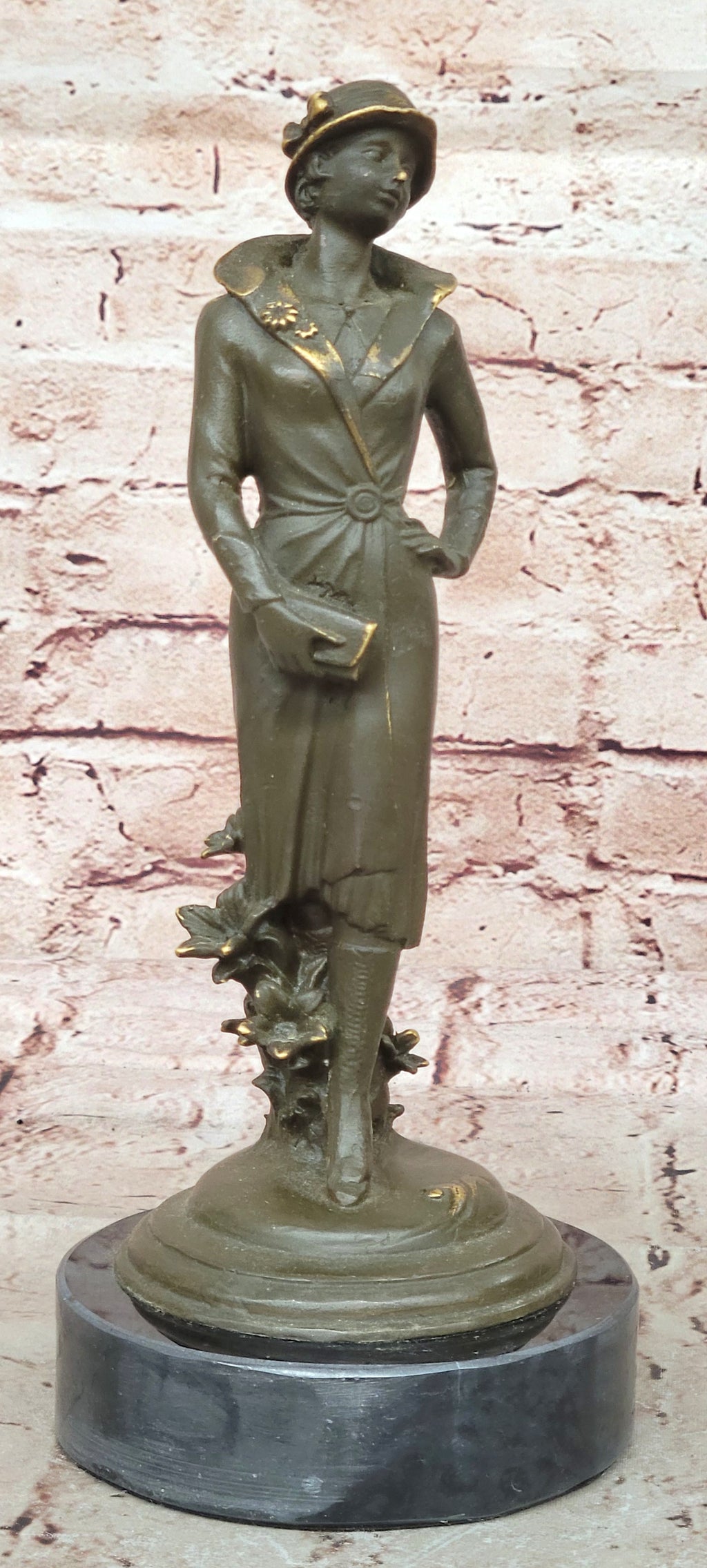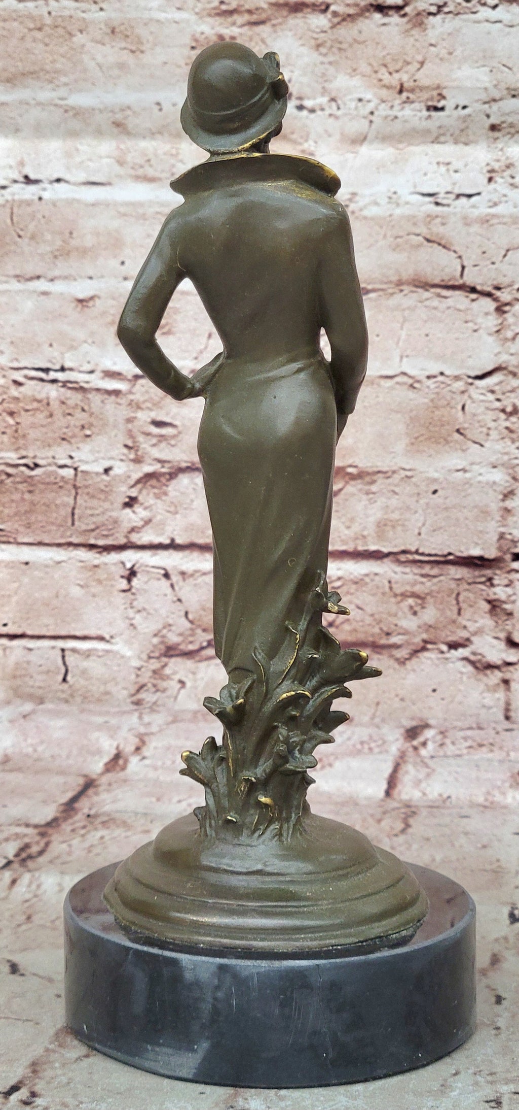 The figure is handmade using the lost wax casting method, a traditional technique known for its precision and durability. The sculpture features a two-tone brown patina, adding depth and contrast to her flowing garments and refined accessories. Every detail—from the gentle contours of her face to the pleats in her dress—reflects exceptional craftsmanship.