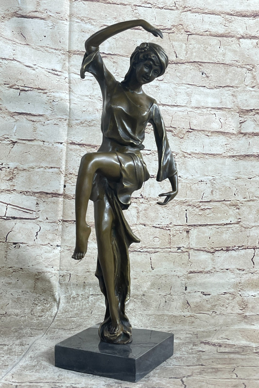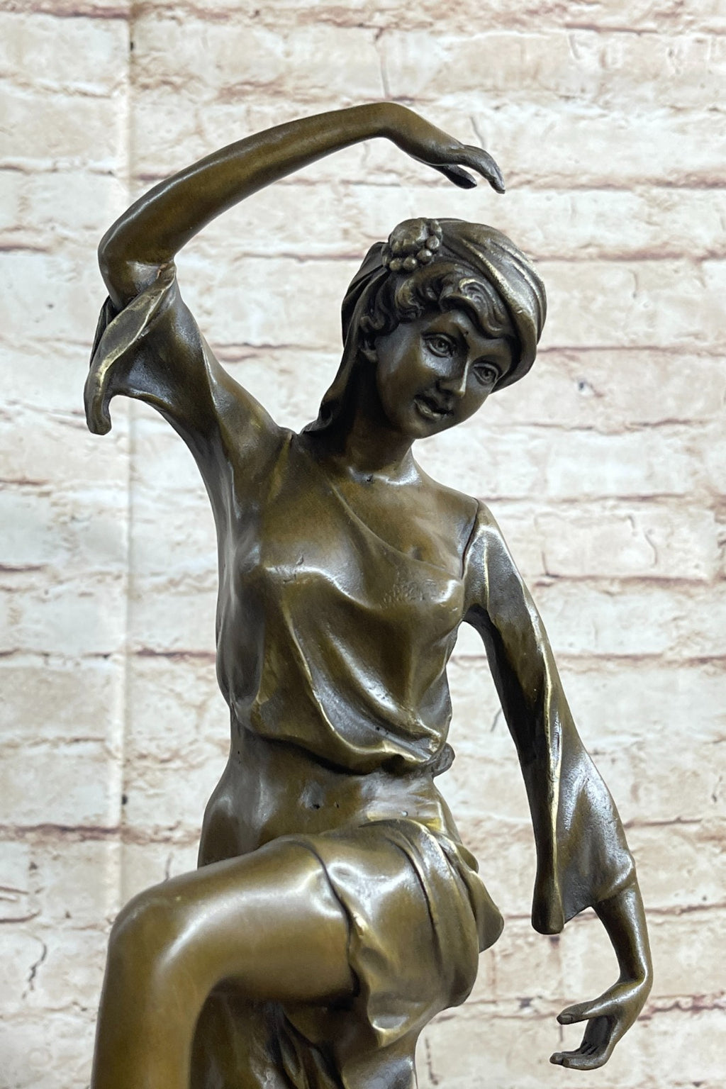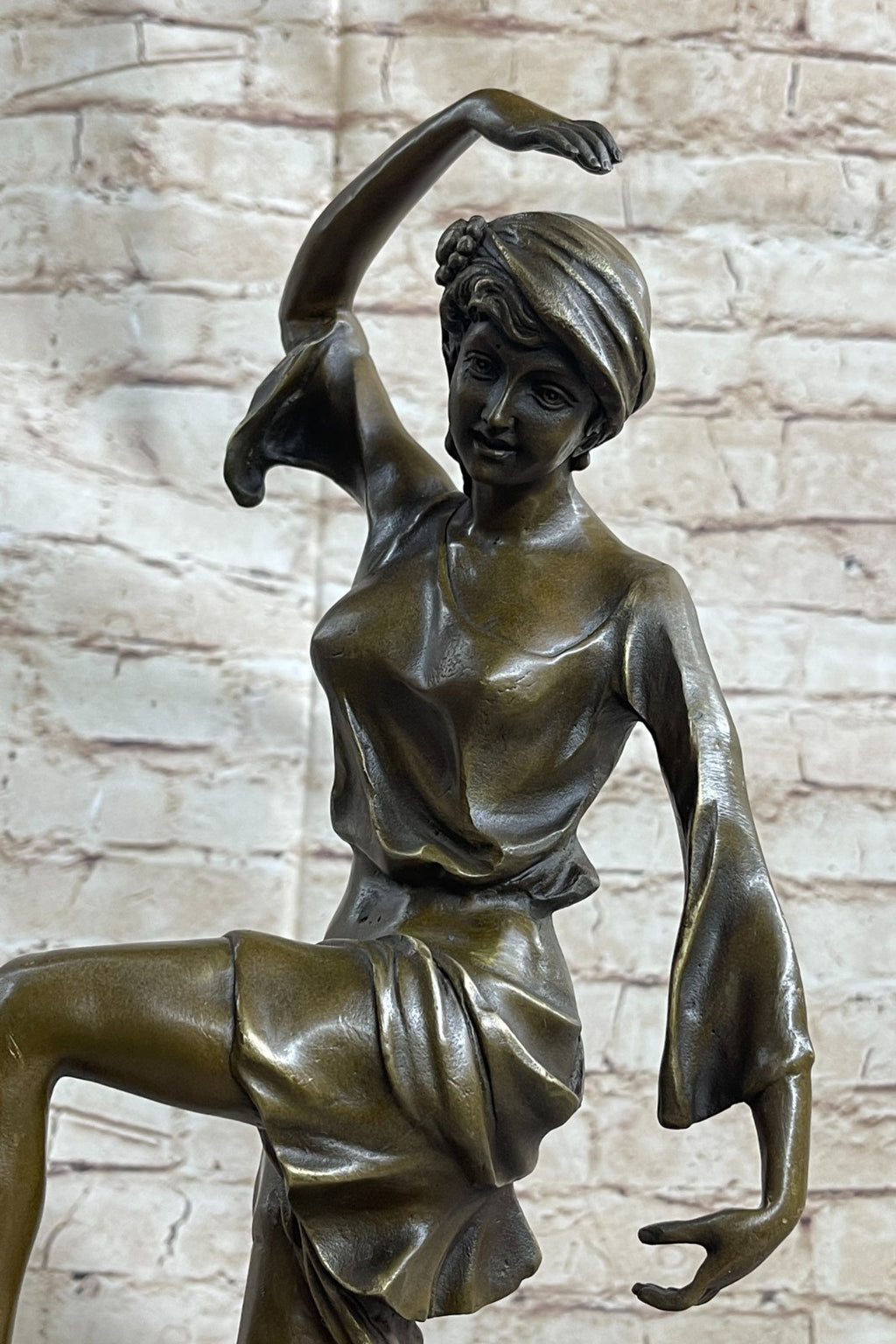 This captivating bronze statue brings to life the vibrant energy of a gypsy dancer, her lithe and graceful form captured in a moment of carefree movement. With arms and legs lifted in a fluid and expressive manner, she exudes an air of joyful abandon, inviting viewers to join in her spirited dance. The striking green tint of the bronze, complemented by the green marble base, adds an intriguing dimension to the sculpture, drawing the eye and sparking curiosity.