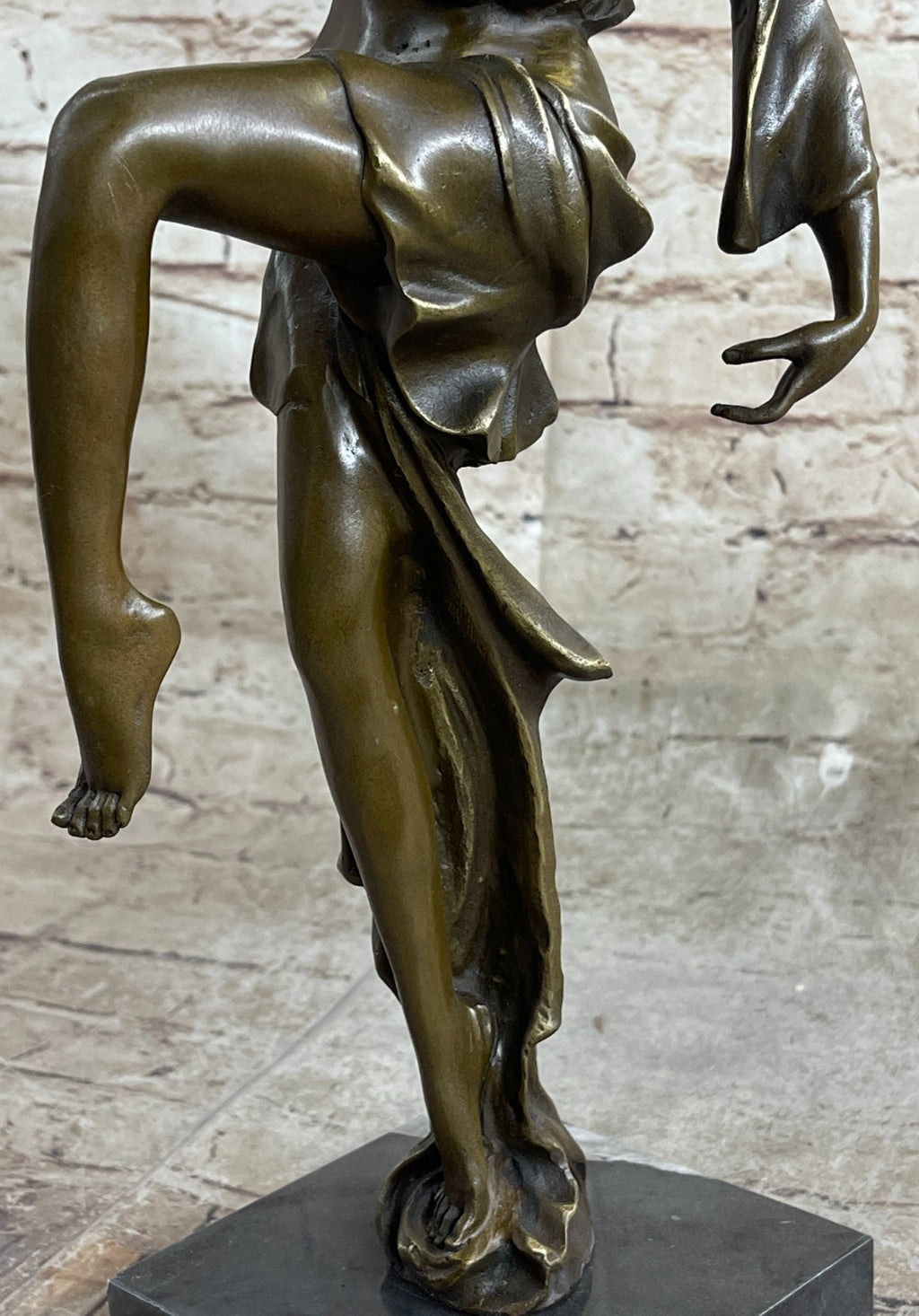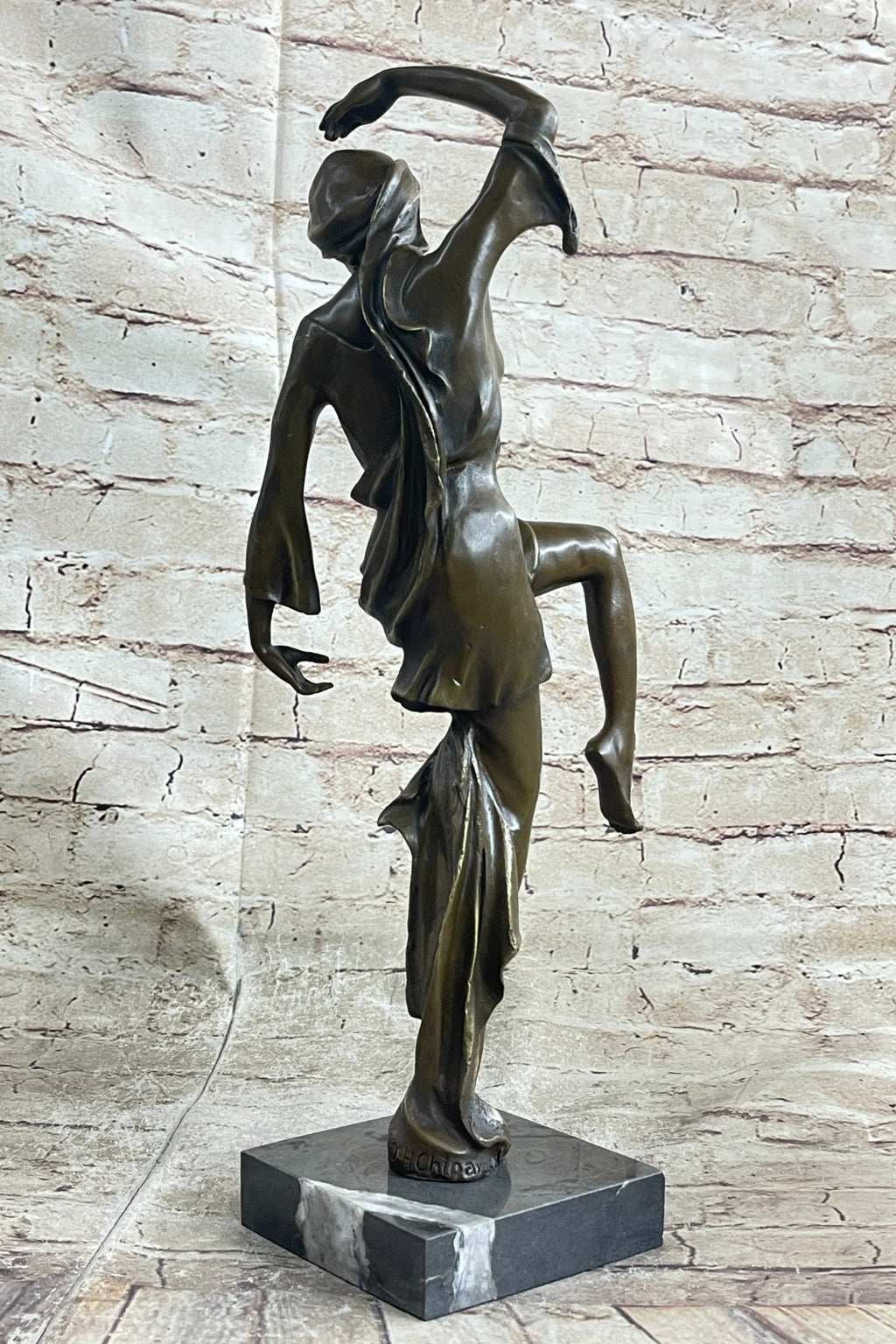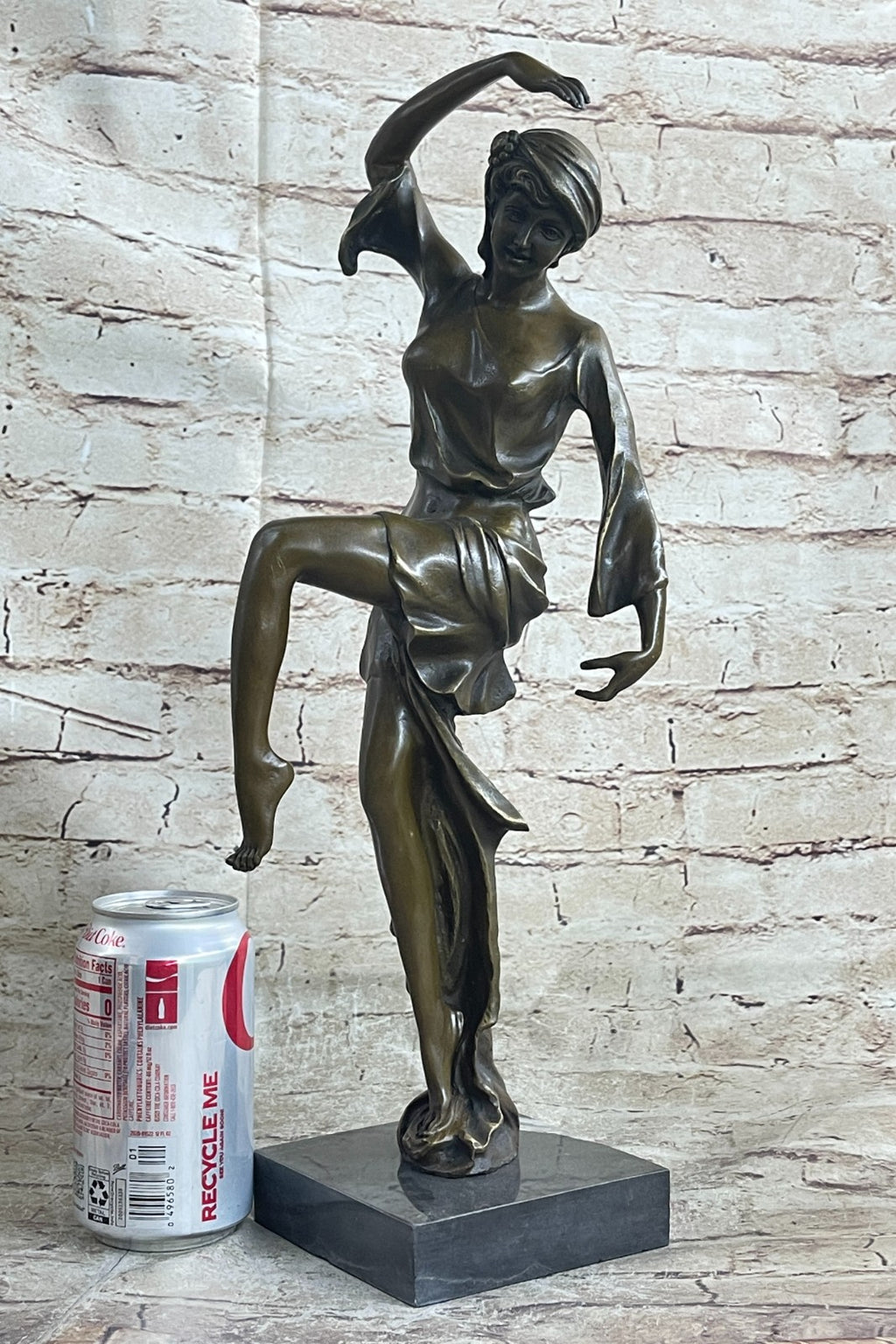This captivating bronze statue brings to life the vibrant energy of a gypsy dancer, her lithe and graceful form captured in a moment of carefree movement. With arms and legs lifted in a fluid and expressive manner, she exudes an air of joyful abandon, inviting viewers to join in her spirited dance. The striking green tint of the bronze, complemented by the green marble base, adds an intriguing dimension to the sculpture, drawing the eye and sparking curiosity.