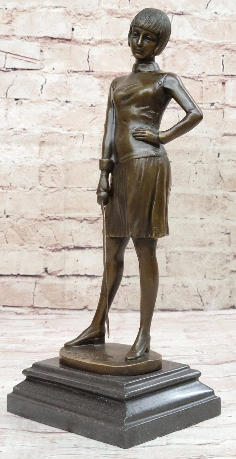 Crafted using the ancient lost wax method, this sculpture stands as a testament to traditional techniques and artistic mastery. The lost wax method allows for intricate detailing, evident in the lifelike rendering of her features and fencing attire. The subtle nuances in the texture of her clothing and the smooth finish of her skin highlight the sculptor's skill in creating a realistic yet artistic representation. The rich brown patina adds depth and warmth to the sculpture, enhancing its visual appeal.