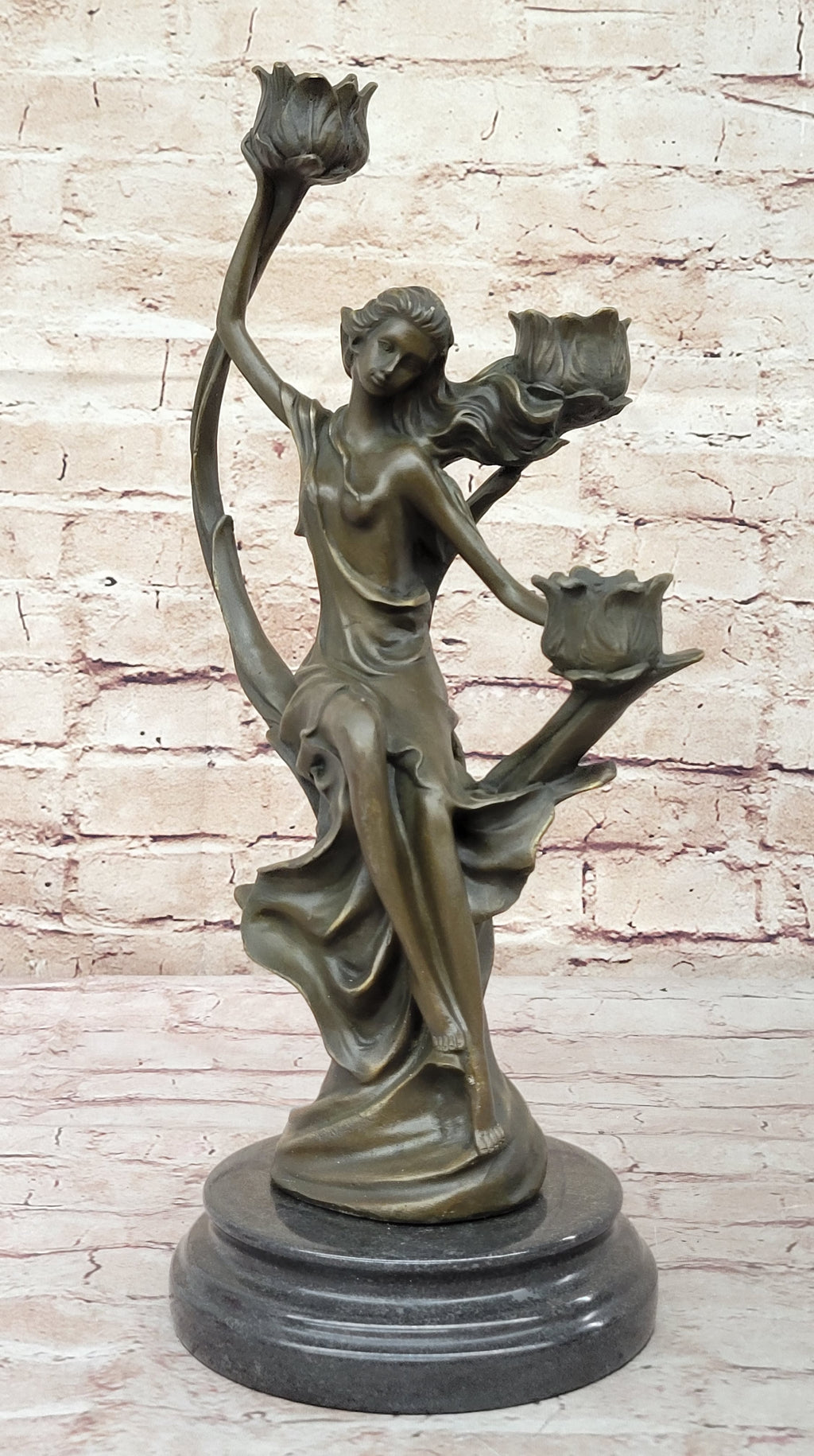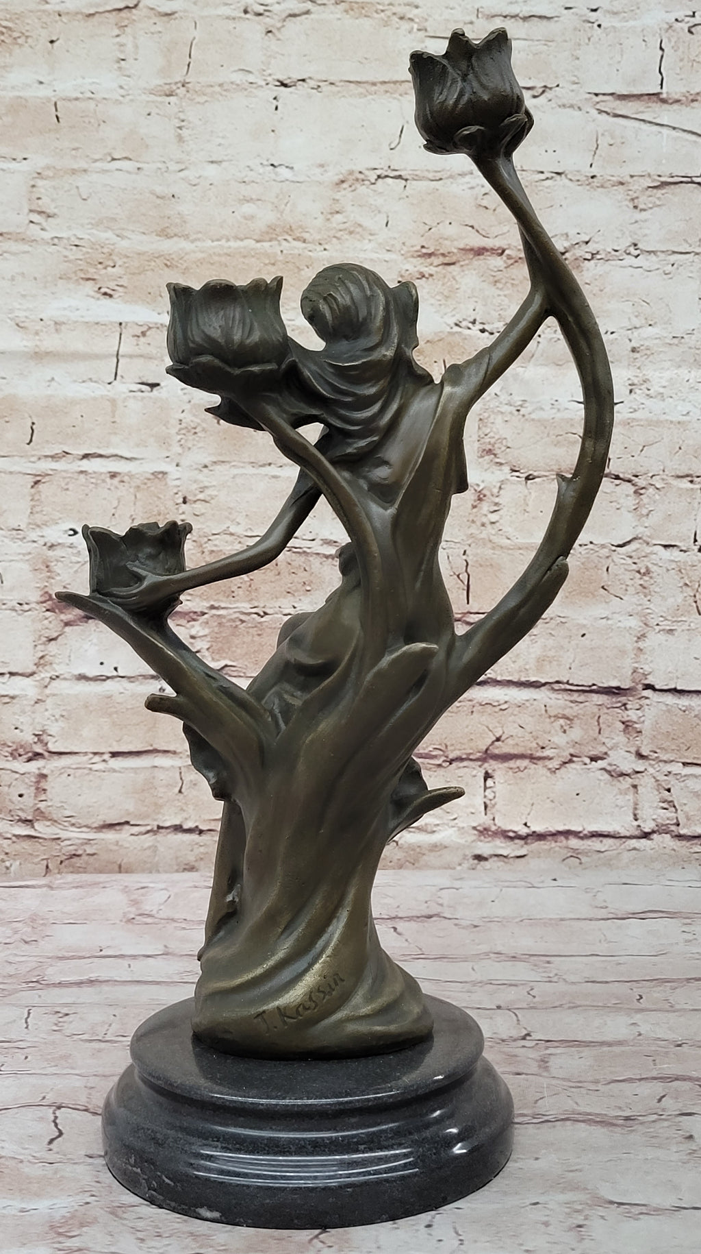 Elevate your home decor with our Hot Cast Handmade Bronze Candle Holder, featuring a sexy nymph with flowers that doubles as a stunning functional piece of art. This exquisite sculpture captures a woman in a serene moment, one hand behind her head while gracefully wiping her brow, dressed in a flowing robe that elegantly drapes to her thighs. Every detail, from the dynamic folds of her robe to the delicate flowers that conceal candle slots, showcases the craftsmanship of the talented artist J. Kassin.