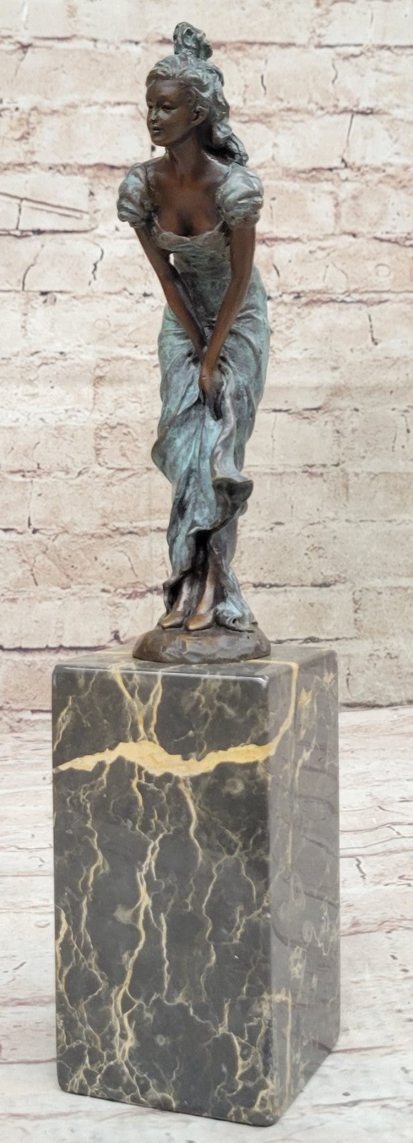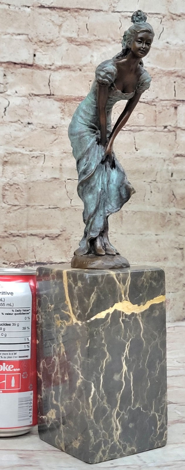 The striking contrast between the blue patina of her hair and flowing dress against her brown patina skin tone adds a captivating visual element to this sculpture. The blue patina resembles the crystal blue waters of tropical paradise, creating a harmonious and evocative color palette. This choice of patina enhances the sculpture's aesthetics and showcases the artist's commitment to precision and artistry.