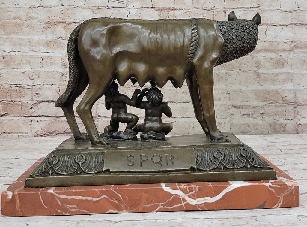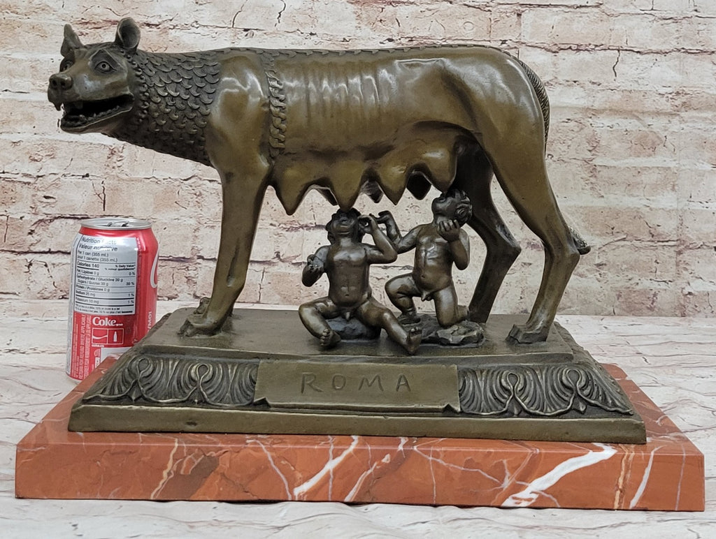 Radiating a sense of timeless beauty, this bronze statue features a she-wolf standing tall, safeguarding two infants beneath her watchful eyes. The statue's exquisite brown patina lends a weathered appearance, enhancing the intricate details and adding depth to the overall design. The she-wolf's commanding presence is accentuated by the artist's skillful craftsmanship, particularly evident in the meticulously sculpted mane enveloping her neck and spine. Notably, her ribs are gracefully emphasized, and her ears stand upright, adding to the lifelike quality of the sculpture. As she provides a protective shield for the children, Romulus and Remus, their serene expressions and gestures of receiving nourishment exude an air of blissful contentment. Resting on a square slab of Rose marble, this remarkable artwork is a testament to the renowned lost wax method and bears the signature of its talented creator, Romulus.