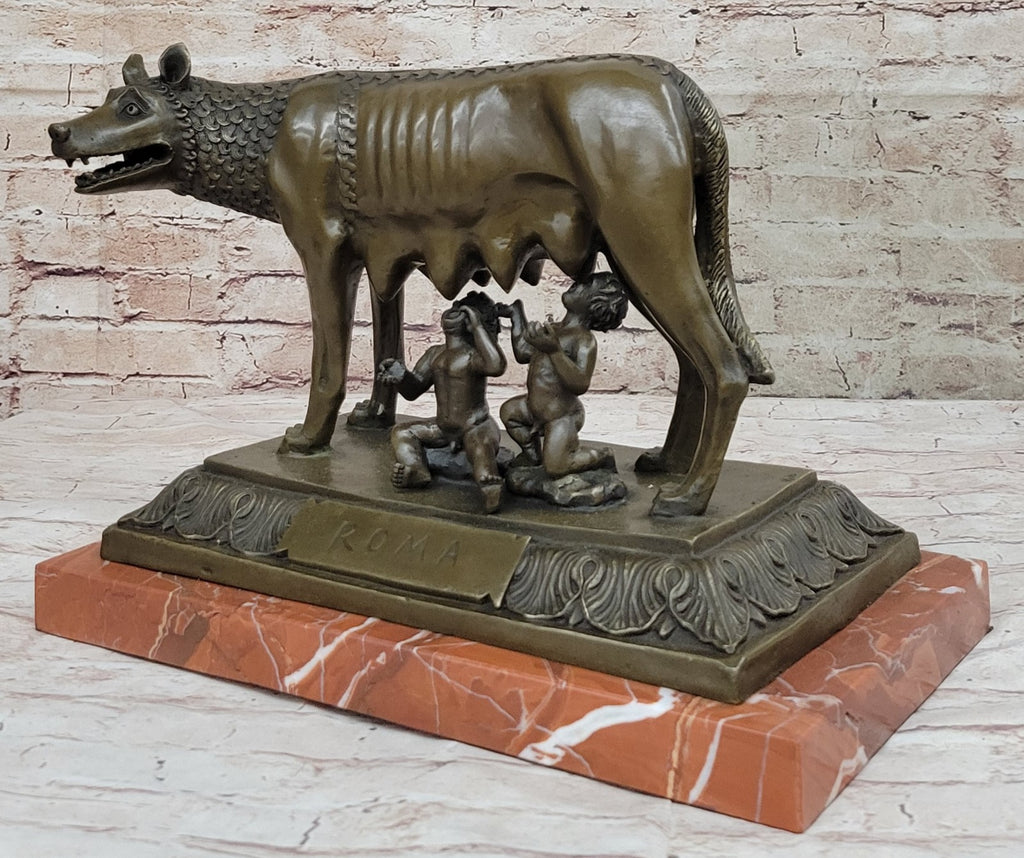 Crafted with exceptional artistry, this bronze masterpiece showcases the she-wolf's nurturing nature as she provides nourishment to the two young boys. The sculpture's rich brown patina imparts an aged effect, emphasizing its meticulous detailing. The she-wolf's protective pose, with a thicker mane intricately sculpted around her neck and spine, exudes strength and guardianship. Her well-defined ribs and upright ears further contribute to the sculpture's realistic portrayal. Underneath the she-wolf's watchful gaze, Romulus and Remus are depicted in a moment of joyful contentment. One boy is seated with his palms facing upward, positioned beneath the she-wolf's breasts, while the other kneels beside him, also extending his palms skyward. The sculpture's Rose marble base, resting firmly on a square slab, provides an elegant foundation for this captivating artwork. A testament to the meticulous lost wax method, this remarkable sculpture is signed by the talented artist, Romulus.