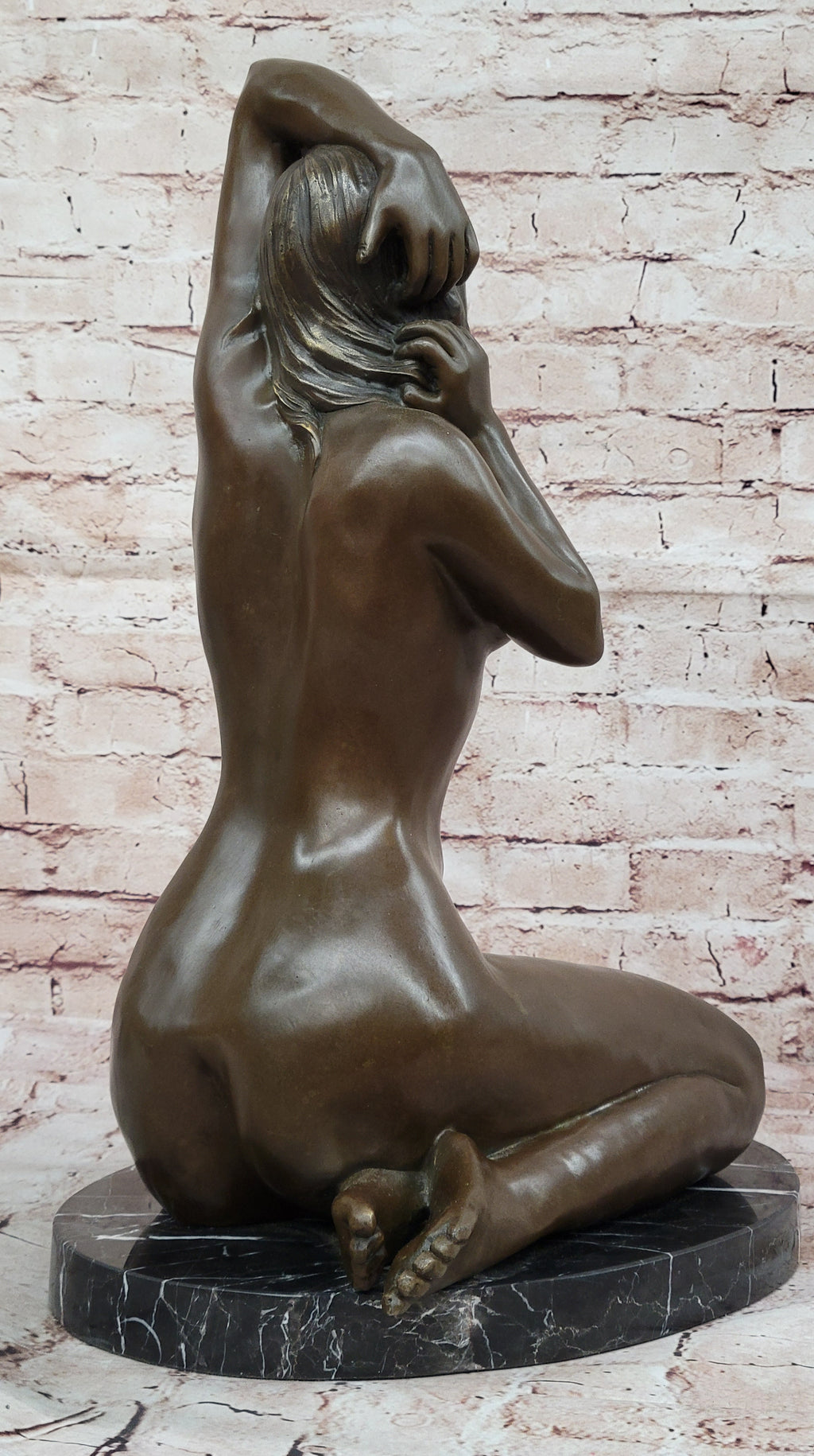Crafted with intricate detail and artistic finesse, the bronze sculpture showcases the skillful craftsmanship and attention to anatomical accuracy, highlighting the curves and contours of the human body with exquisite precision. The "Lost Wax Method" used in the casting process ensures the preservation of every delicate feature, allowing the sculpture to capture the subtle nuances and emotions of the muse's pose. The brown patina finish further accentuates the lifelike qualities of the sculpture, adding depth and dimension to the portrayal of the muse's captivating presence.