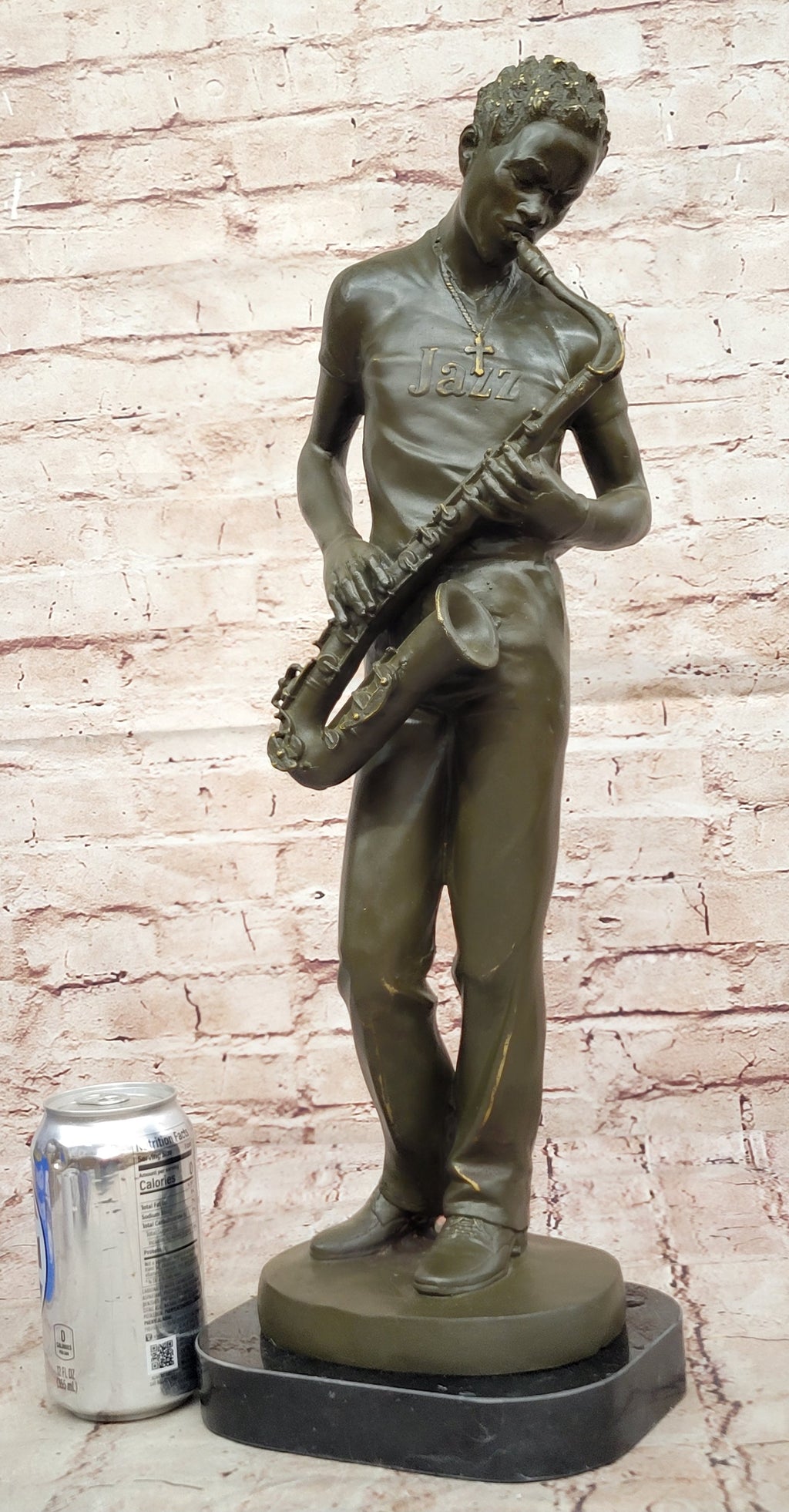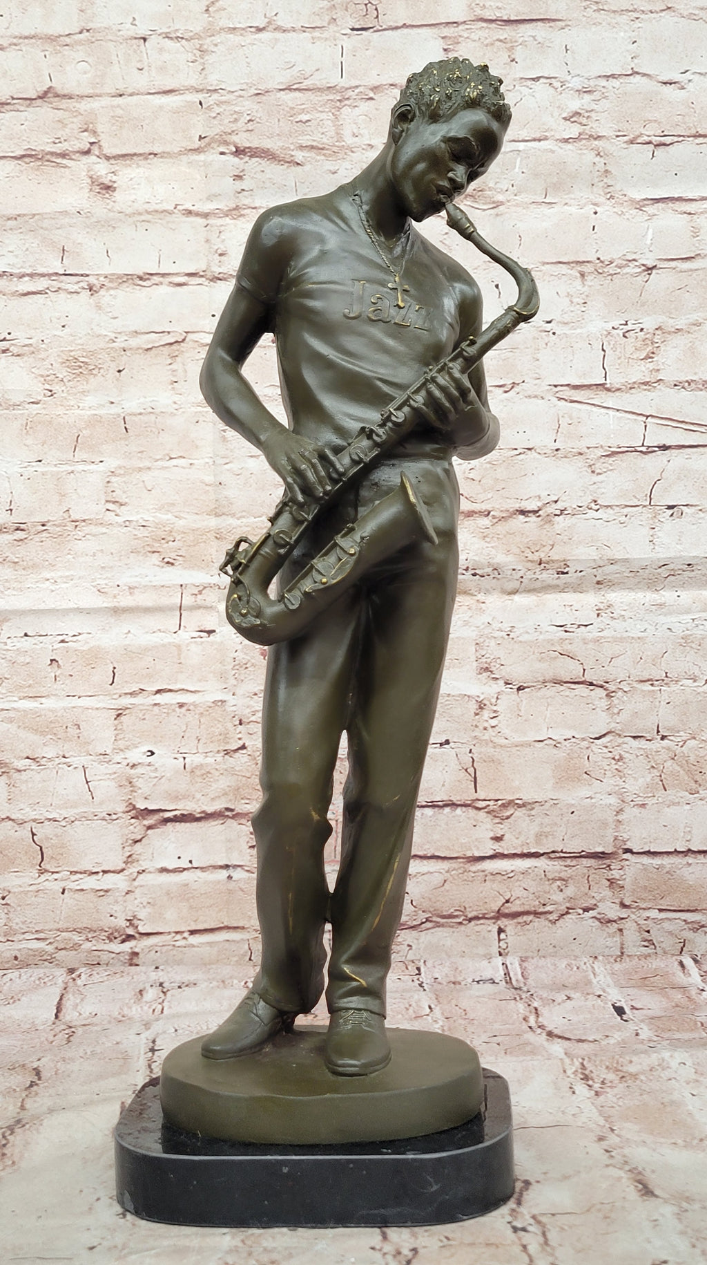 Crafted entirely by hand using the ancient lost wax method, this sculpture is made of 100% genuine bronze and finished with a rich brown patina, enhancing its depth and visual warmth. The figure is securely mounted on a sleek black marble base, providing a refined and stable platform that complements the sculpture’s elegance. Each detail—from the folds of the musician’s clothing to the shape of the saxophone—is finely executed to capture the vibrancy of live performance.