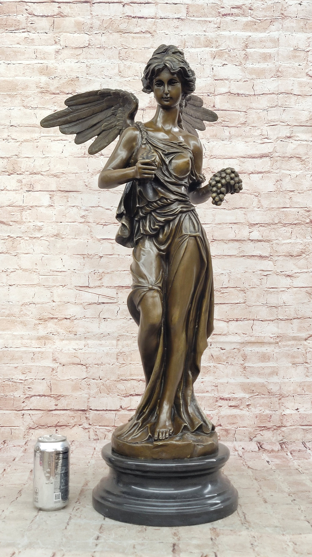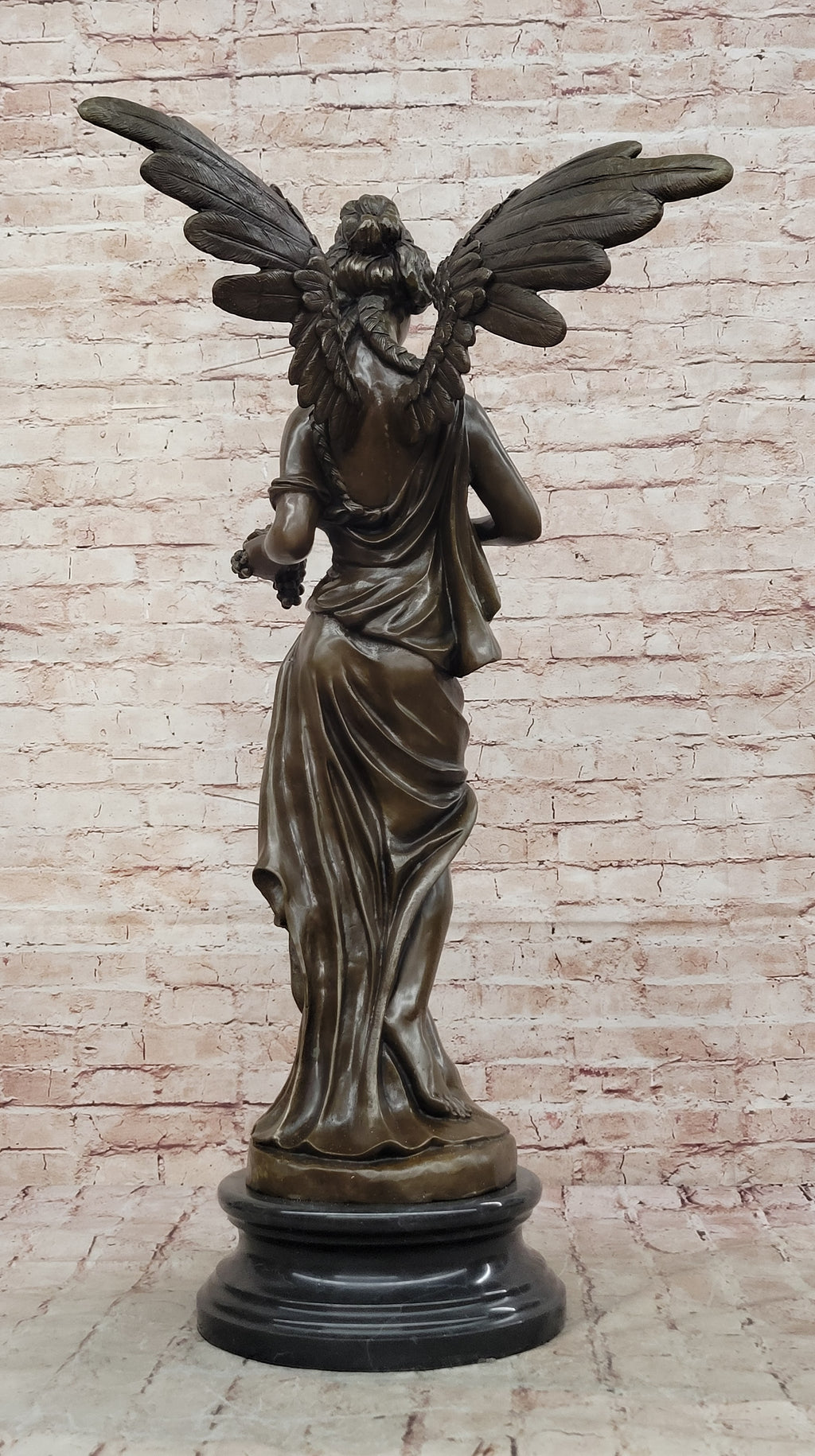 Hand made using the traditional lost-wax casting method, this extra-large and heavy genuine bronze sculpture reflects exceptional craftsmanship and fine detailing. The rich brown patina enhances the depth of the wings, drapery, and facial features, adding warmth and dimension while preserving the monument-like character of the piece.