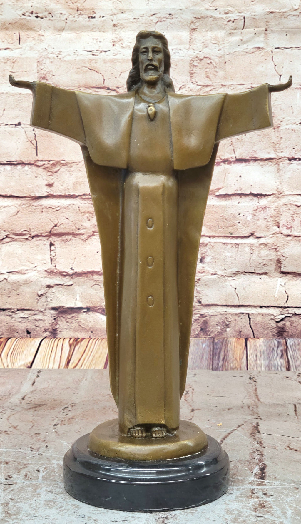 Inspired by the iconic "Christ the Redeemer" statue that overlooks Rio De Janeiro, this sculpture shares some similarities in its grandeur and symbolic significance. Clad in his traditional robe, Jesus extends his arms wide open, inviting all to find solace and refuge in his embrace. The sculpture beautifully portrays his compassionate nature, as he welcomes and protects his children.