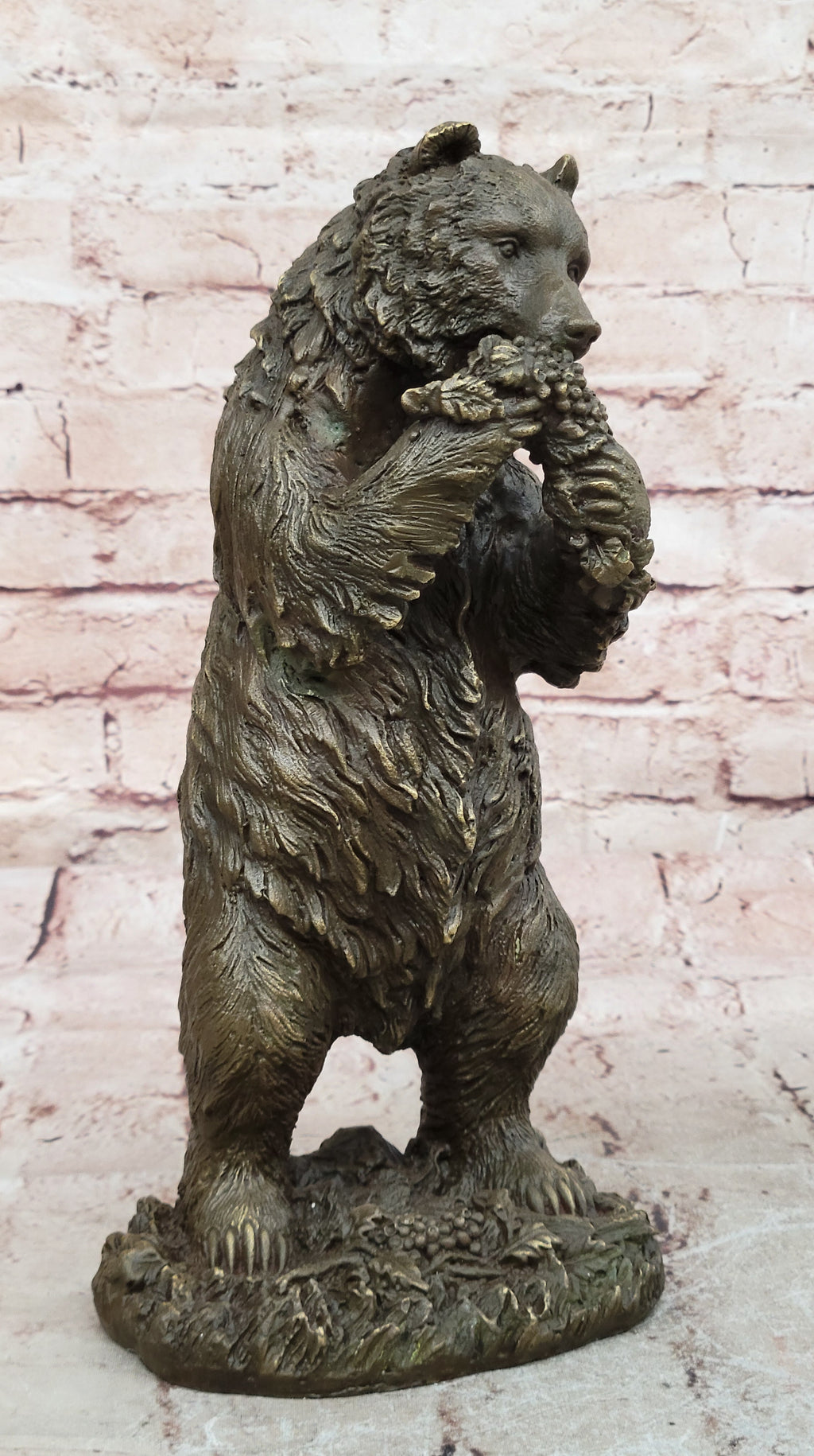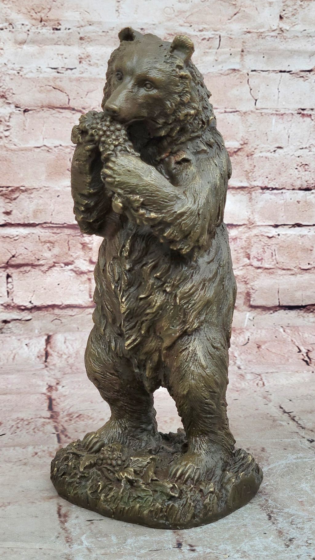 Bring the wild beauty of the forest into your home with the Kodiak Grizzly Bear Lodge Wildlife Bronze Sculpture. This stunning artwork captures a hungry grizzly bear standing tall on his hind legs, savoring a bunch of juicy grapes in a serene forest scene. Every detail is meticulously handcrafted, from the bear’s fluffy, textured fur to the lifelike grass beneath his feet, creating a realistic and captivating centerpiece.