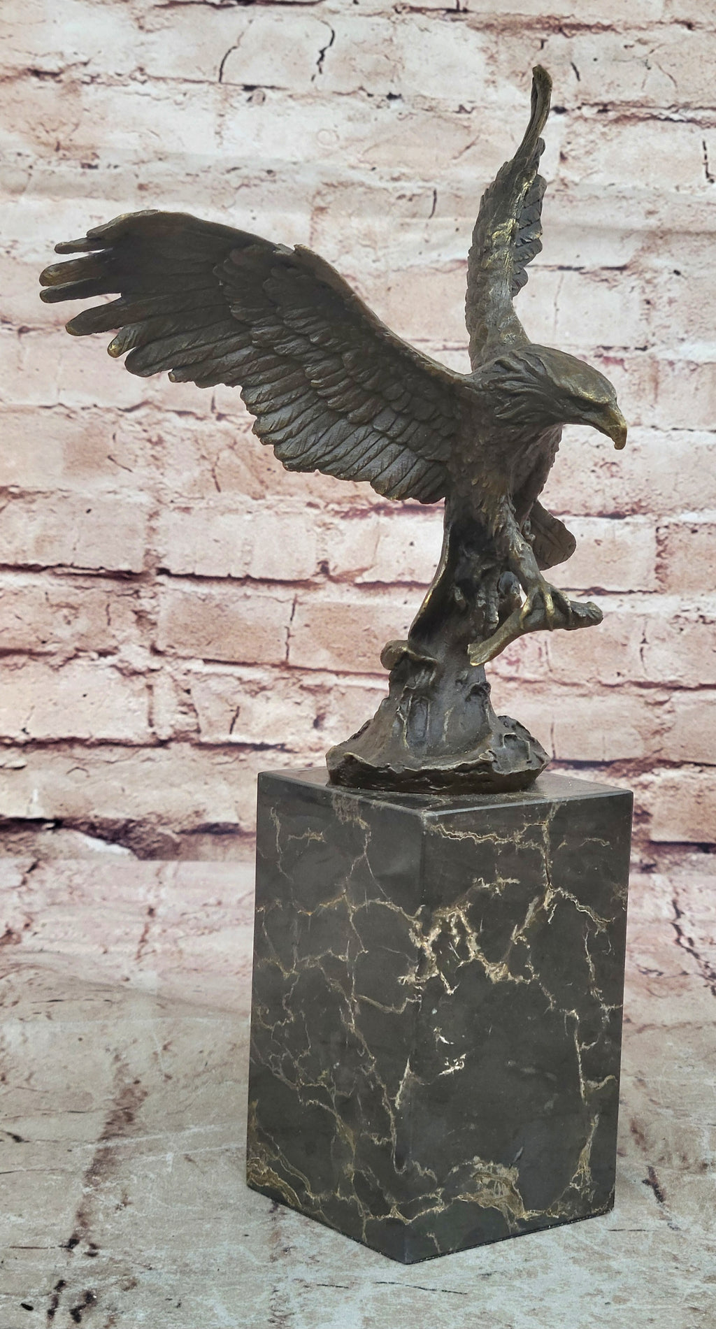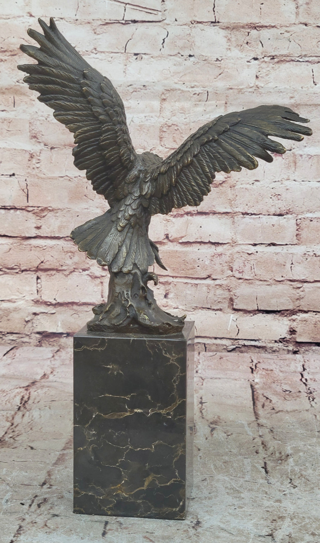 Meticulously crafted using the ancient and revered technique of lost-wax casting, this sculpture is a testament to the enduring artistry of bronze casting. Every detail has been carefully preserved to capture the grace and majesty of the noble eagle. A lustrous brown patina finish adorns the sculpture, enhancing its visual appeal while safeguarding its timeless beauty.