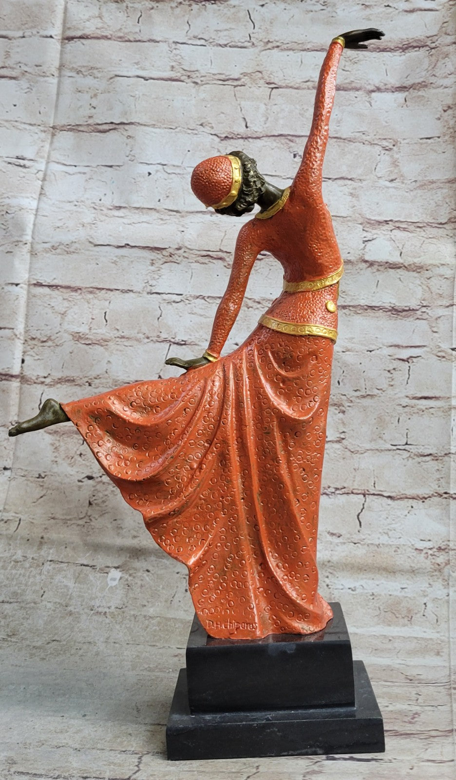 Resting upon a sleek black marble base, this sculpture not only stands as a testament to the artistry of D.H. Chiparus but also adds an element of sophistication to any space where it is displayed. The artist's signature on the piece ensures its quality and marks it as a collectible work of art.