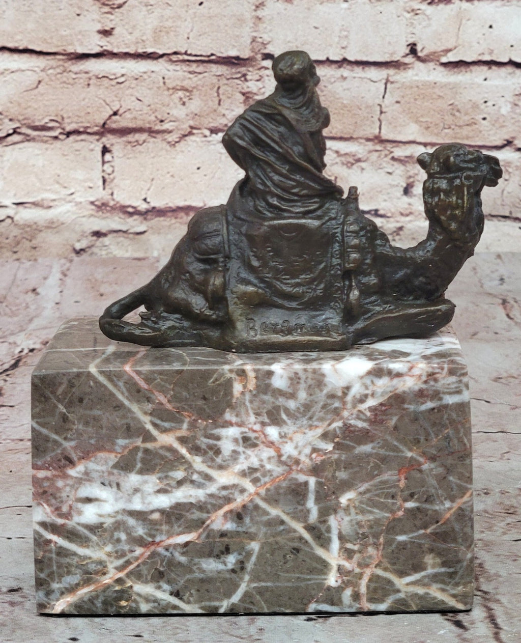 Cast using the traditional “Lost Wax Method,” this bronze sculpture boasts a rich brown patina that enhances its intricate features. Mounted on a marble base, it stands as a testament to artisanal skill and dedication. Handmade and signed by the renowned artist Bergman, this piece is not just a sculpture but a story frozen in time, celebrating the timeless bond between a man and his camel.