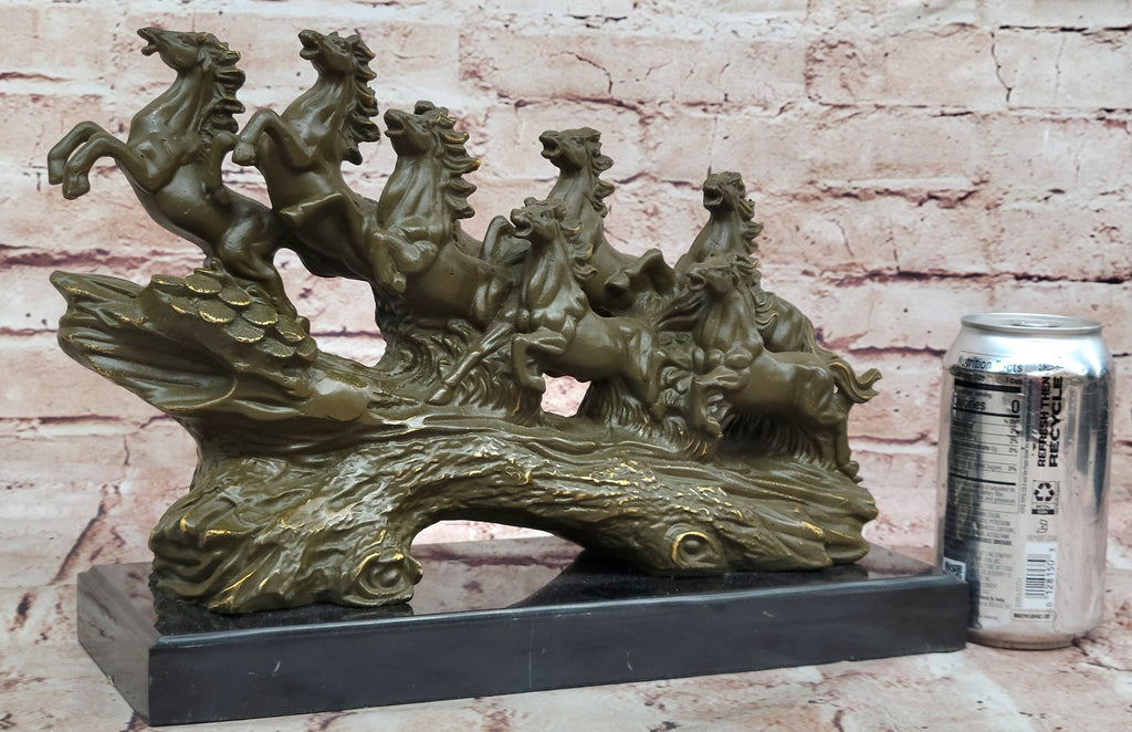 Expertly handmade using the lost wax method, this sculpture is cast in 100% genuine bronze with a rich brown patina that enhances the muscular details and dynamic movement of each horse. The piece is elegantly mounted on a polished black marble base, giving it a timeless and stately presence.