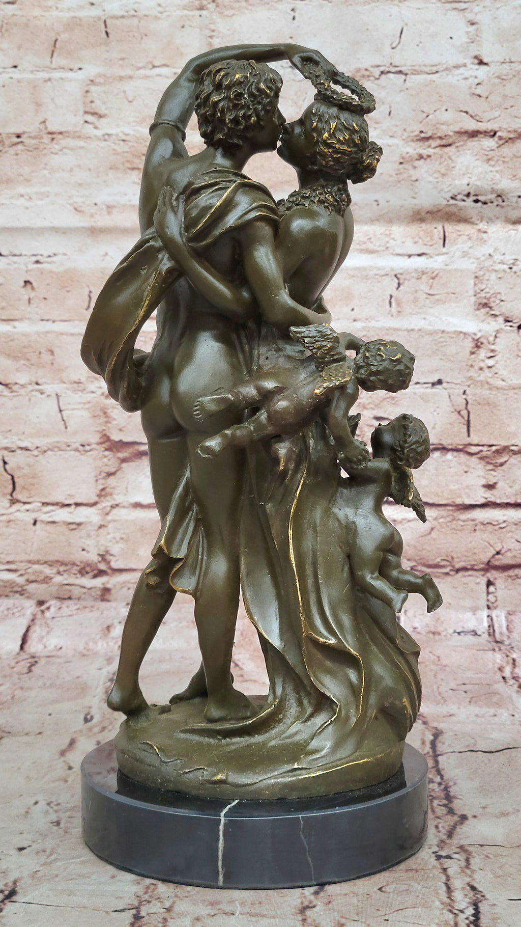 Handcrafted using the meticulous lost wax casting method, the sculpture is made of 100% genuine bronze and finished in a rich brown patina that highlights every intricate detail—from the soft curls of the angel’s hair to the gentle folds of the flowing garments. The round black marble base not only provides elegant contrast and support but also enhances the sculpture's visual presence. Each curve and contour is brought to life with careful craftsmanship, resulting in a truly museum-quality piece.