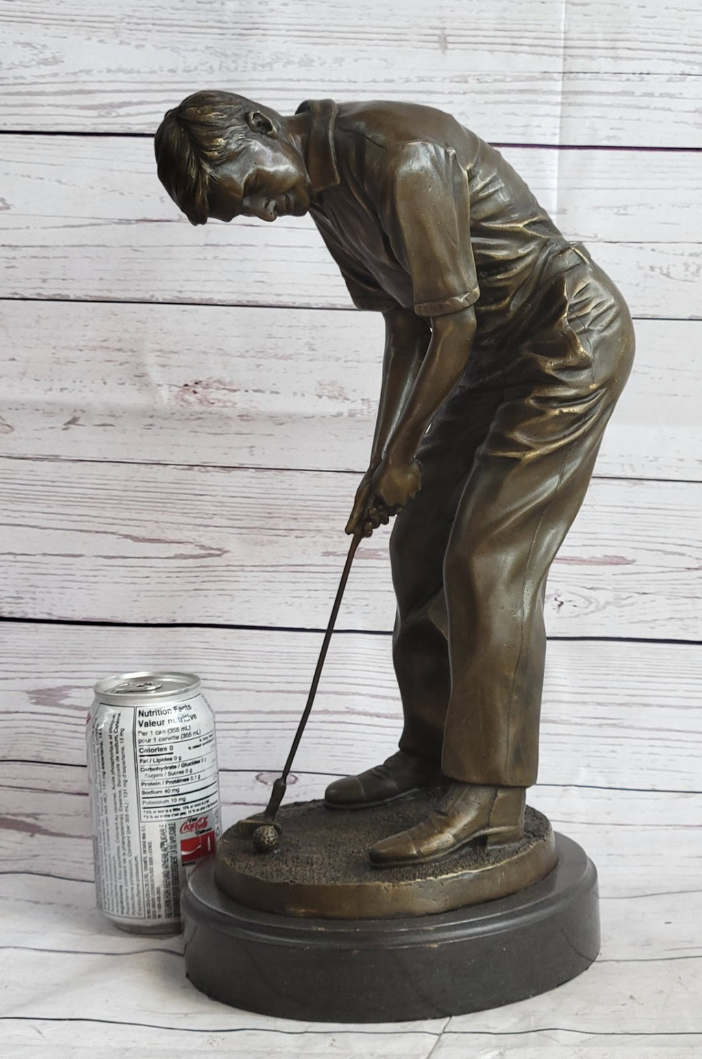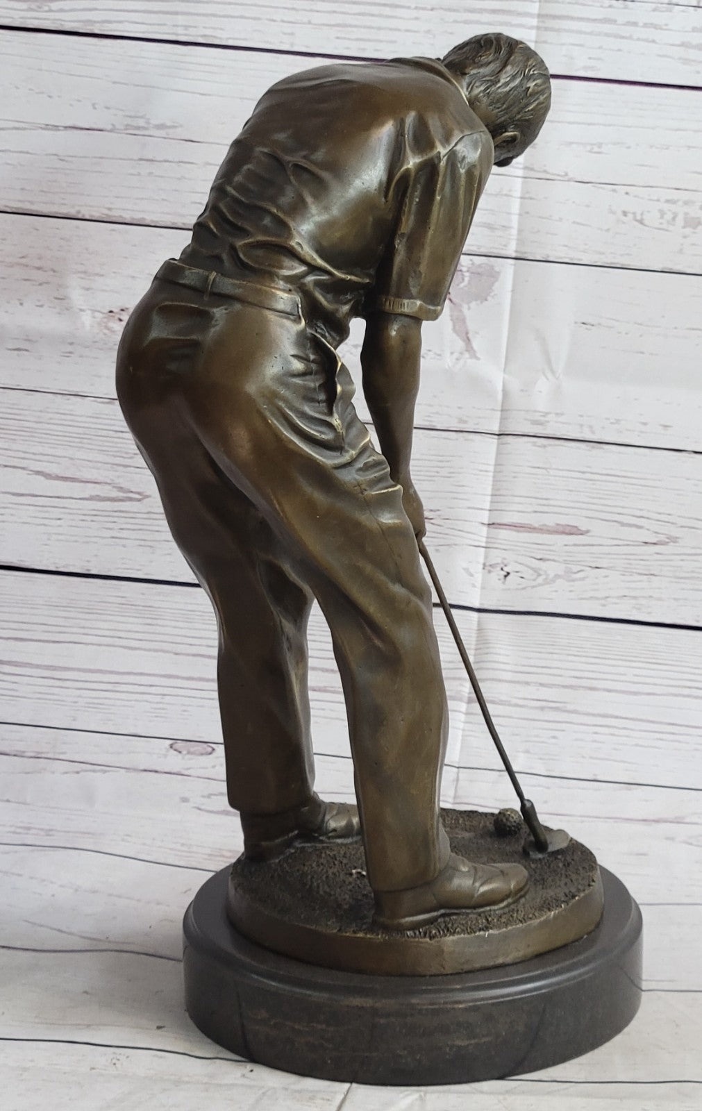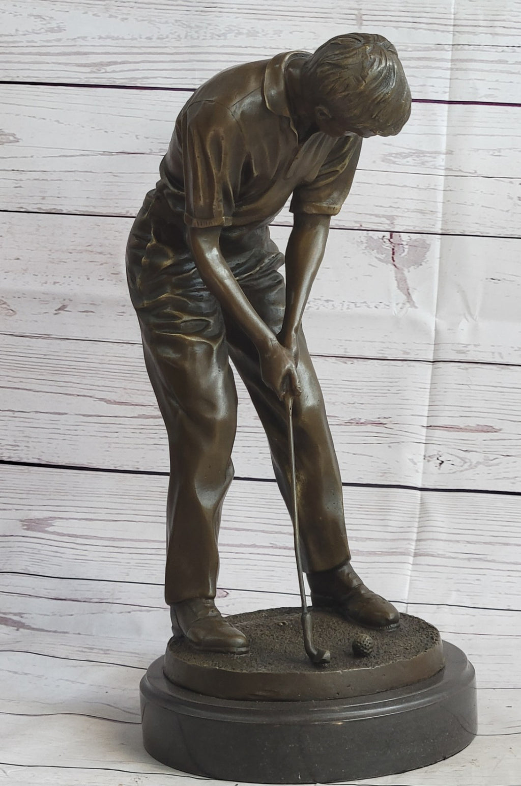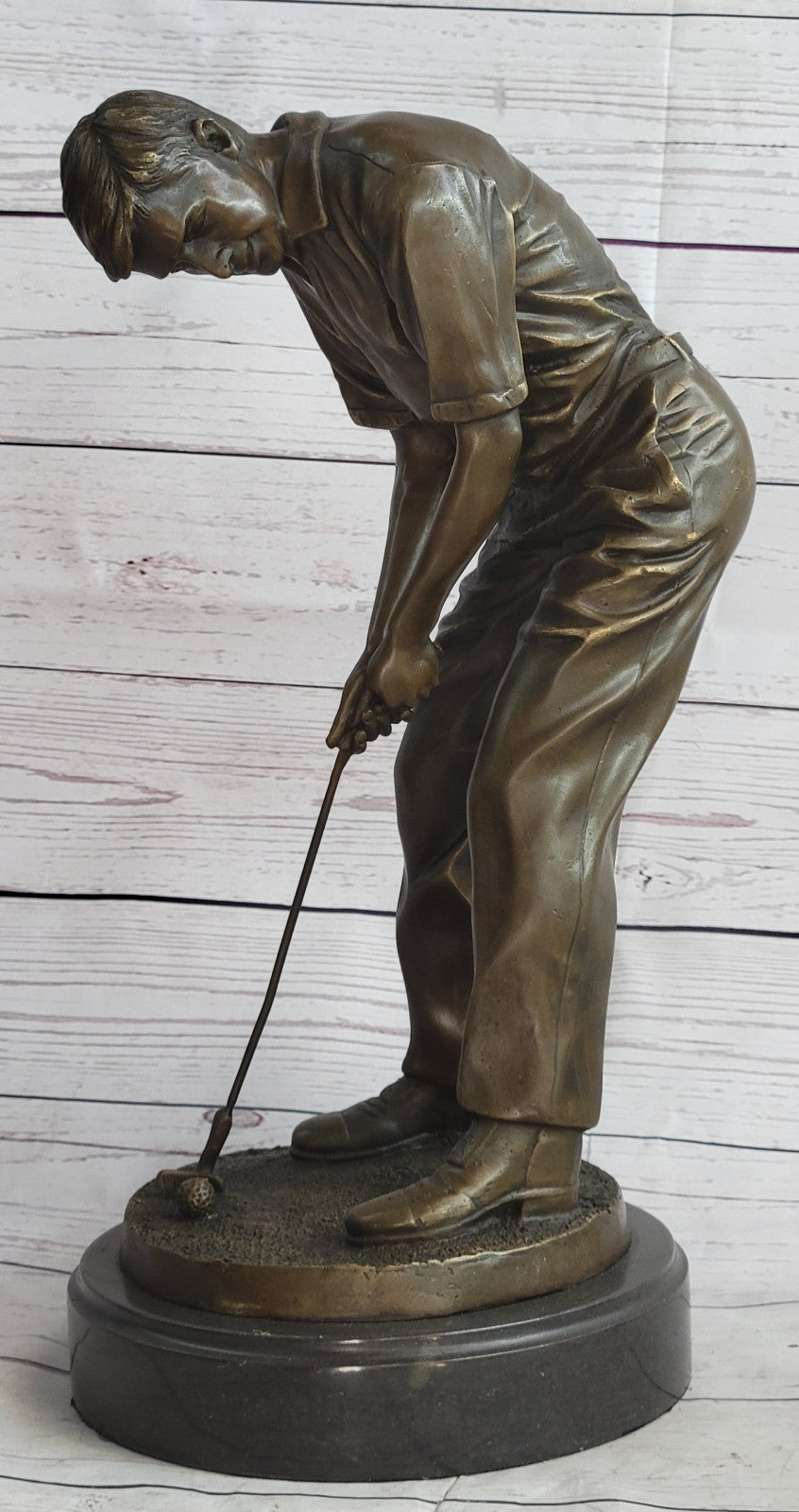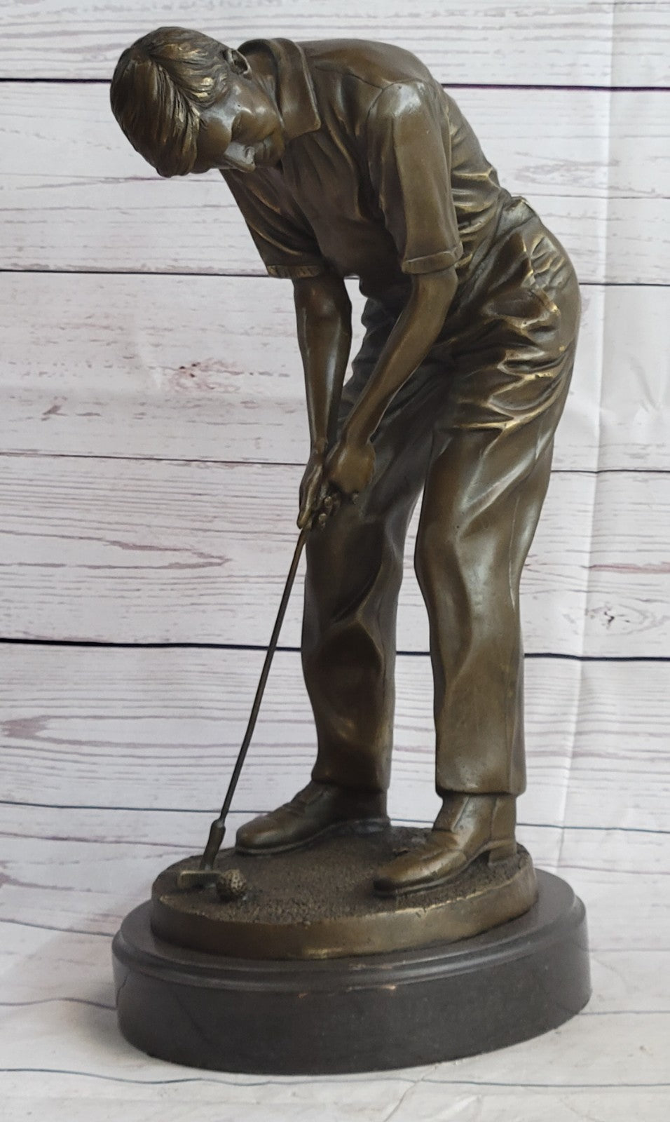 Crafted with meticulous detail and skill using the "Lost Wax Method," this original bronze sculpture radiates authenticity and craftsmanship. Enhanced by a brown patina with shading that accentuates the movement of his clothes, the sculpture is mounted on a marble base, adding to its elegance and sophistication. Signed by artist Milo, it stands as a timeless tribute to the dedication and passion of golfers everywhere.