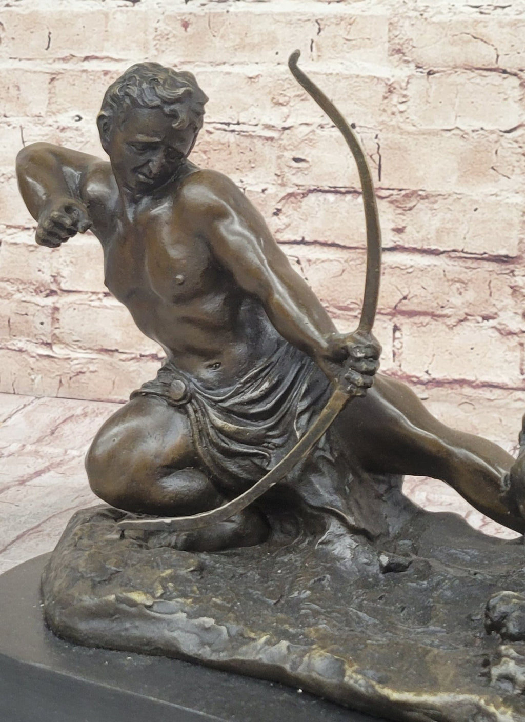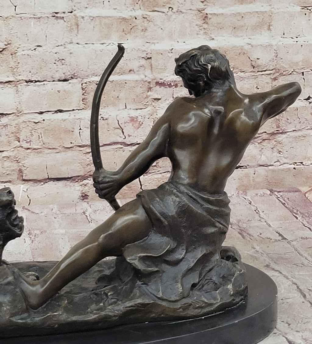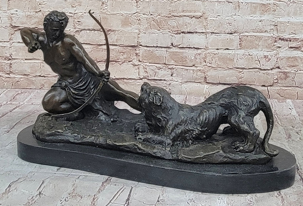Crafted with meticulous care, this handmade bronze sculpture showcases the artistry of the lost-wax casting method. The intricate details of both the man and the lion are brought to life with precision and skill. The sculpture is adorned with a rich brown patina finish, adding depth and enhancing the overall visual appeal. Mounted on a sturdy black marble base, it bears the stamp of quality from European Bronze Finery and features the signature of the renowned artist Milo, ensuring its authenticity and artistic value.