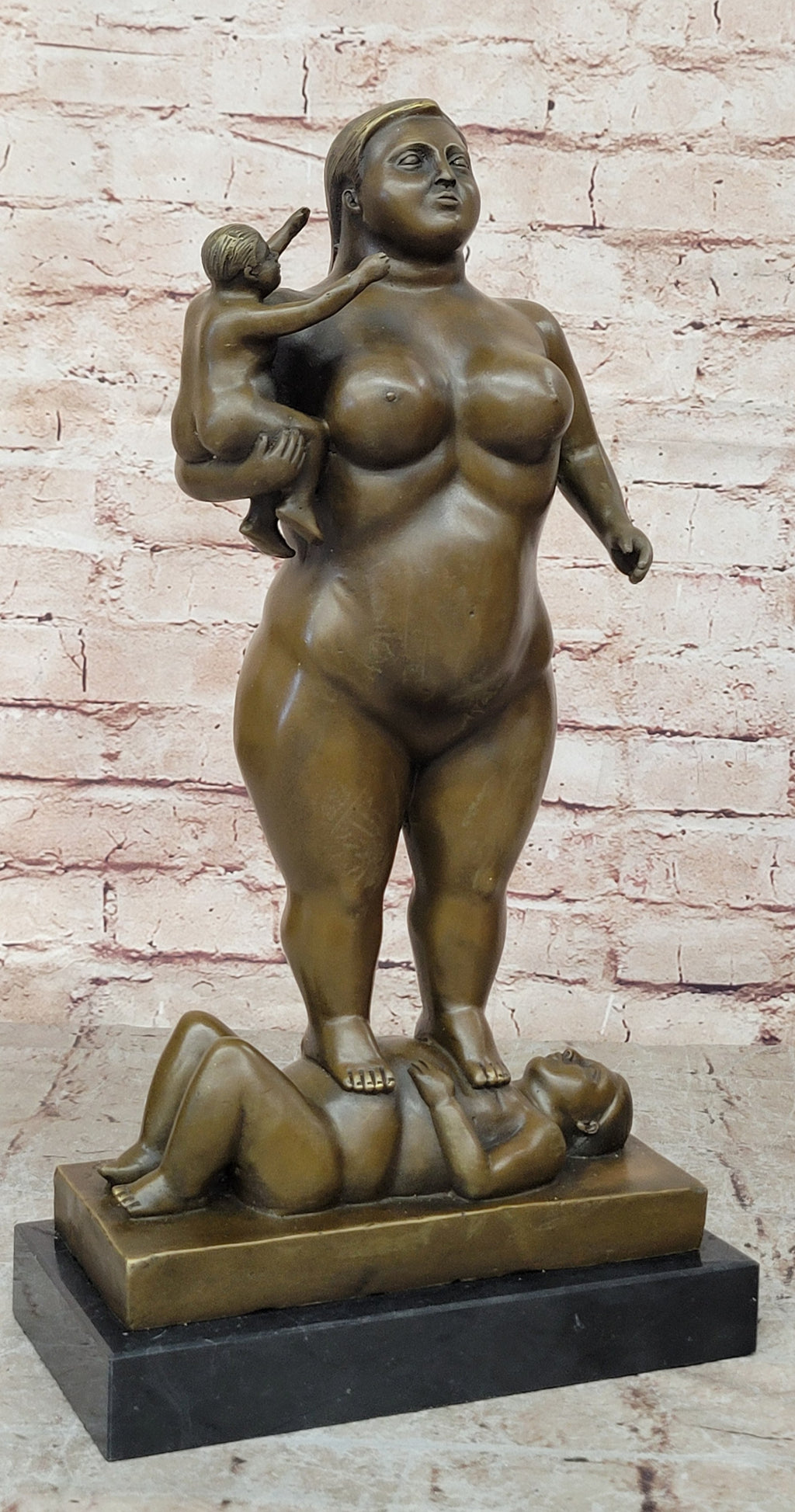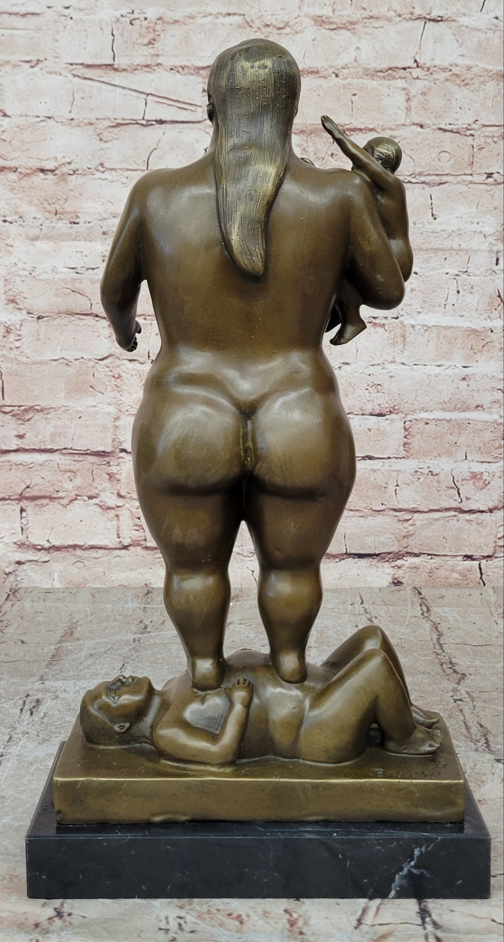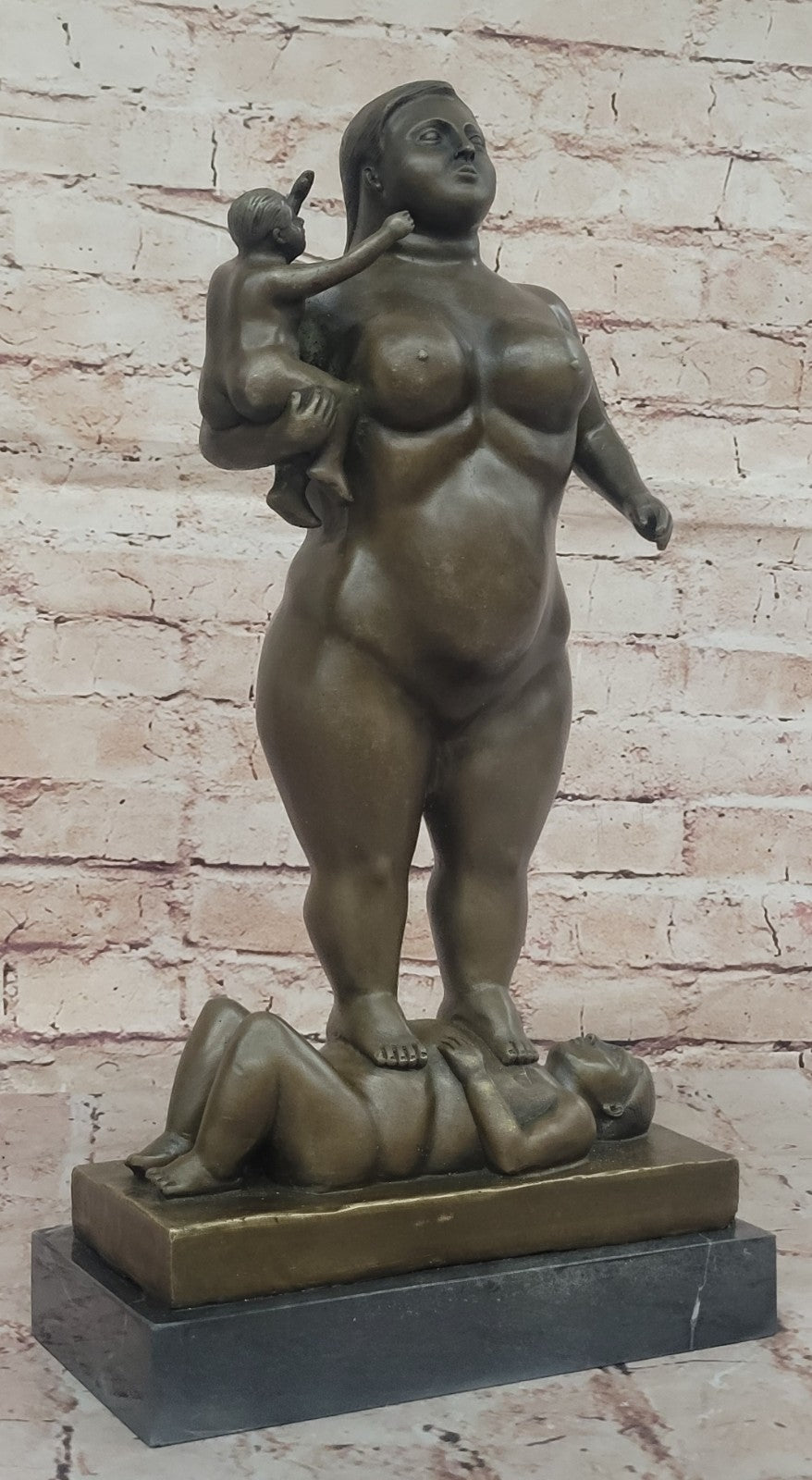 The sculpture's unique composition highlights the mother's substantial size in comparison to both her infant, cradled lovingly in her strong arm, and her husband, who forms the base upon which she stands. This juxtaposition of sizes adds depth and complexity to the piece, offering an engaging narrative that resonates with viewers. Created through the time-honored lost wax casting method, the sculpture is endowed with exquisite detail and texture, while the brown patina finish preserves its enduring beauty. It is elegantly mounted on a black marble base, bearing the artist Botero's signature, further enhancing its quality and value.