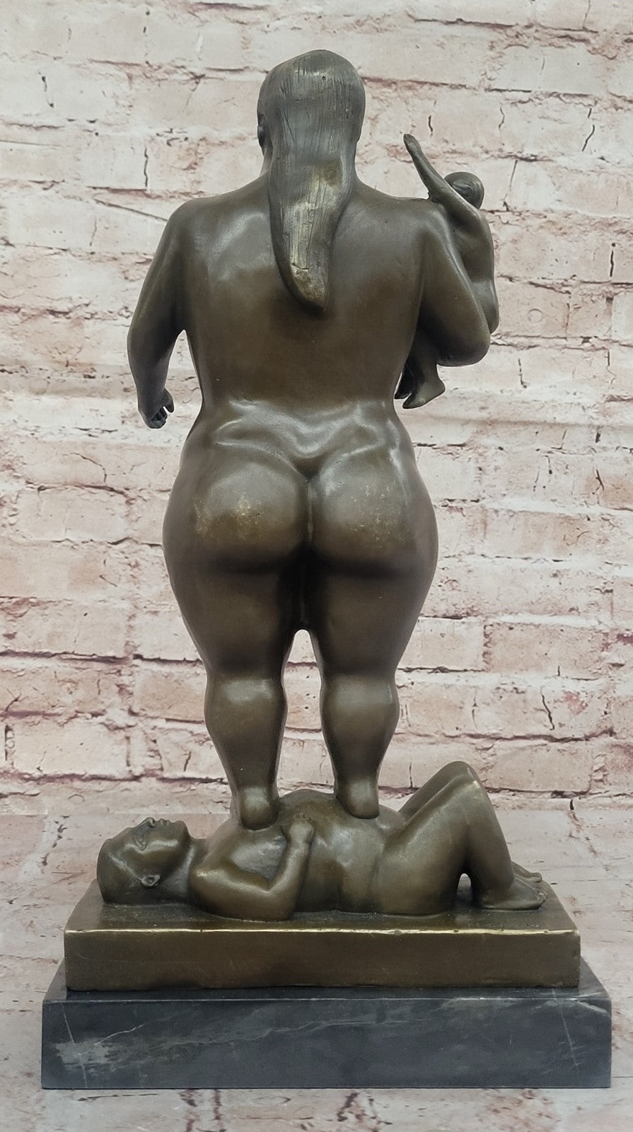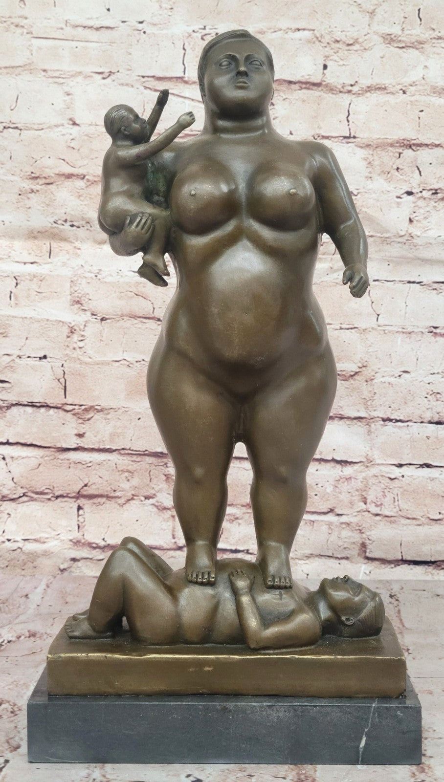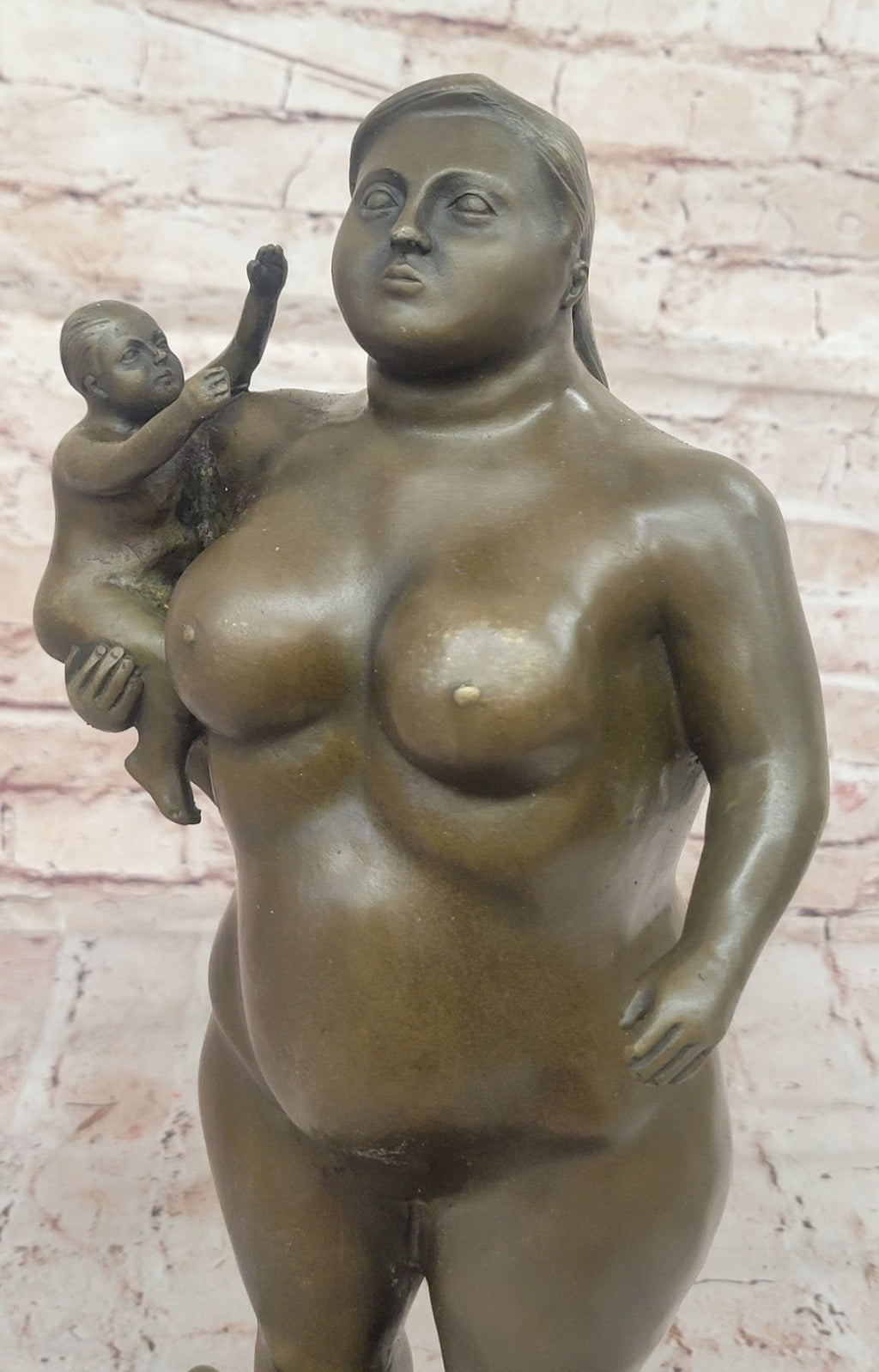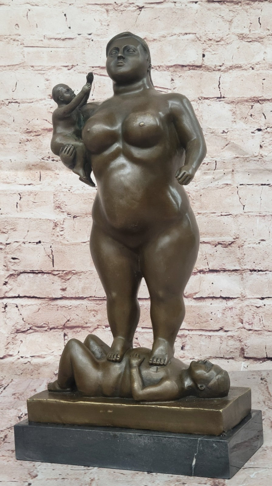 The sculpture's unique composition highlights the mother's substantial size in comparison to both her infant, cradled lovingly in her strong arm, and her husband, who forms the base upon which she stands. This juxtaposition of sizes adds depth and complexity to the piece, offering an engaging narrative that resonates with viewers. Created through the time-honored lost wax casting method, the sculpture is endowed with exquisite detail and texture, while the brown patina finish preserves its enduring beauty. It is elegantly mounted on a black marble base, bearing the artist Botero's signature, further enhancing its quality and value.