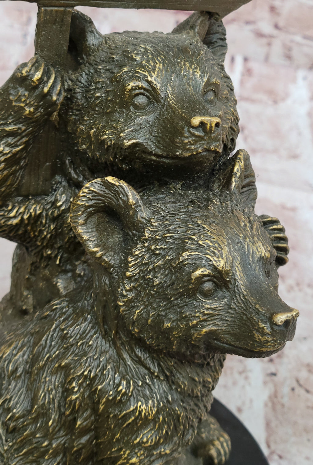Finished in a striking two-tone brown patina, the sculpture beautifully blends rich, natural bronze hues with a timeless vintage appeal. The contrasting finish highlights the delicate features of the bears while enhancing the overall aesthetic, creating a dynamic interplay of light and shadow that draws the viewer’s eye.