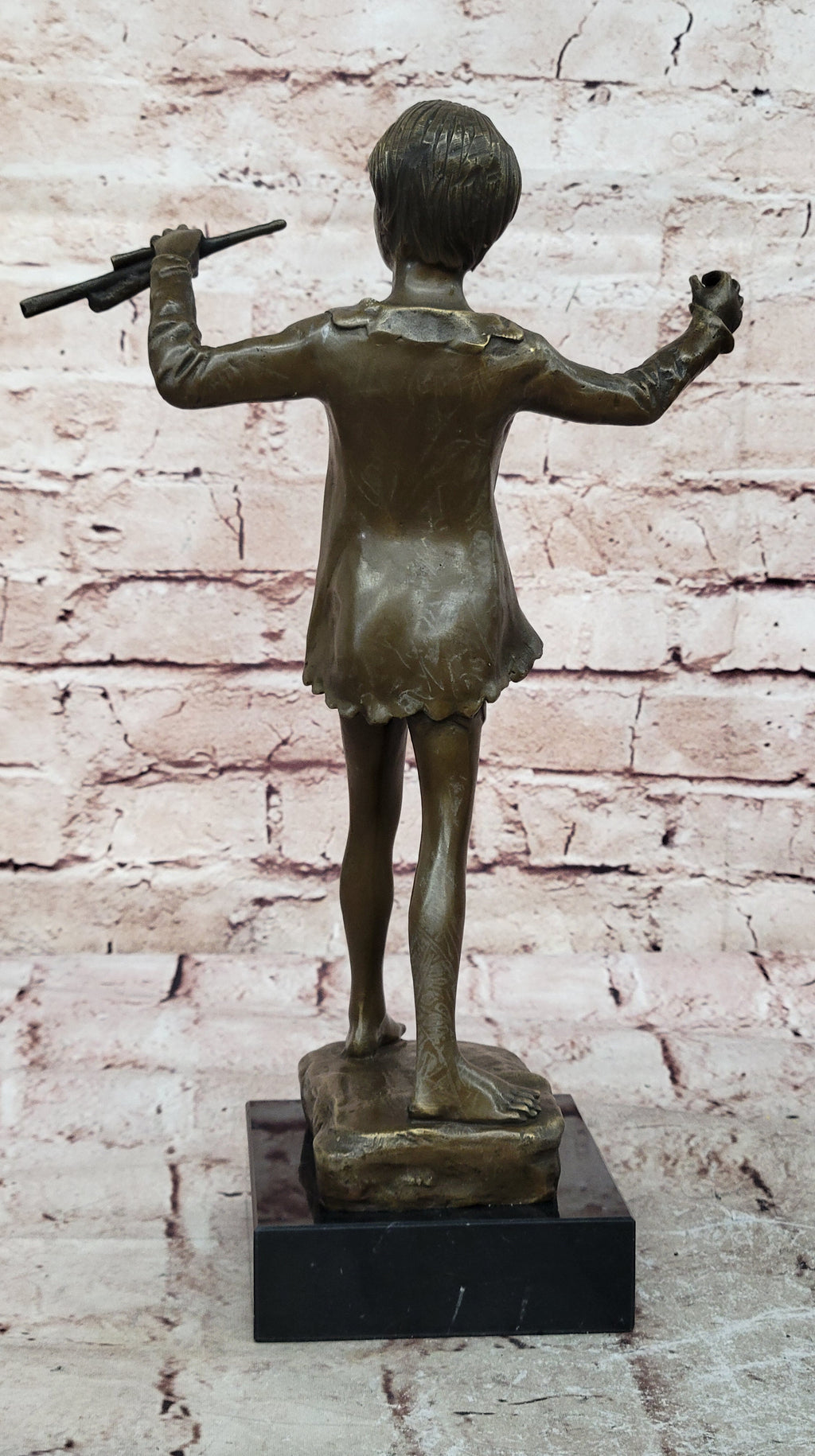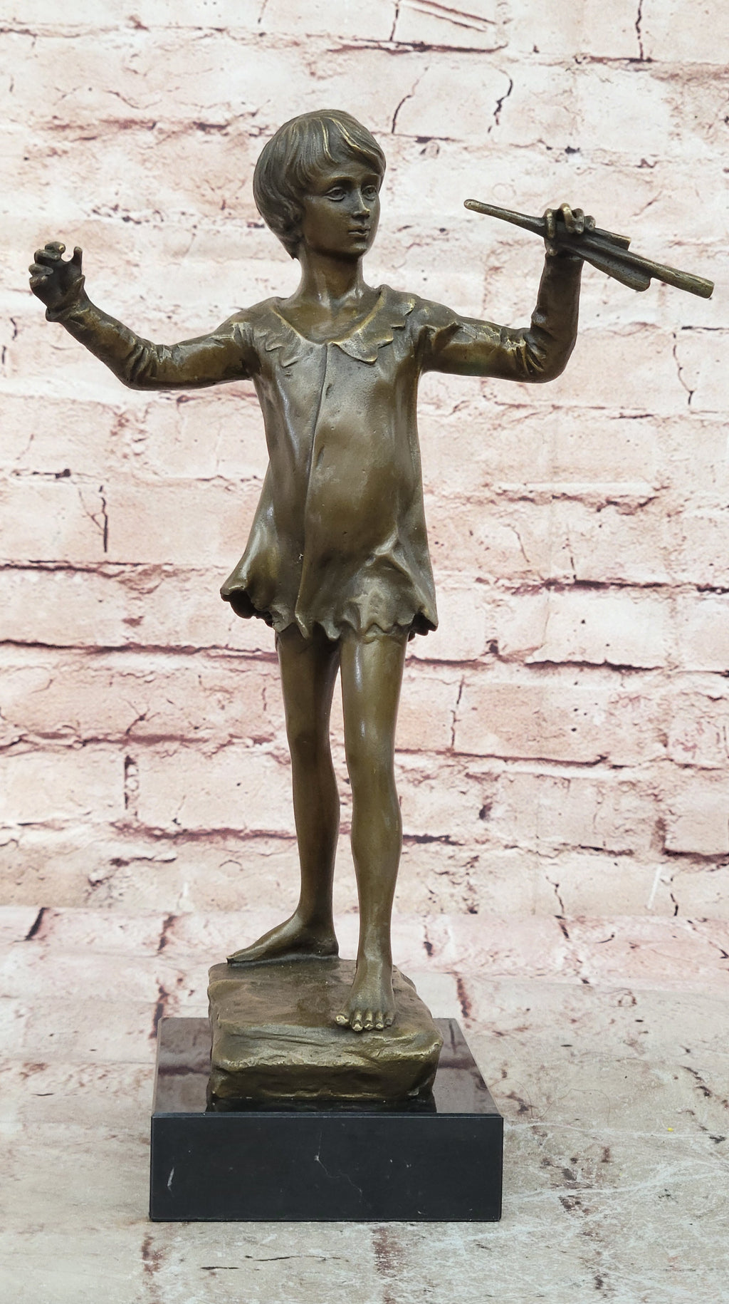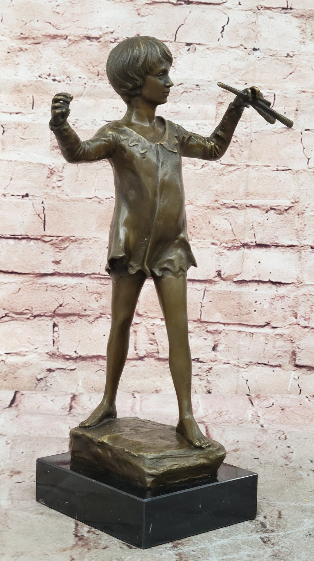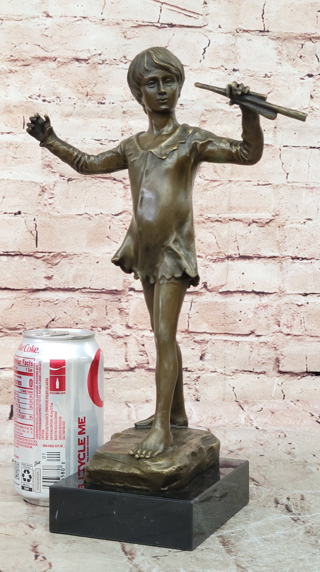 This charming bronze statue of a boy playing the flute brings a delightful touch of whimsy and joy to any environment. The young musician is depicted standing with his feet apart, fully immersed in the music he's creating with his instrument. Dressed in a simple uniform, the boy radiates a quaint, nostalgic charm that evokes a sense of innocence and wonder. The detailed craftsmanship highlights the carefree spirit of childhood, making this piece a captivating focal point in any setting.