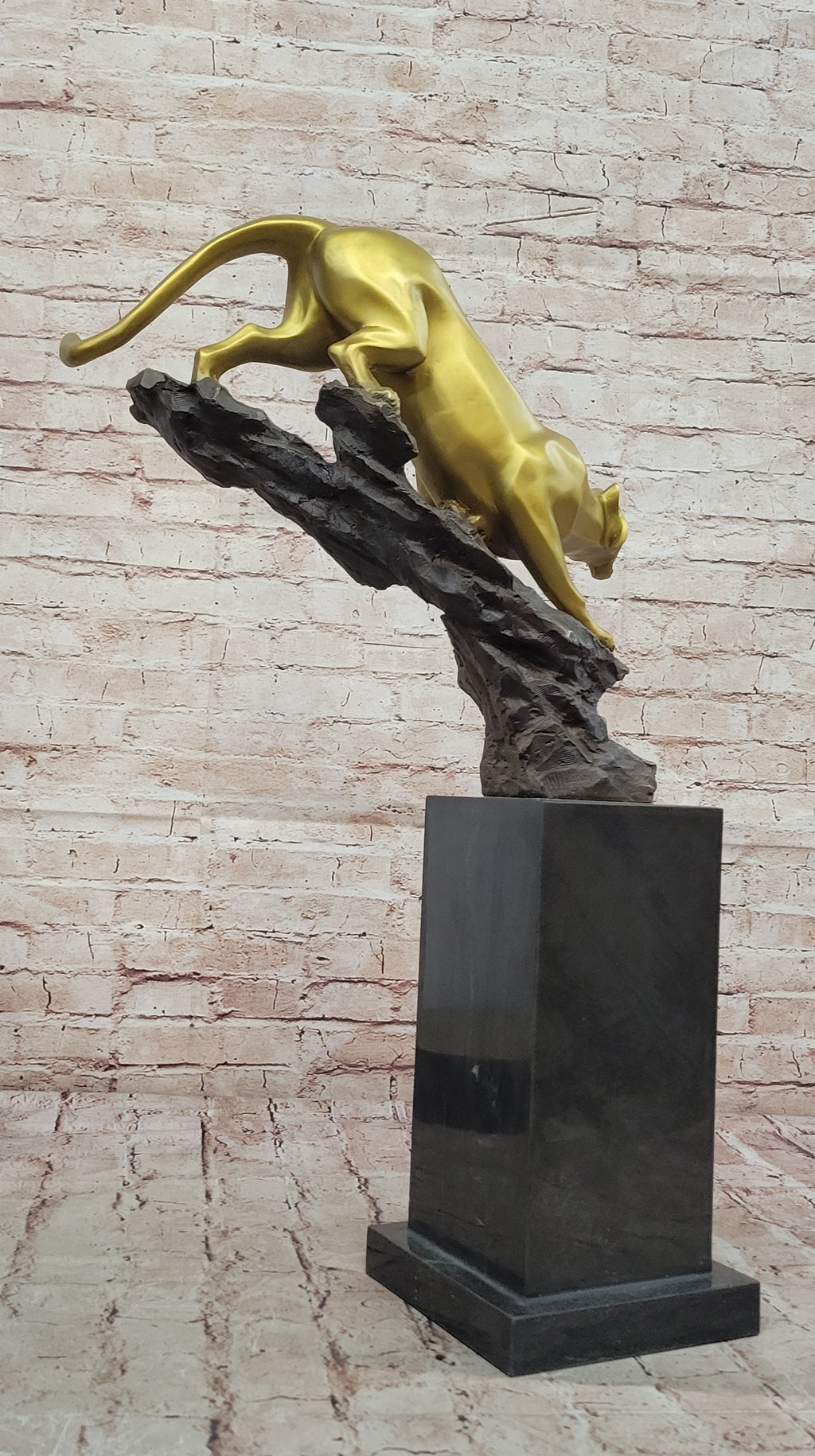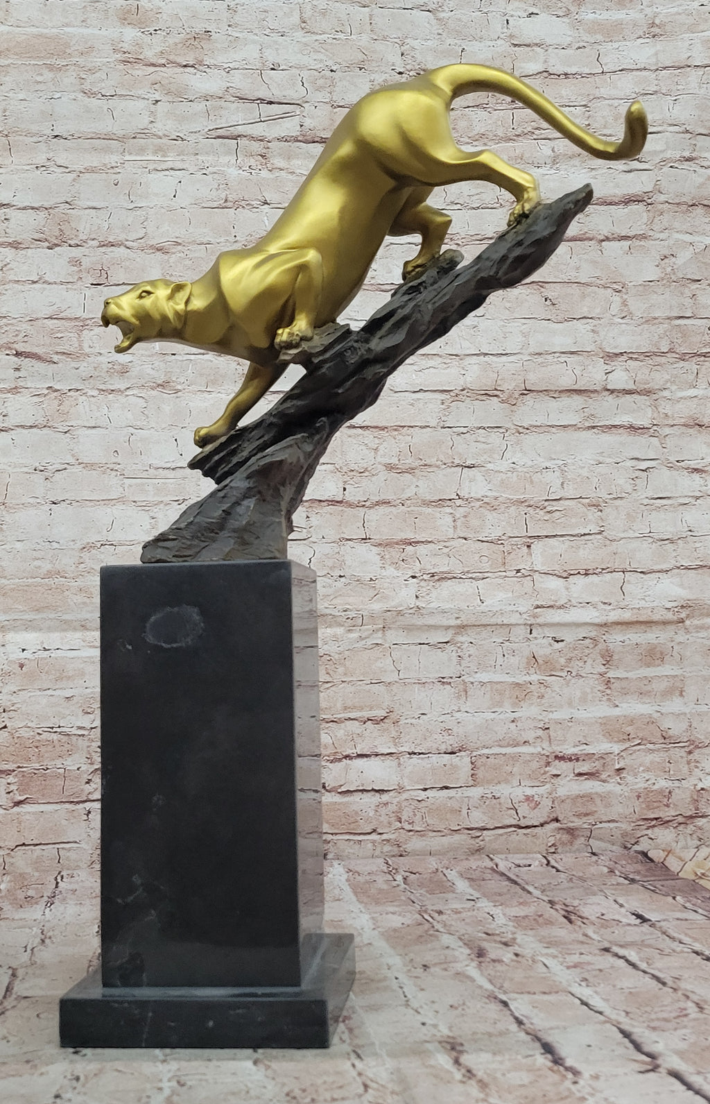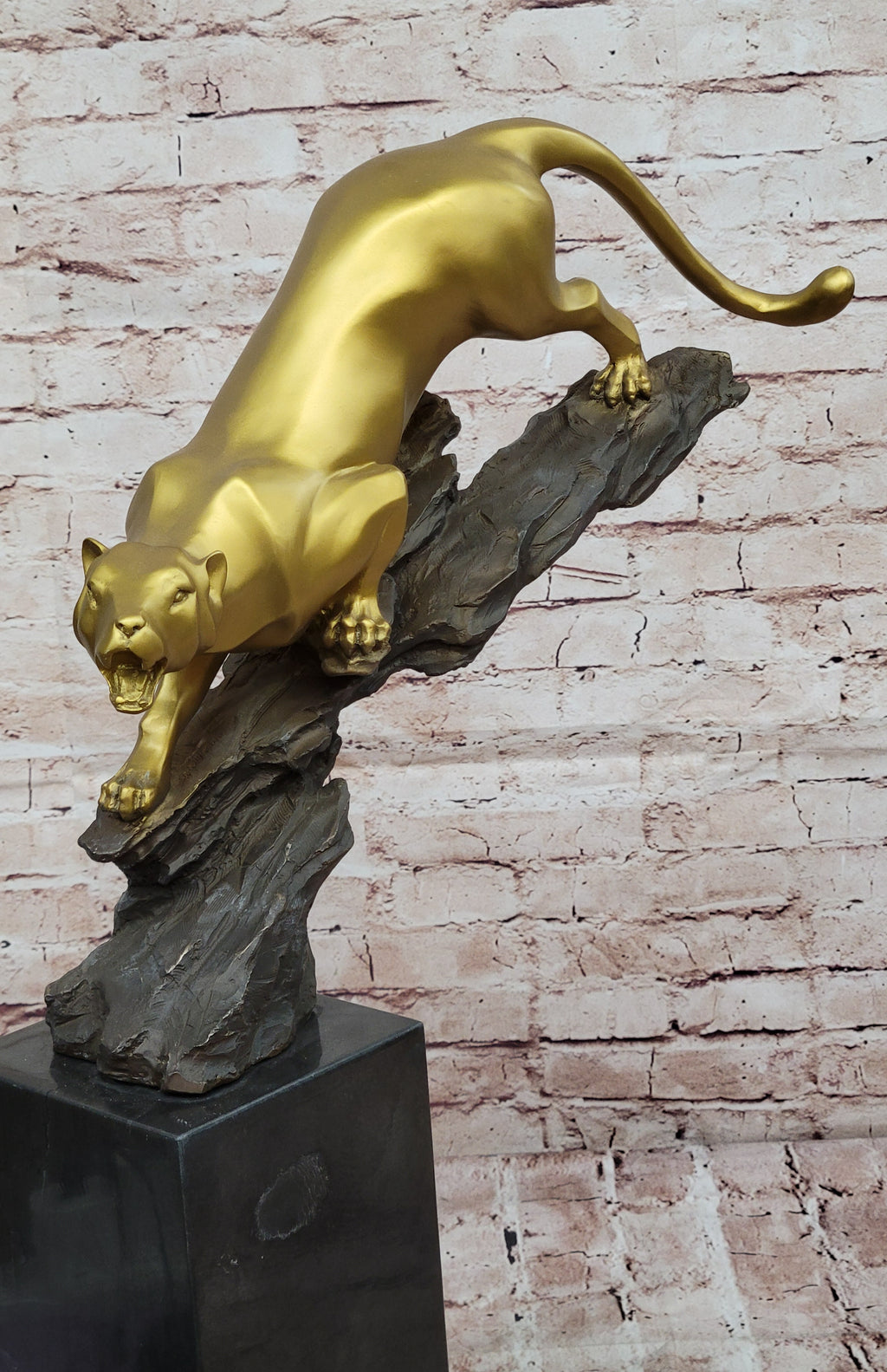 Expertly handcrafted using the time-honored lost wax method, this genuine bronze sculpture features a striking two-tone gold and brown patina, emphasizing the animal’s elegant form and highlighting its powerful anatomy. The dynamic figure rests securely on a substantial black marble base, lending weight, contrast, and grandeur to the overall presence of the piece.