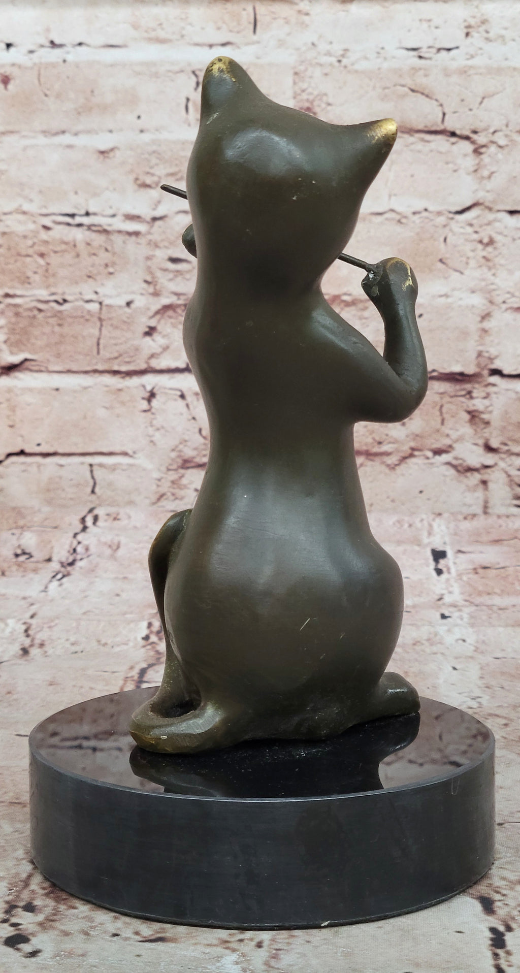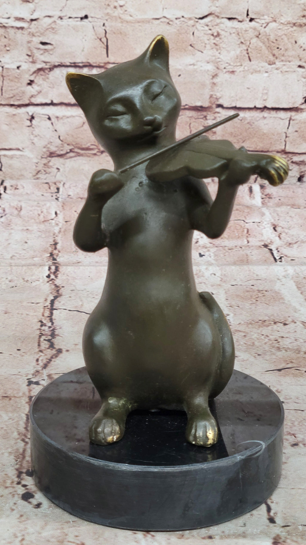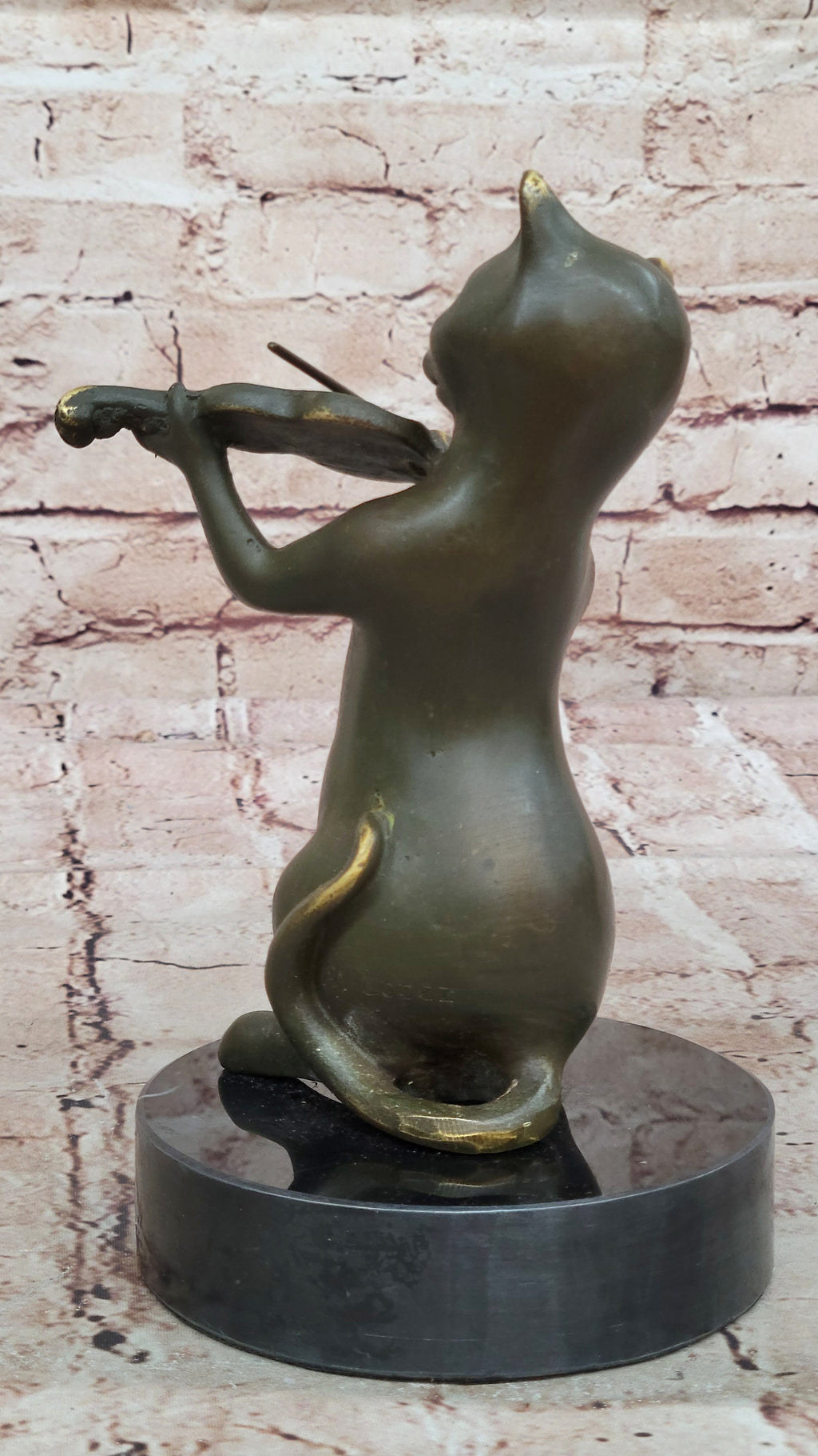 Cast using the traditional lost wax method, the sculpture is made from 100% genuine bronze and finished with a rich dark brown patina that enhances the fine details and smooth contours of the figure. The cat stands proudly atop a round black marble base, which adds elegance and stability to the composition. Every aspect—from the instrument to the cat’s delighted expression—is crafted with care and artistic precision.