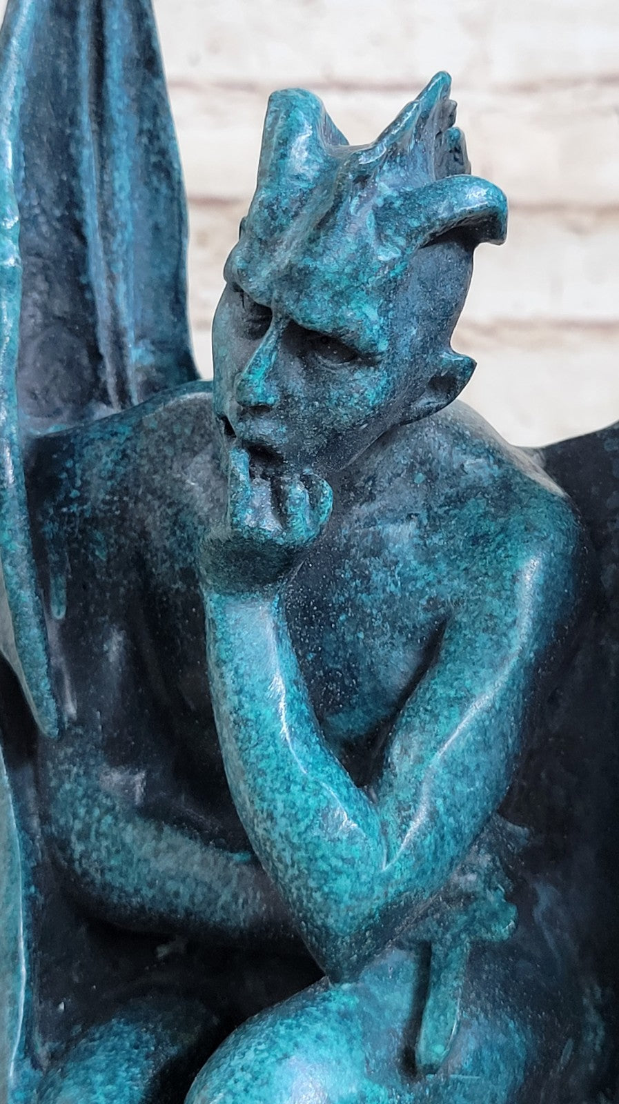 Crafted with meticulous precision and artistry using the revered lost wax method, this sculpture exhibits meticulous attention to detail. This process ensures that every intricate element, from the texture of the wings to the nuances of the devil's features, is faithfully reproduced. The result is a visually striking and thought-provoking piece enriched by its striking green patina, which imparts a captivating verdigris hue, further enhancing its allure and bestowing a touch of antiquity. This exceptional artwork proudly bears the signature of the esteemed artist Milo, confirming its authenticity and value as a collectible piece. Invite the enigmatic presence of this gargoyle devil sculpture into your collection or space, captivating viewers with its mysterious aura and stimulating contemplation of the duality of existence.