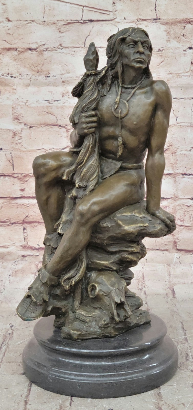 The sculpture proudly stands upon a solid dark marble base, accentuating its powerful presence. The distinguished signature "Nick" adds a personal touch and authenticity to this remarkable piece, further showcasing the artist's talent and dedication. This sculpture is an embodiment of history, honor, and the indomitable spirit of the Native American warrior.