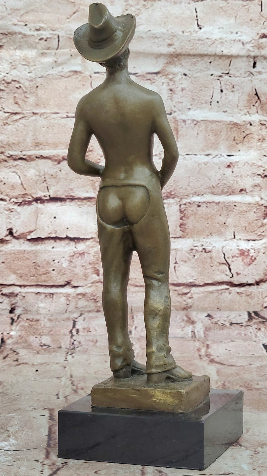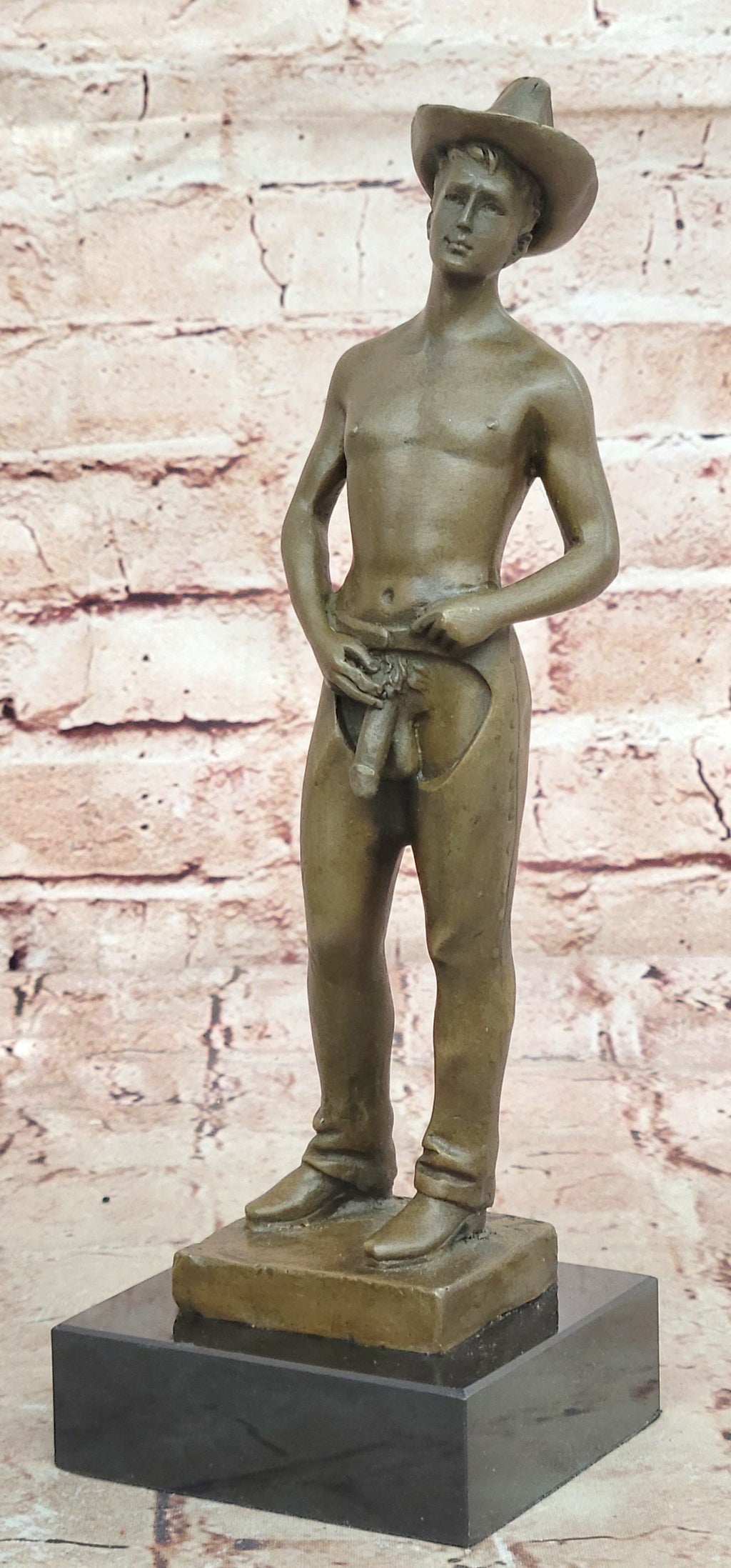 This beautifully detailed sculpture serves as a conversation piece, inviting viewers to explore the whimsical side of cowboy culture. It can be an intriguing addition to a collector's repertoire or a bold statement in a Western-themed decor.