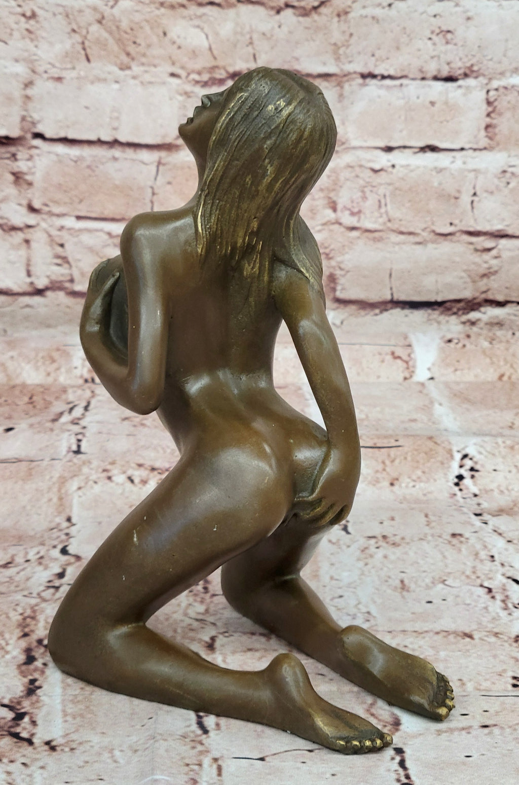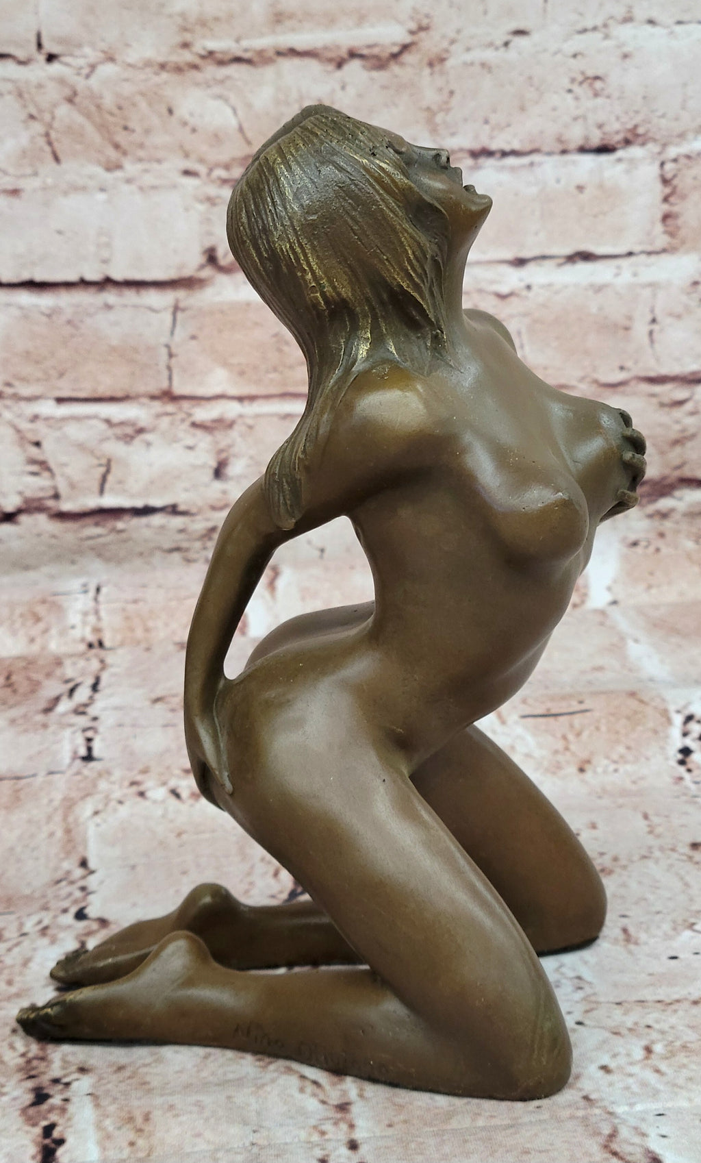 Crafted using the time-honored lost-wax casting technique, this sculpture exhibits a remarkable level of detail, from the subtle curves of the figure's body to the intricate expression of pleasure on her face. The rich brown patina finish enhances the sculpture's allure, inviting viewers to engage with the complex emotions it evokes. It proudly bears the signature of the acclaimed artist Nino Oliviono, a testament to his skill and expertise in capturing the profound beauty of human sensuality.
