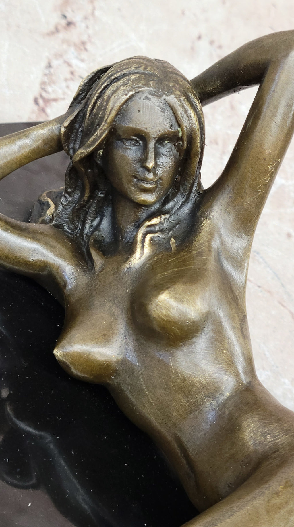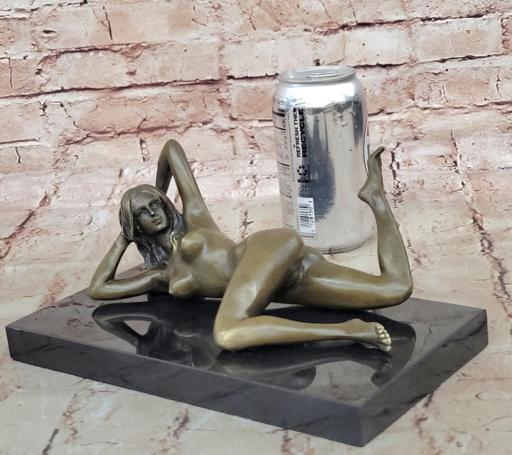 This captivating bronze sculpture portrays a nude temptress lying gracefully on the floor, her form embodying a moment of intense passion and desire. The artwork beautifully captures the essence of feminine sensuality, with the woman arching her back in a state of marked ecstasy. Her right arm reaches back, exploring the depths of her pleasure, while her face reflects a profound sense of ecstasy.